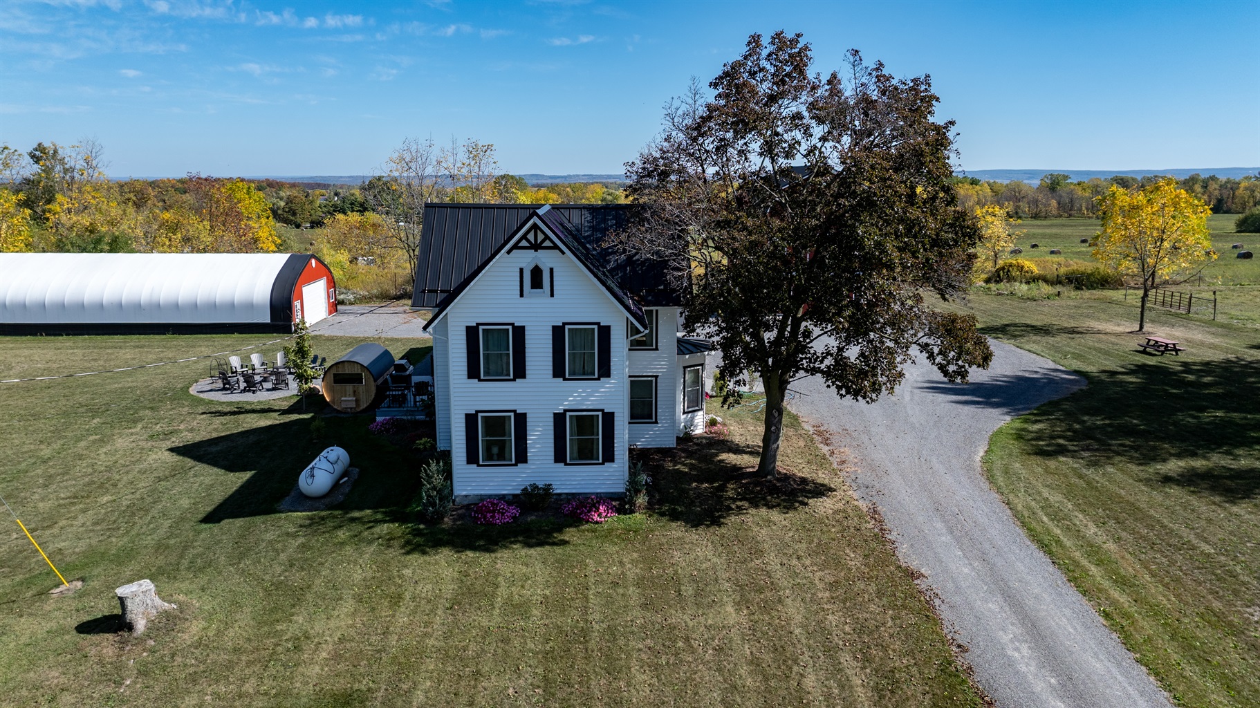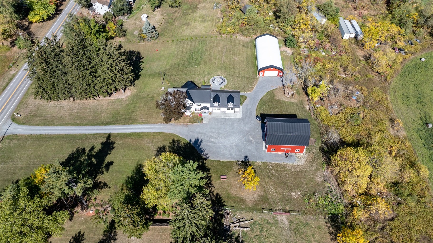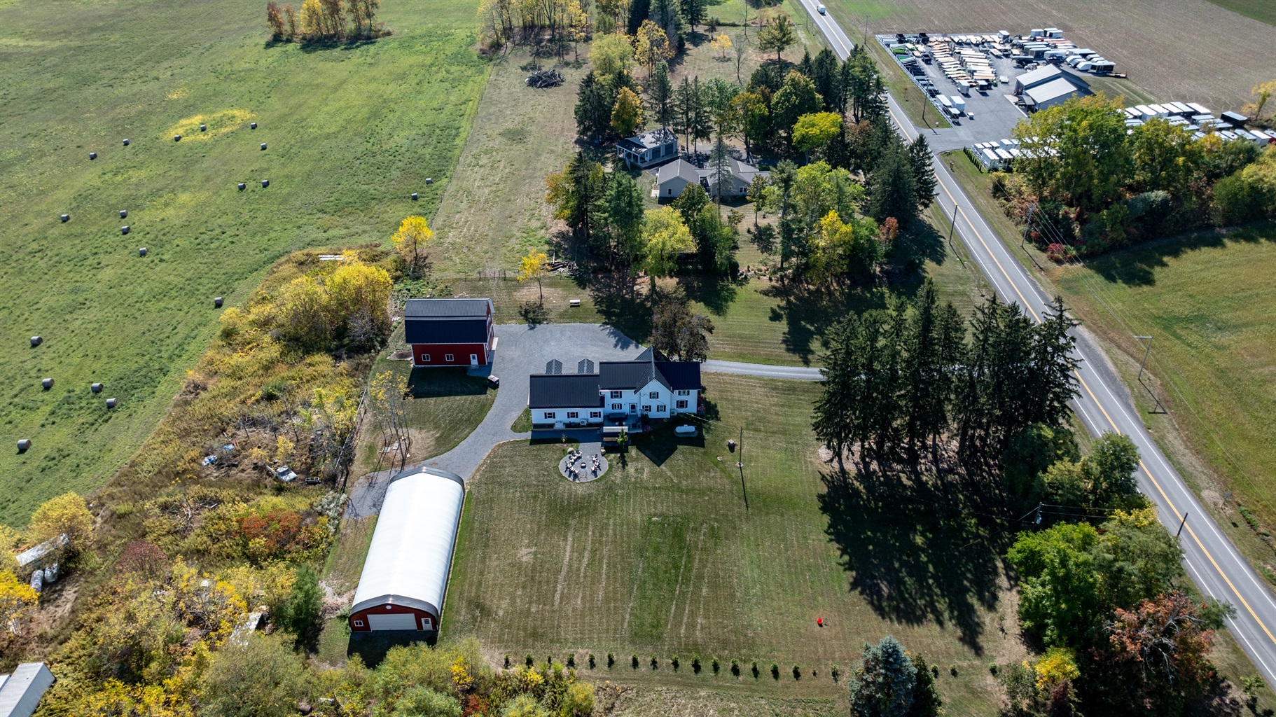 Gorgeous aerial shot highlighting the property’s large yard, barns, and scenic Finger Lakes backdrop