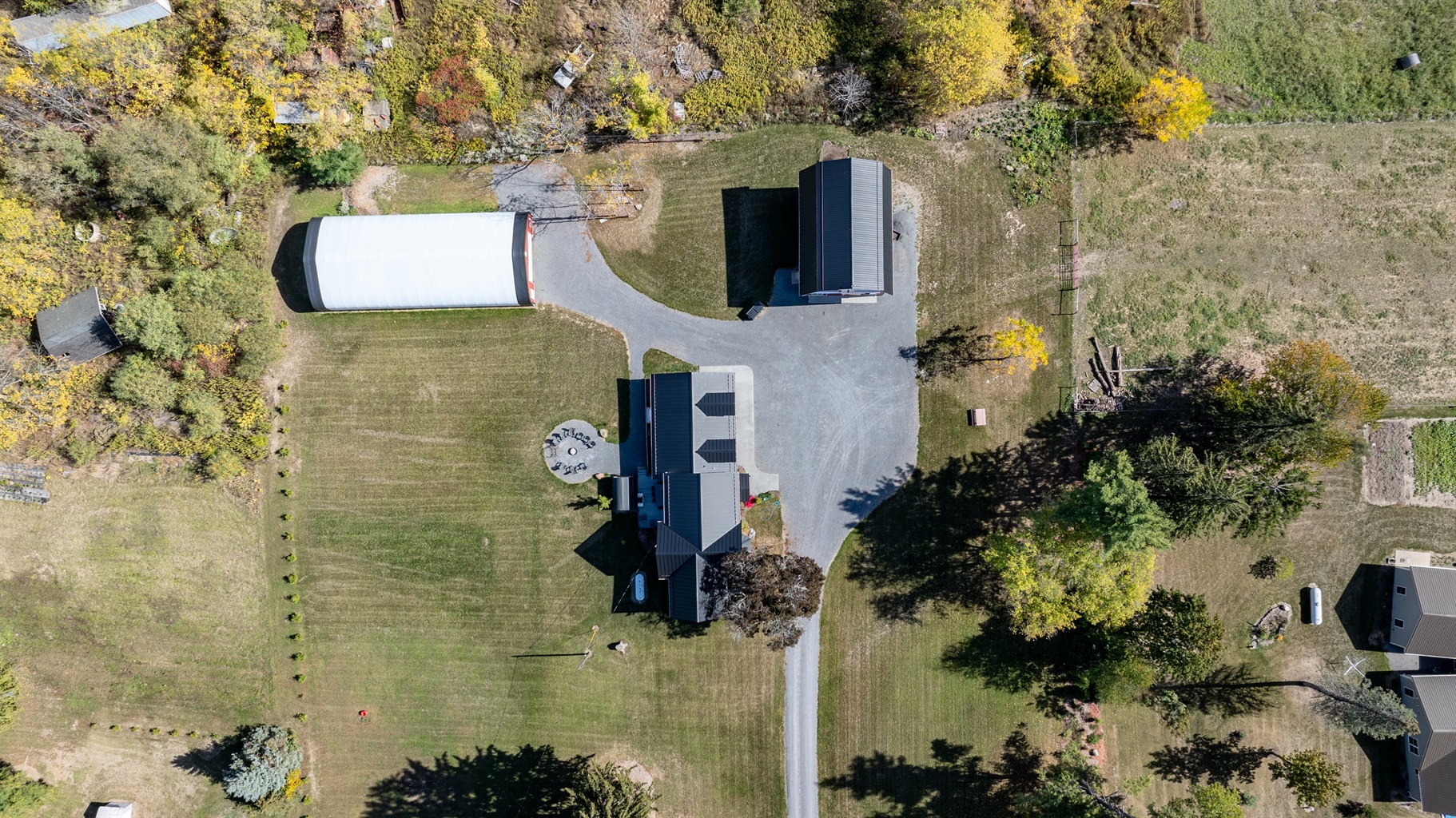 Bird’s-eye view of the peaceful property with farmhouse, barn, and open green pastures