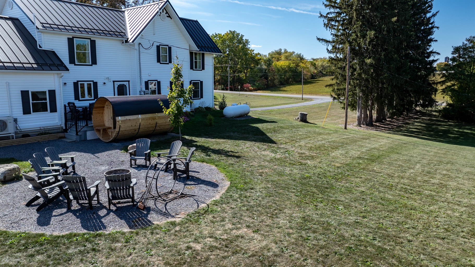 Relax under the stars beside the cozy fire pit or unwind in the private barrel sauna — pure upstate tranquility