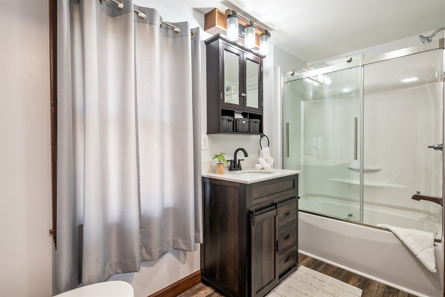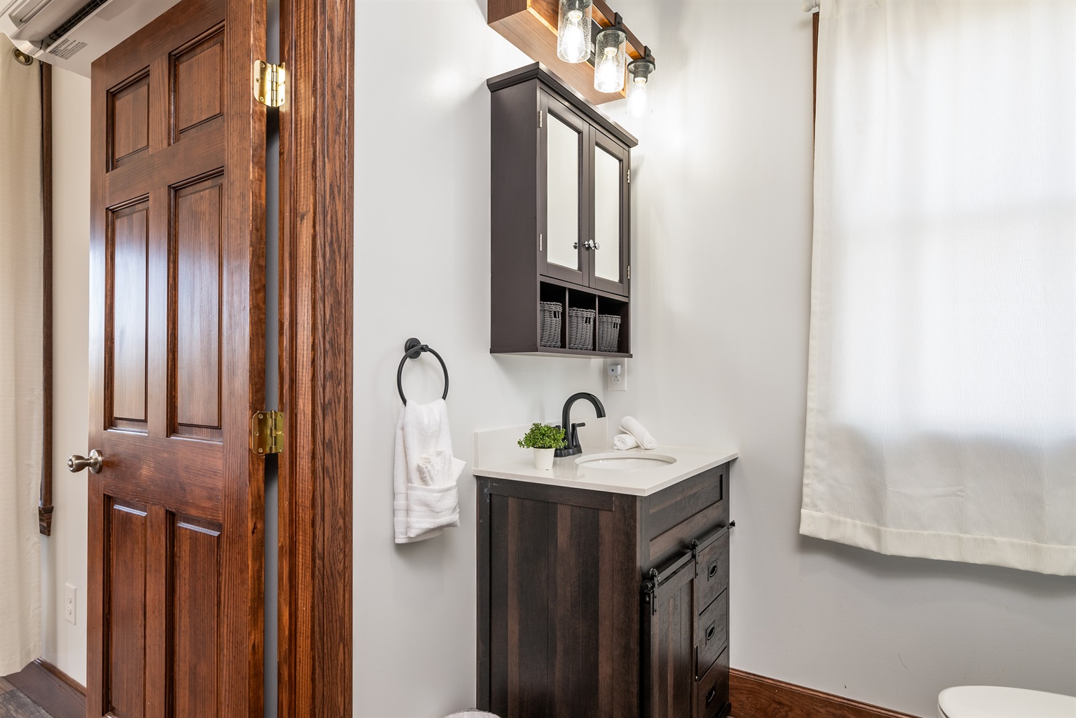 Freshly updated bath with walk-in shower and wood-trimmed charm.
