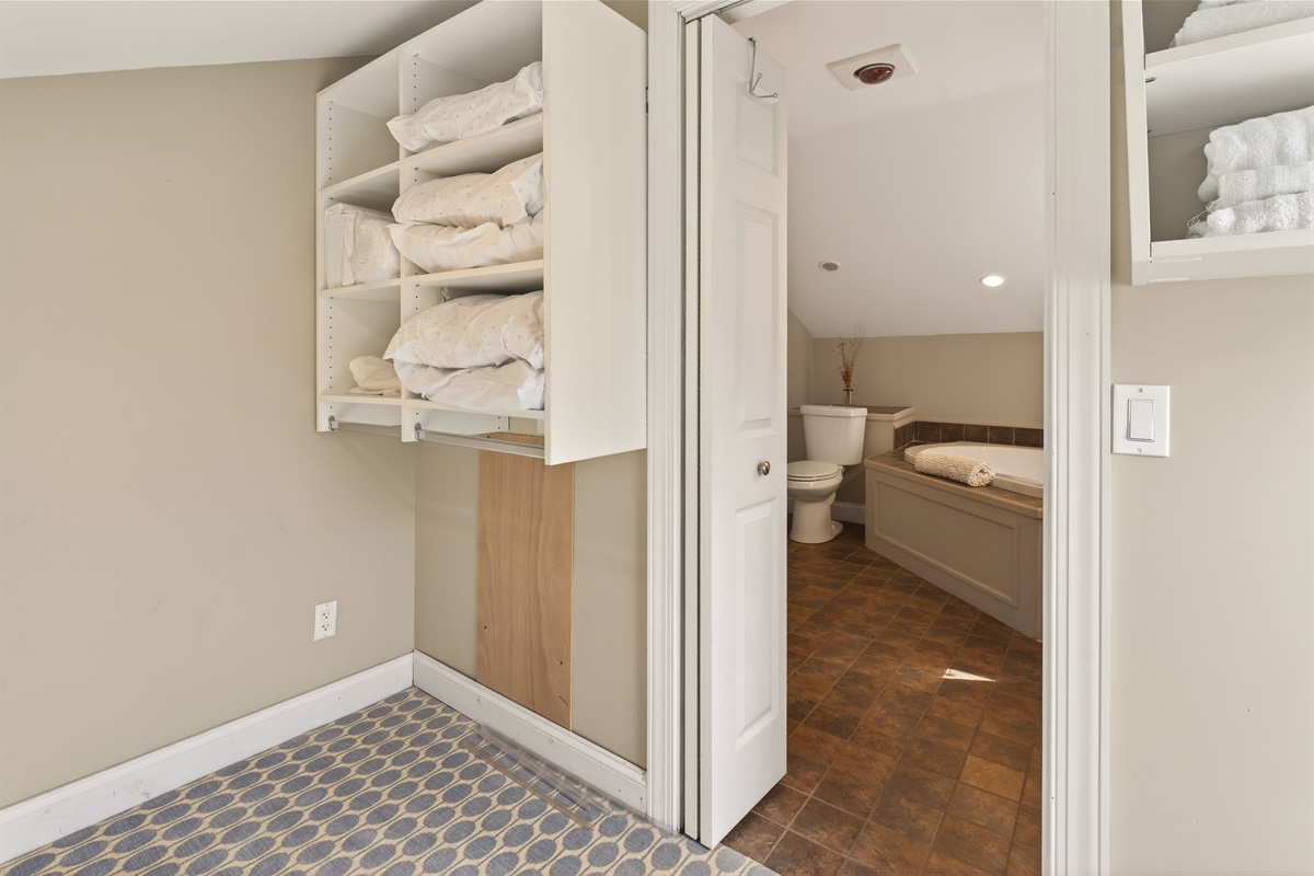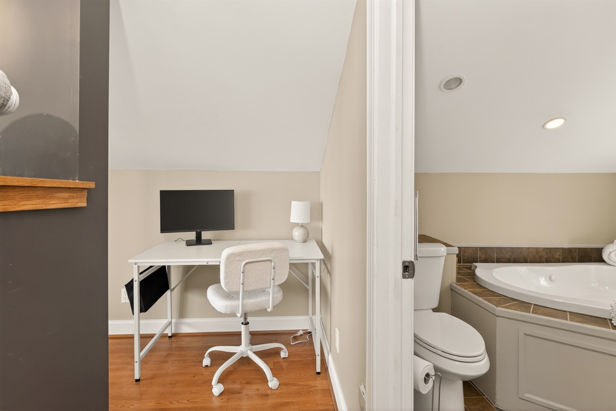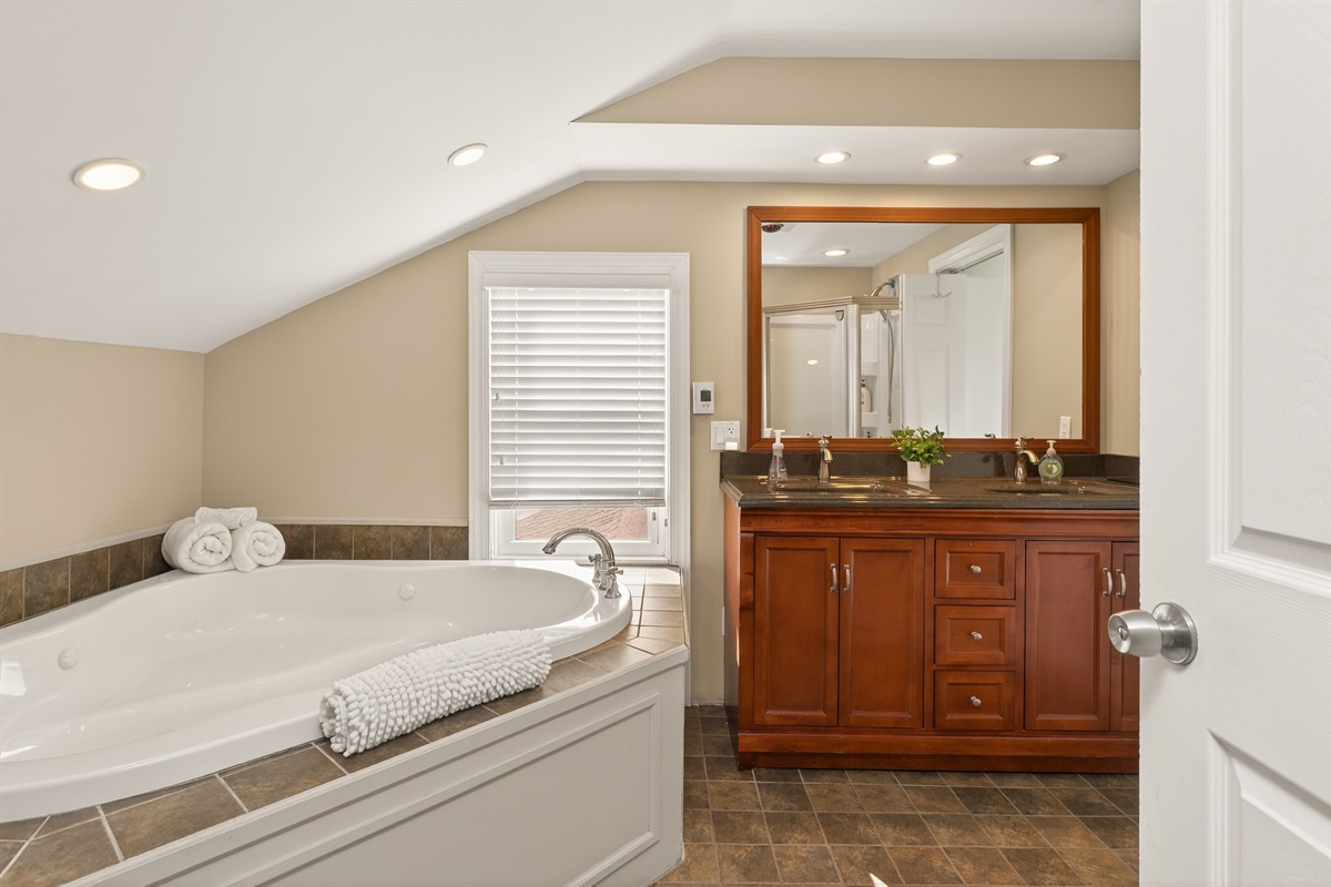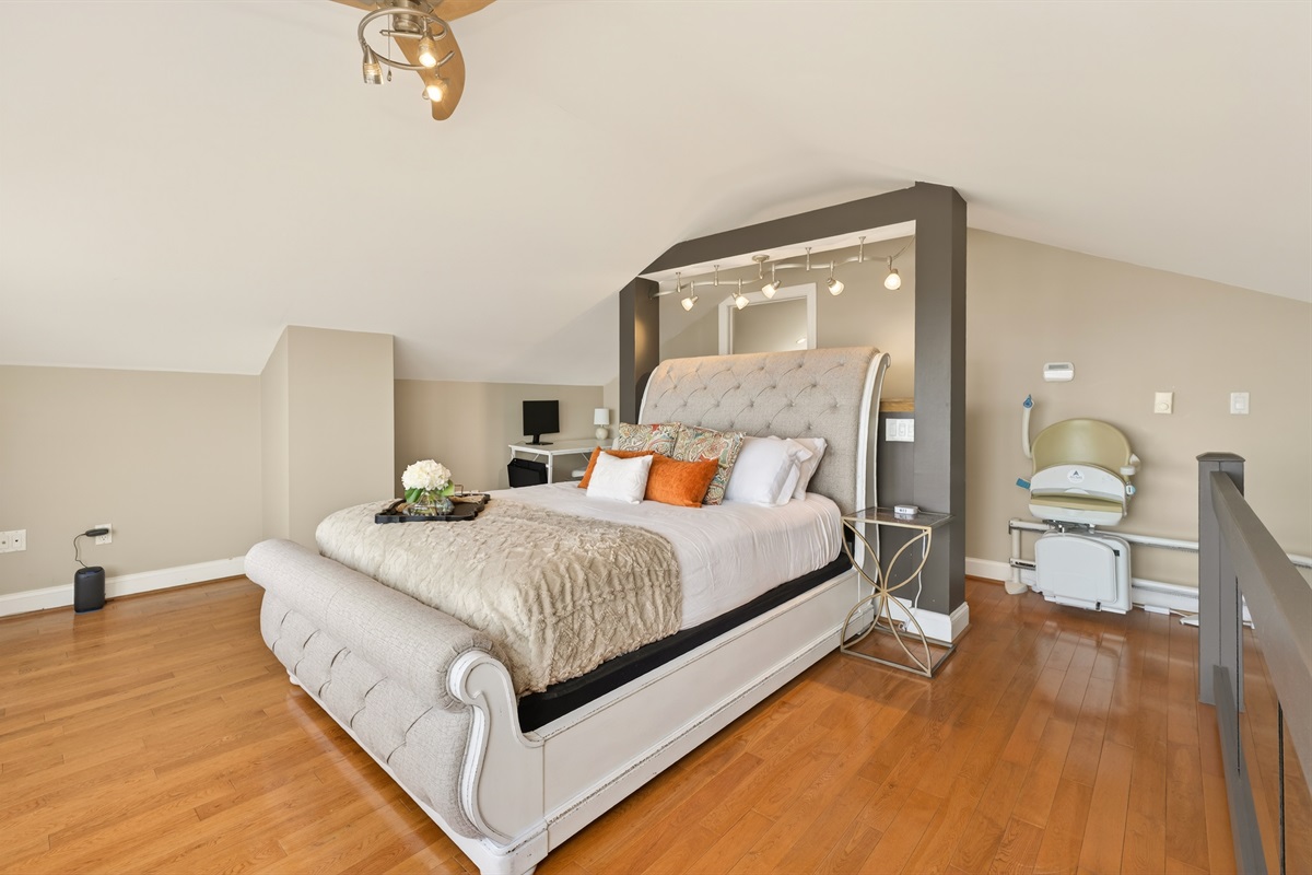 Upstairs, the loft-style bedroom offers a cozy, private retreat with its own luxury bath complete with a jetted soaking tub, double vanities, separate shower, and a spacious walk-in closet.