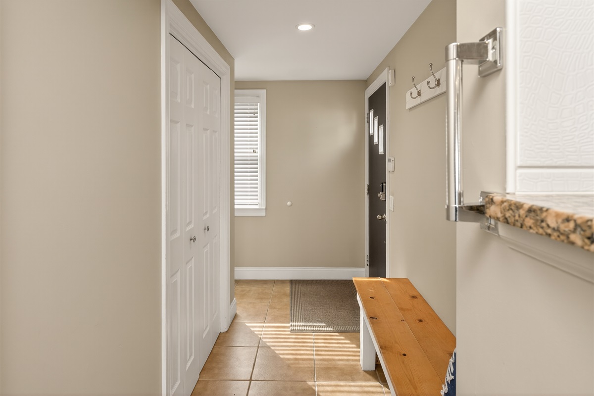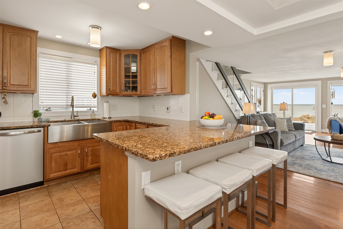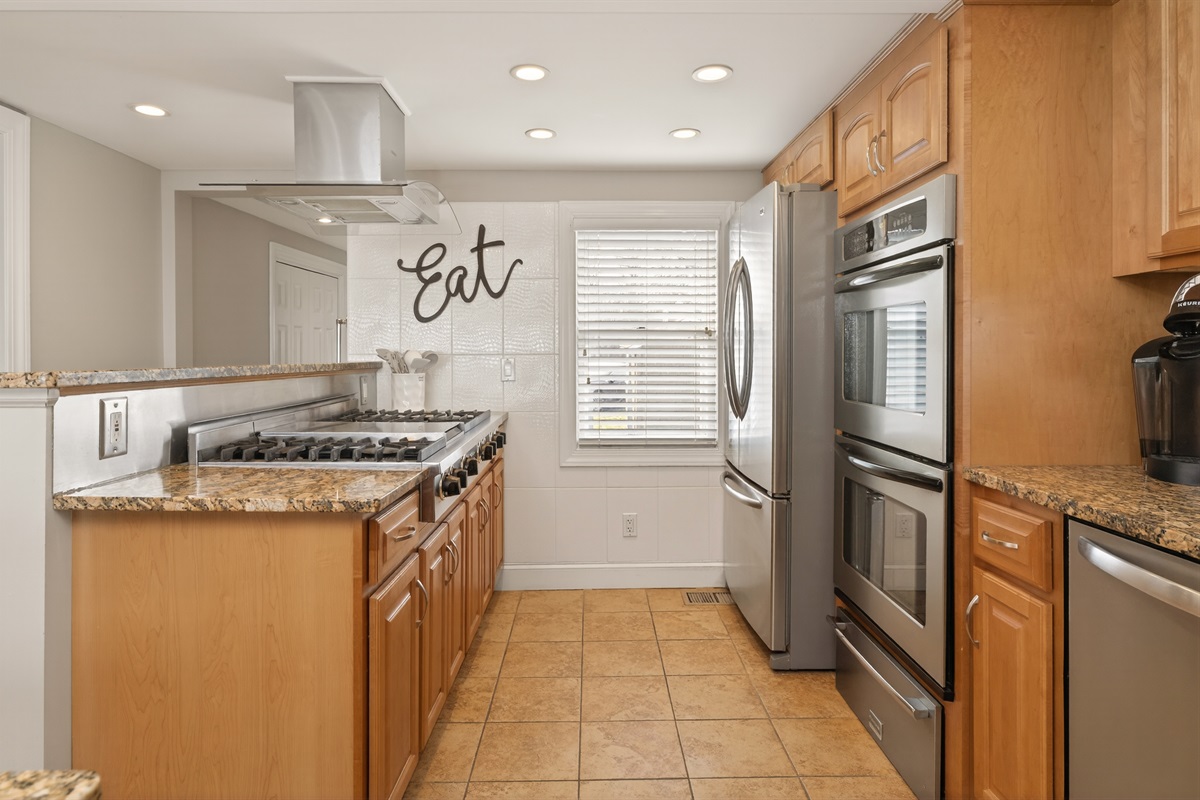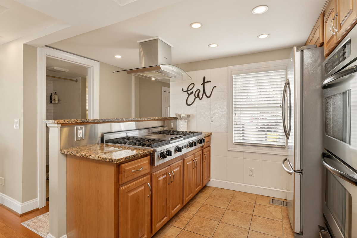Inside, the bright open-concept main level features heated floors, a comfortable living area, a full bathroom, and a queen-size pull-out sofa. The gourmet kitchen includes double ovens, a gas cook top, microwave, dishwasher, and full-size refrigerator — ideal for preparing meals during your stay.