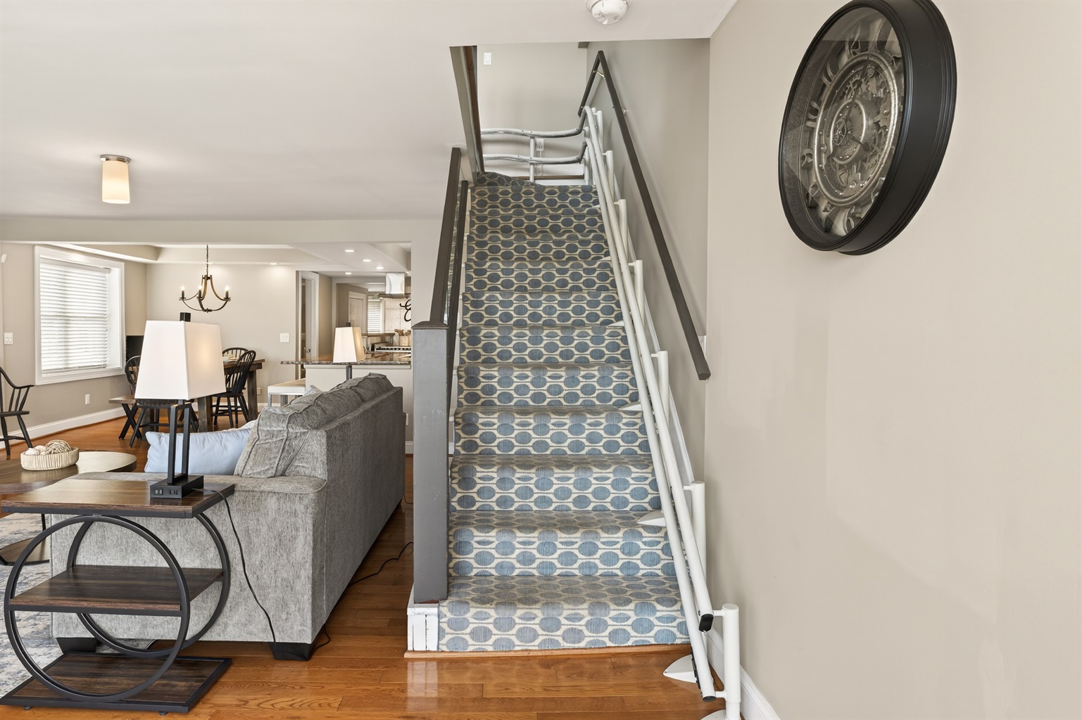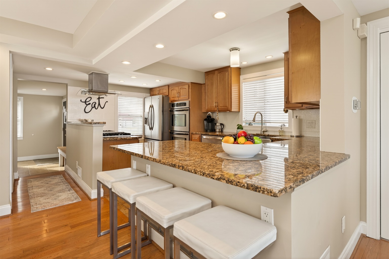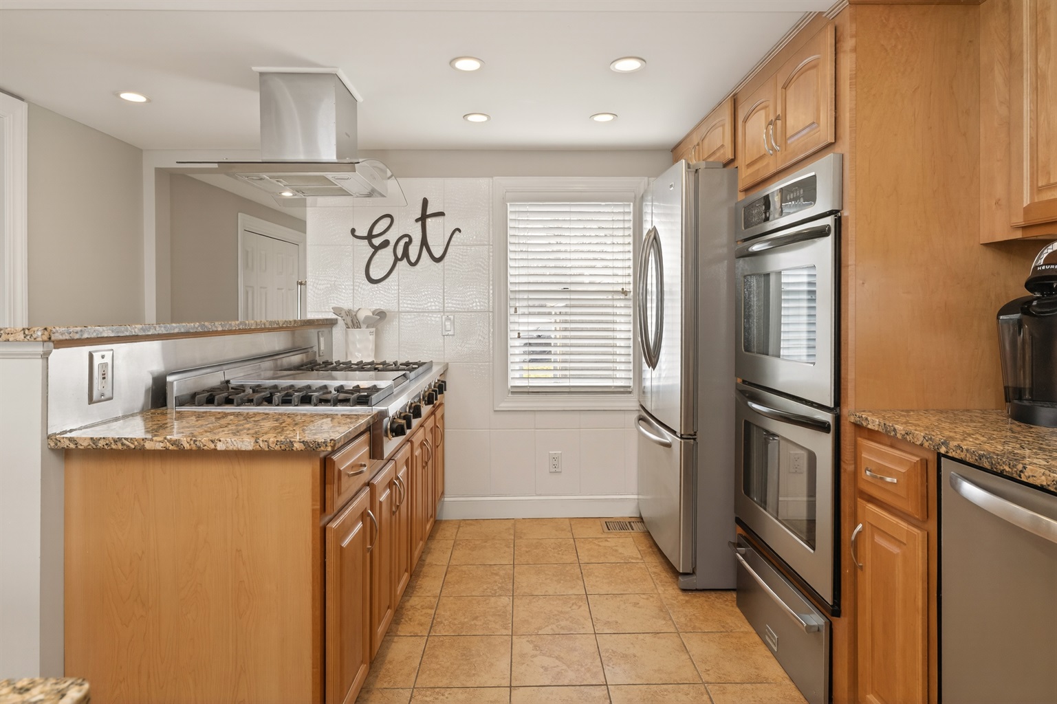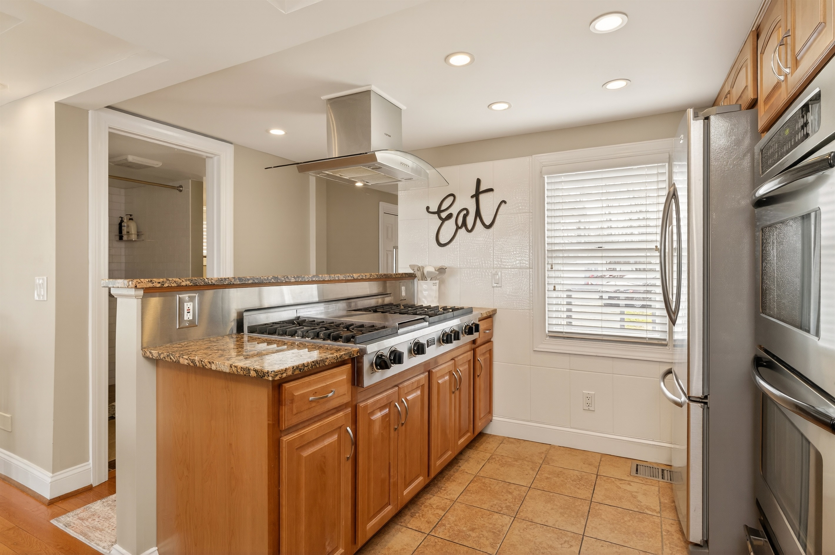 Inside, the bright open-concept main level features heated floors, a comfortable living area, a full bathroom, and a queen-size pull-out sofa. The gourmet kitchen includes double ovens, a gas cook top, microwave, dishwasher, and full-size refrigerator — ideal for preparing meals during your stay.
