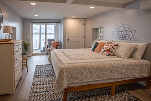 Upstairs, find a peaceful king bedroom with lake views and a charming queen bedroom with garden views. The third bedroom on the lower level offers a king bed, ensuite bath, and direct access to the patio, hot tub, and lakefront for added privacy and convenience.