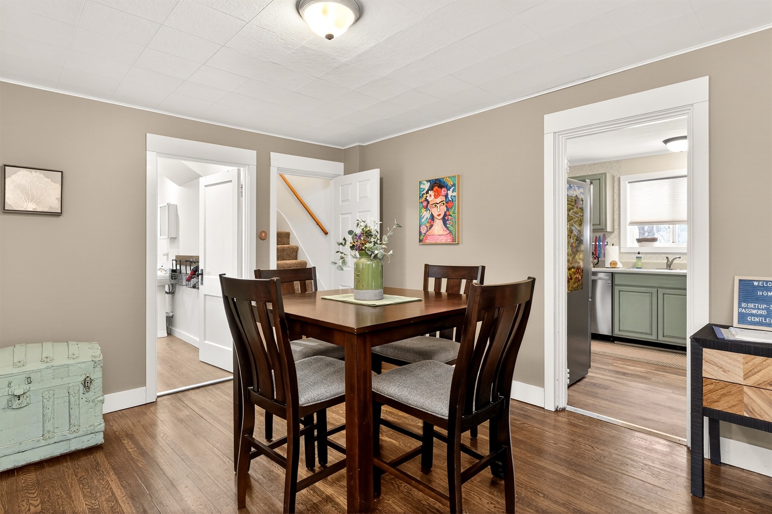 The home offers driveway parking for up to three vehicles and comfortably accommodates up to eight guests. With two full bathrooms, a cozy living room, and two kitchen spaces—a fully stocked kitchen on the main floor and a convenient kitchenette upstairs—this home is ideal for families or couples seeking comfort and convenience in a central village location.