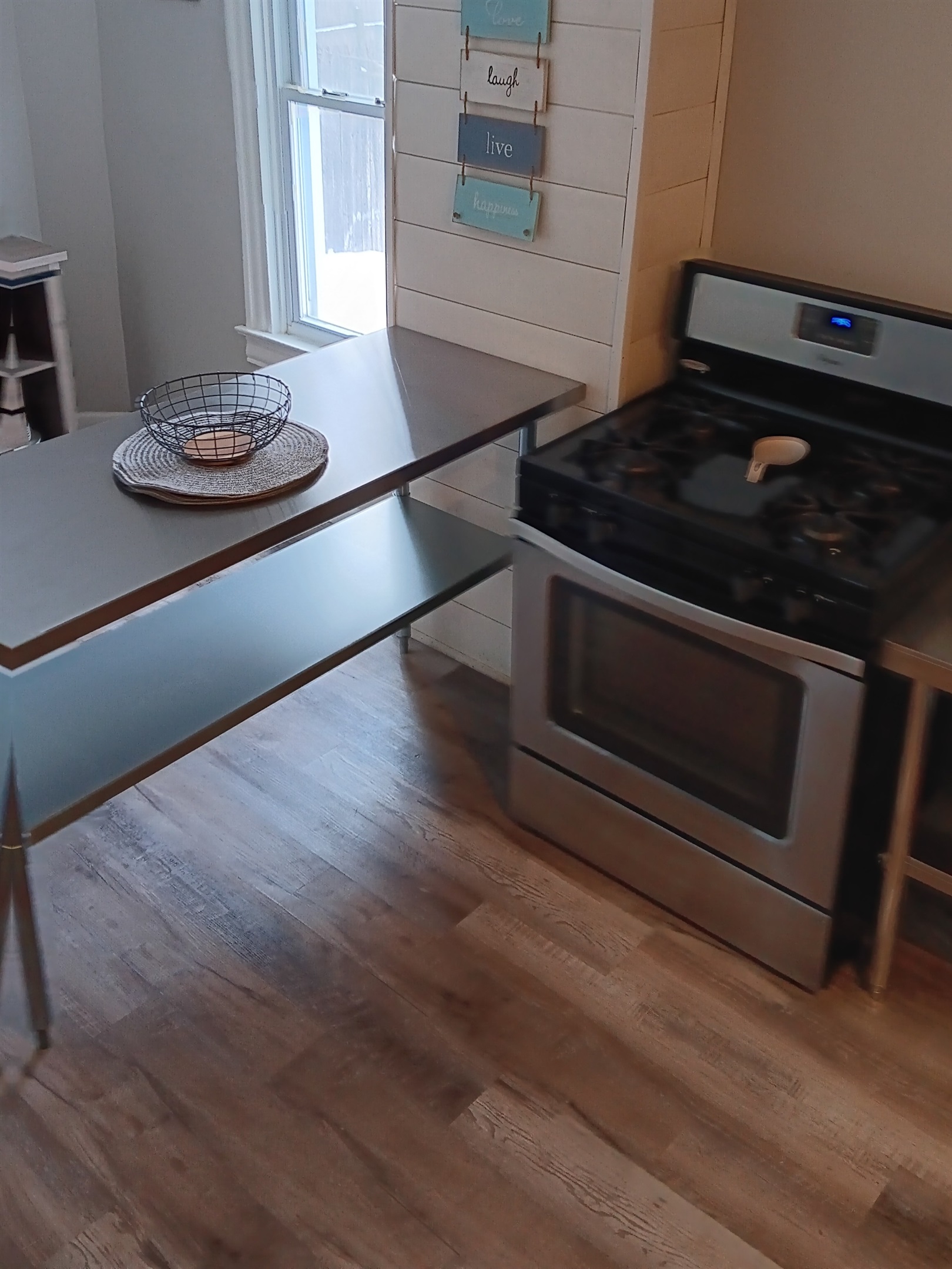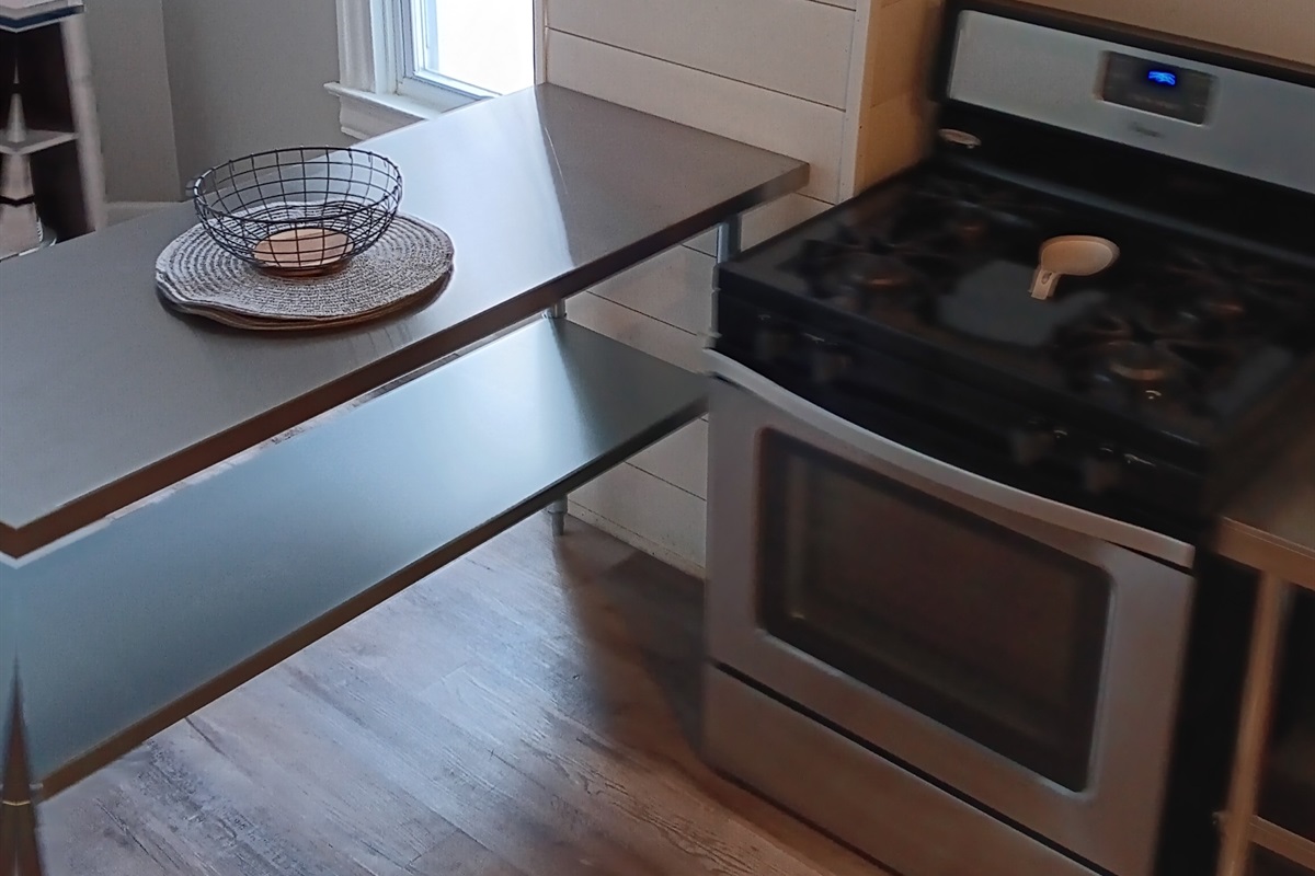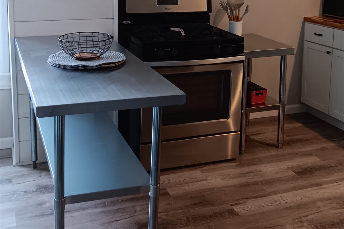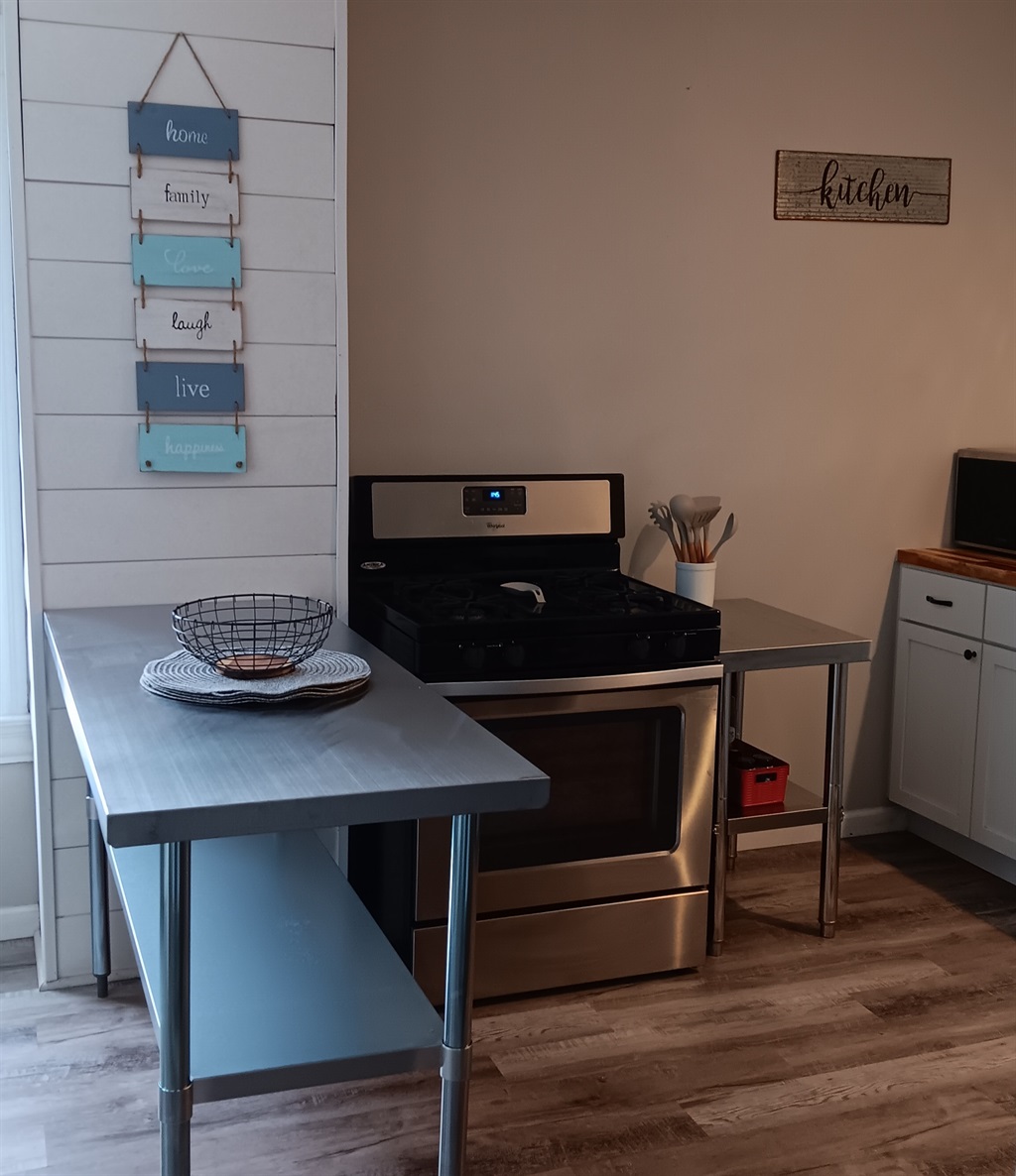 The main floor features an open kitchen with stainless steel appliances and beautiful butcher block countertops. You'll have all you need to prepare a delicious meal, including an oven, stove, dishwasher, and a full-size fridge and freezer. We provide most kitchen essentials, so just bring your favorite seasonings and ingredients.