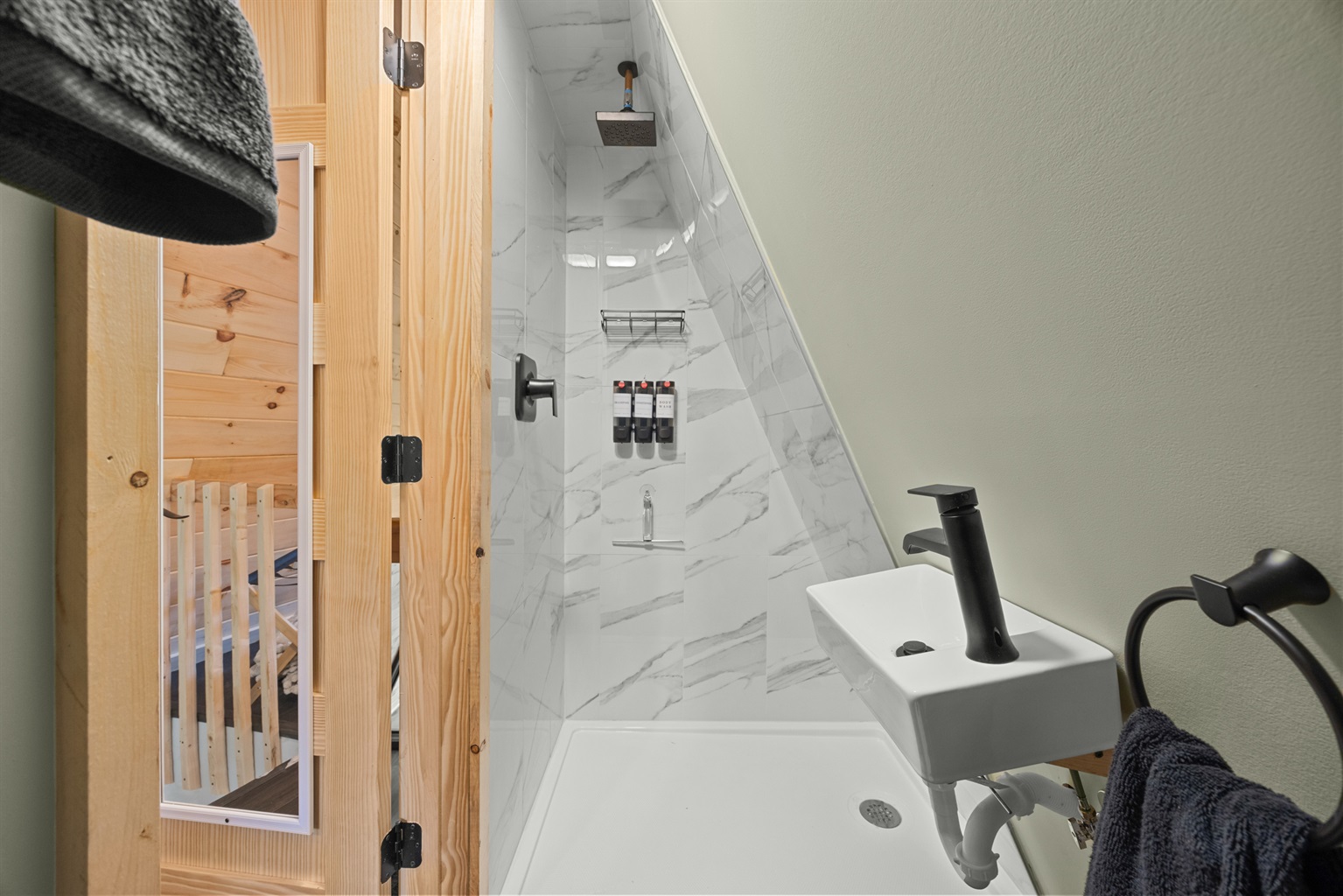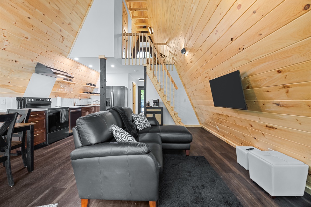 The home features two bedrooms and two full bathrooms, including a lofted king suite with ensuite bath and balcony, plus a main floor queen bedroom. The open living area is bright and comfortable, with a fully equipped kitchen and space to relax.