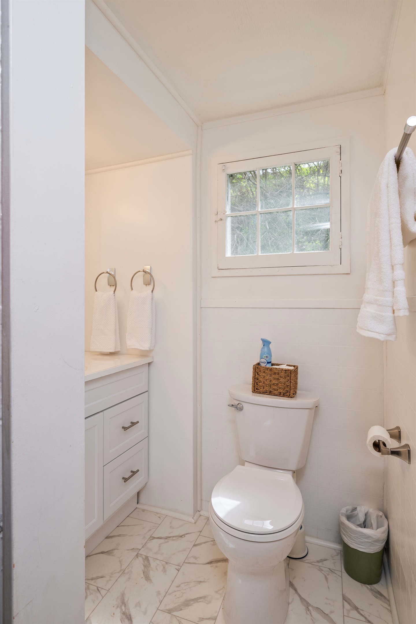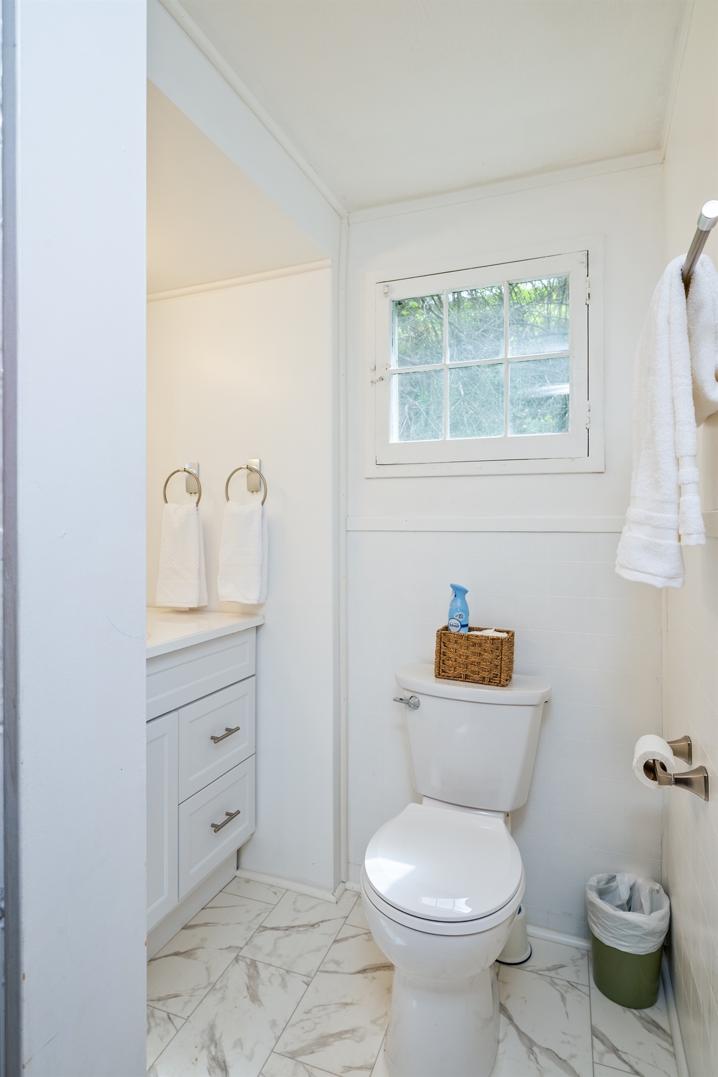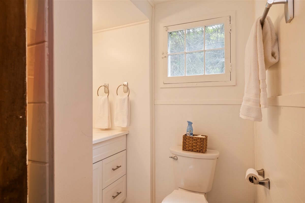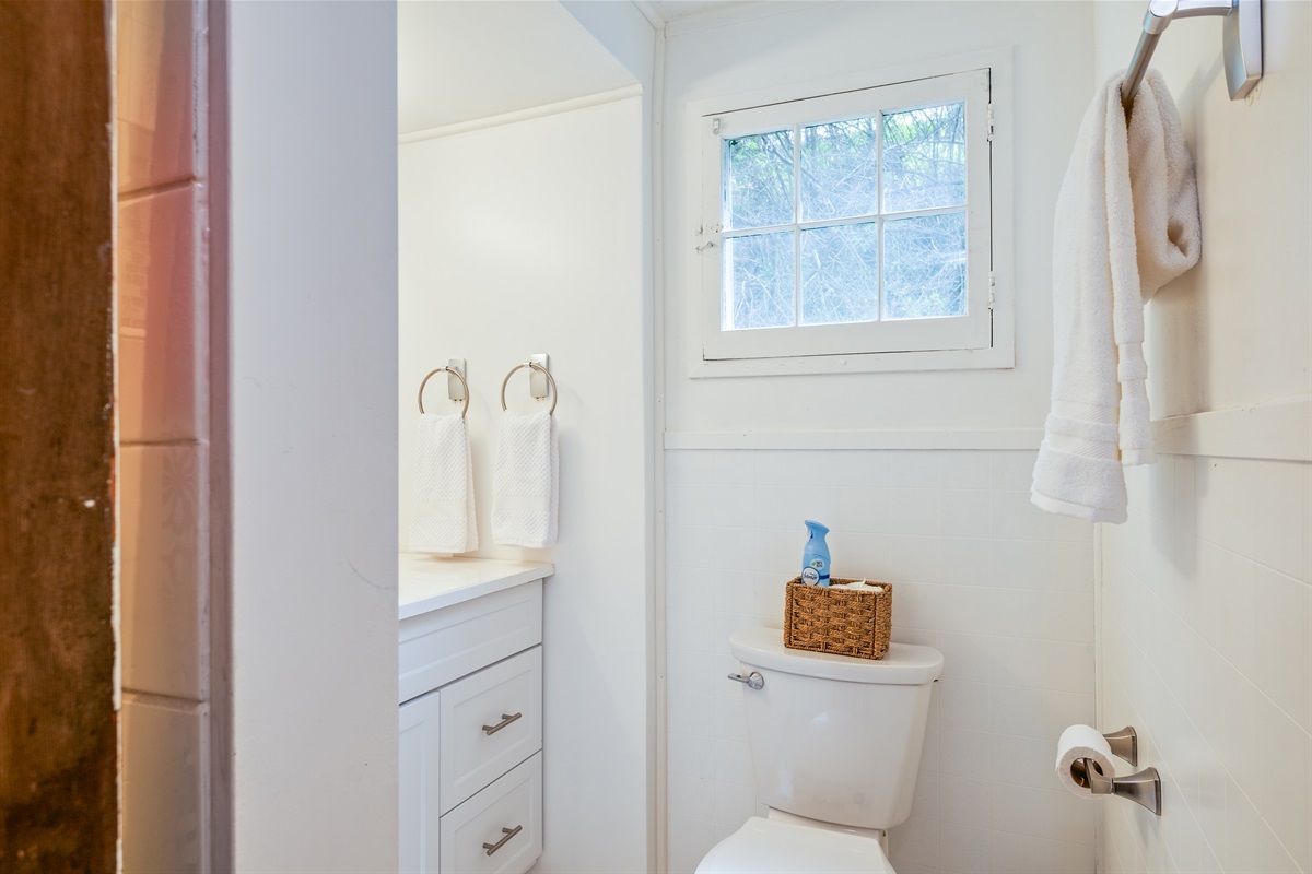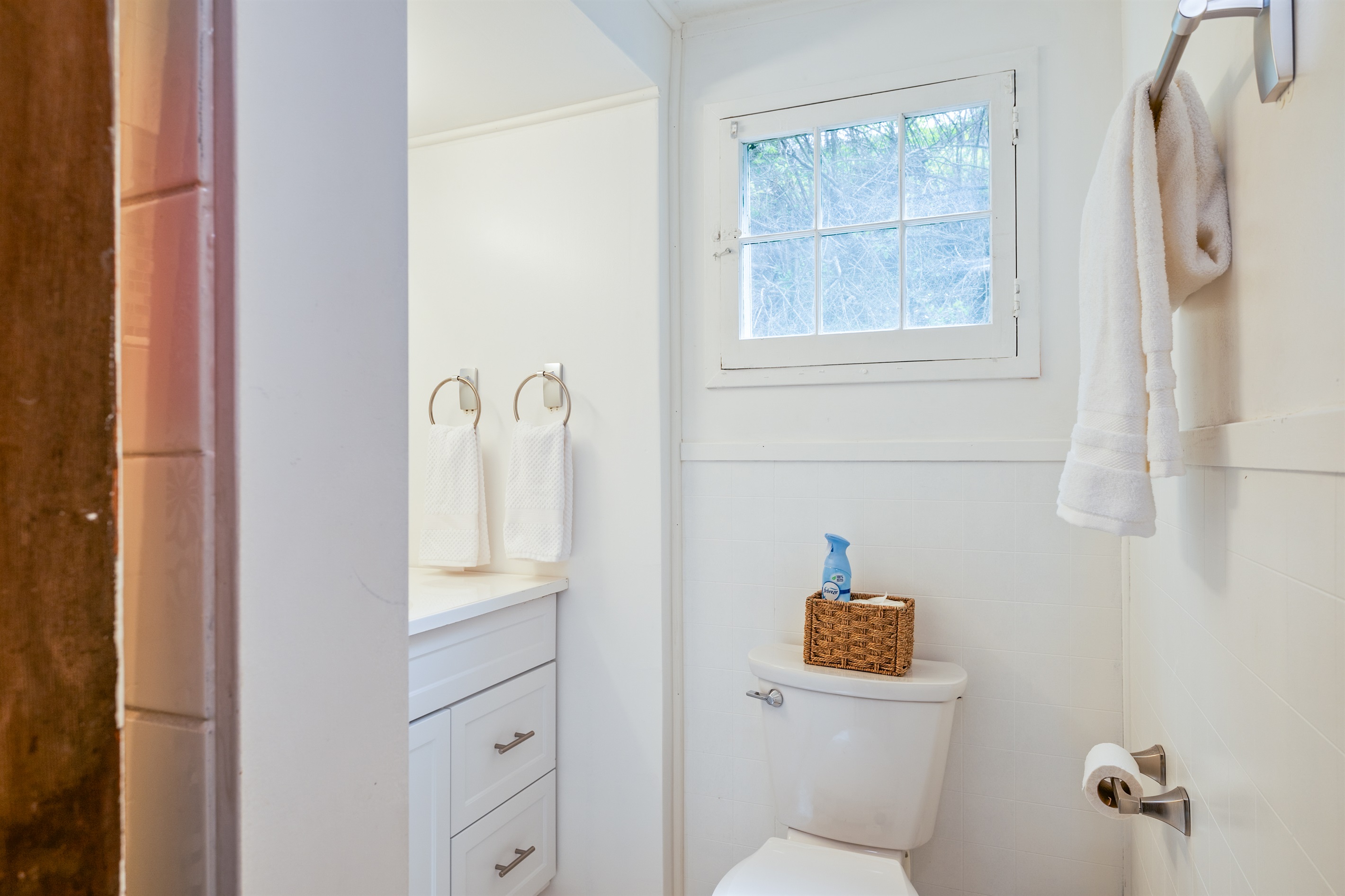 A spacious, well-lit bathroom with modern touches and vintage character. Fresh towels and thoughtful details complete the experience!