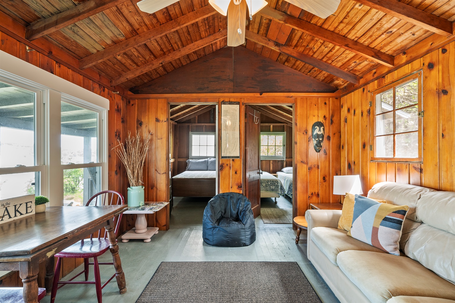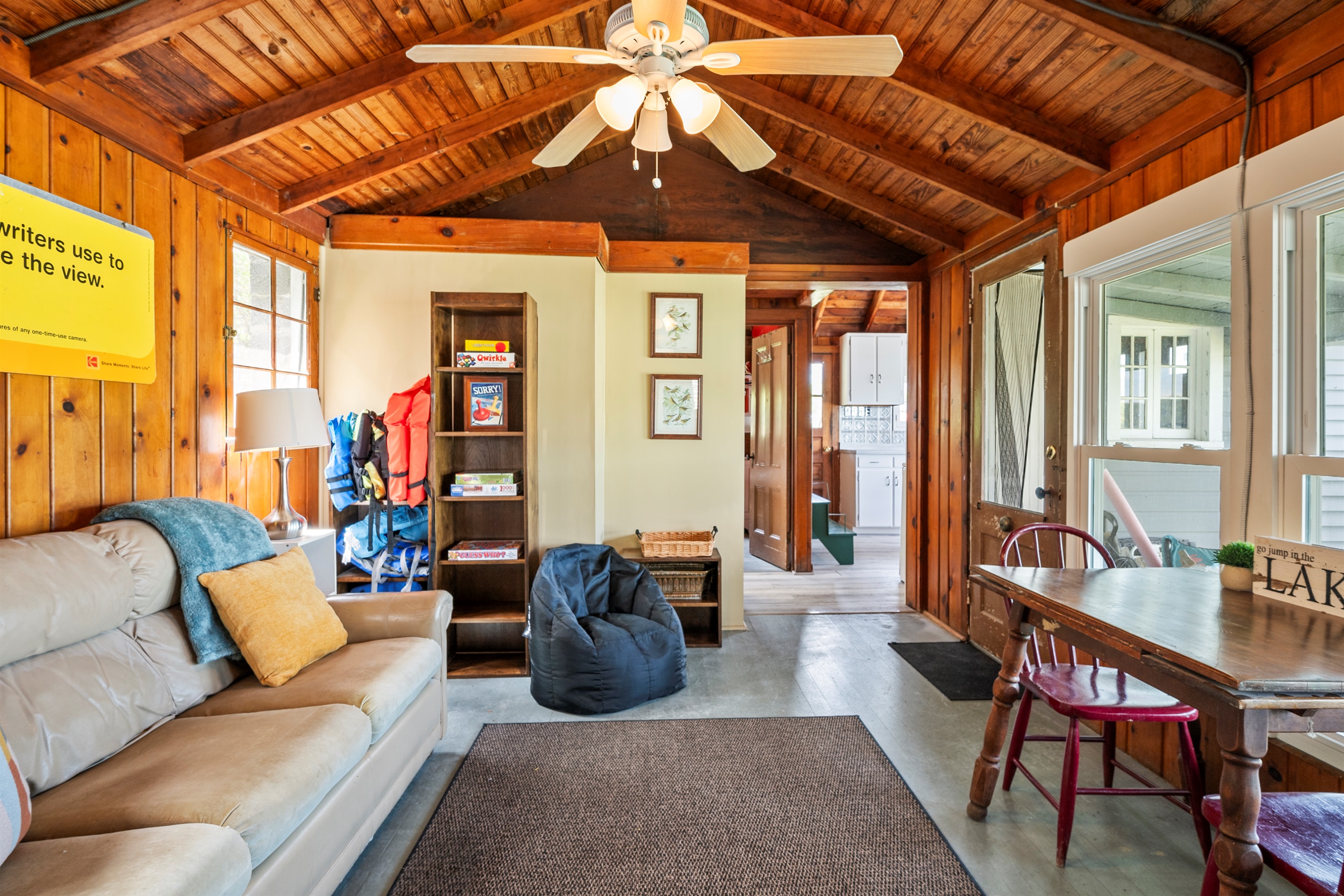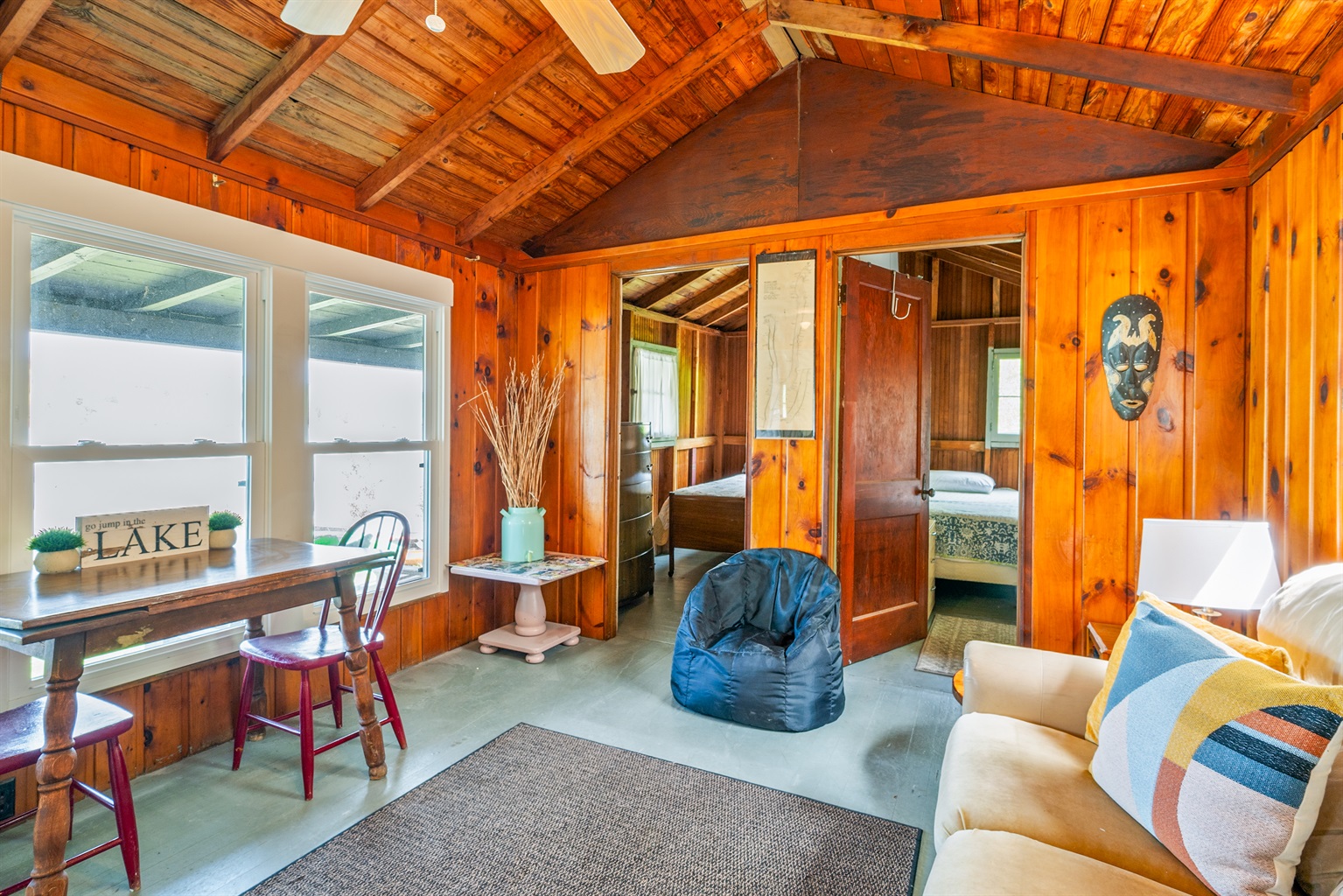 Unwind in this warm and inviting sunroom featuring rich wood paneling, plush seating, and stunning lake views. The perfect spot to sip wine and relax.