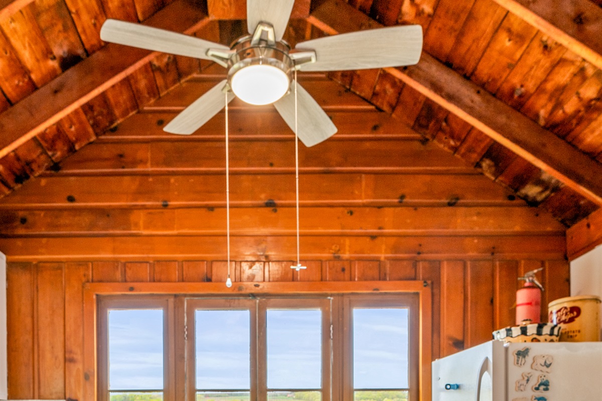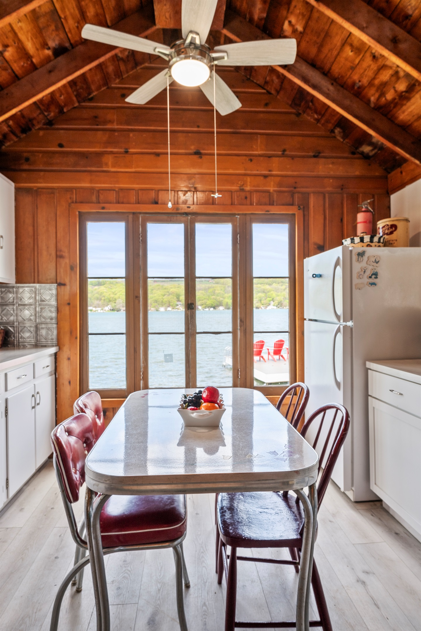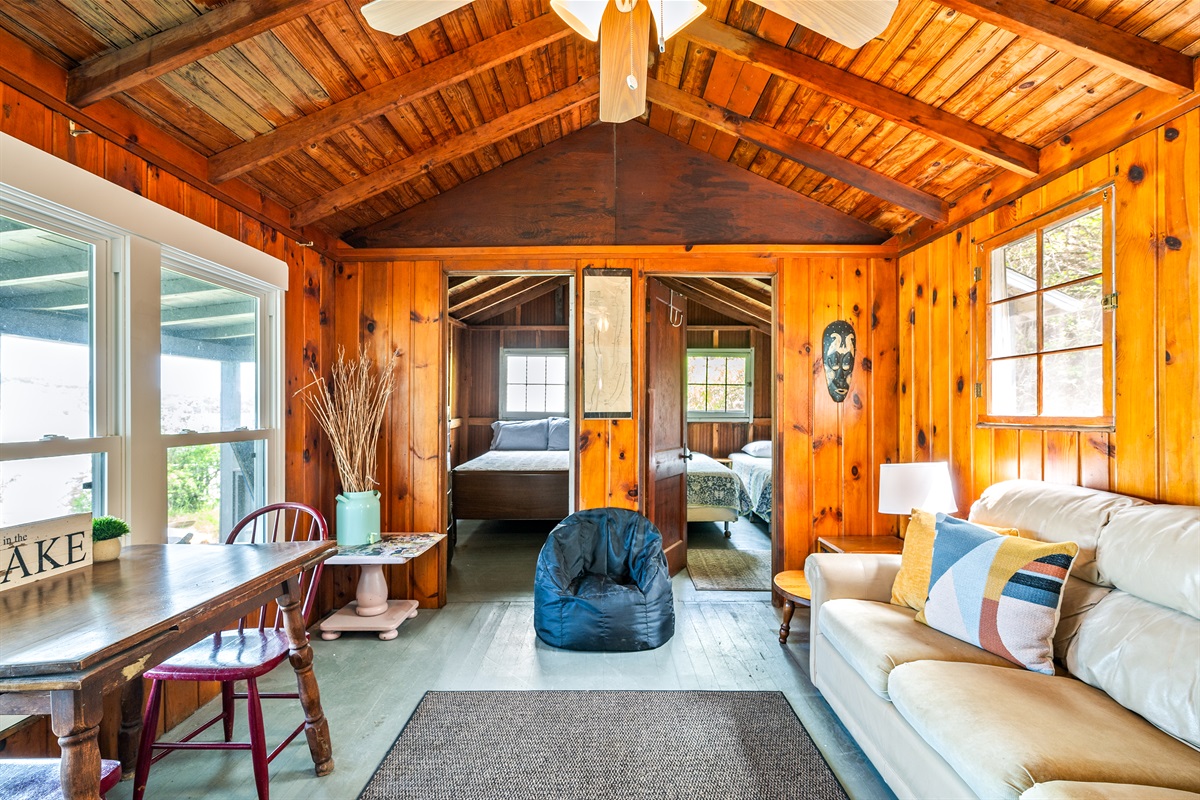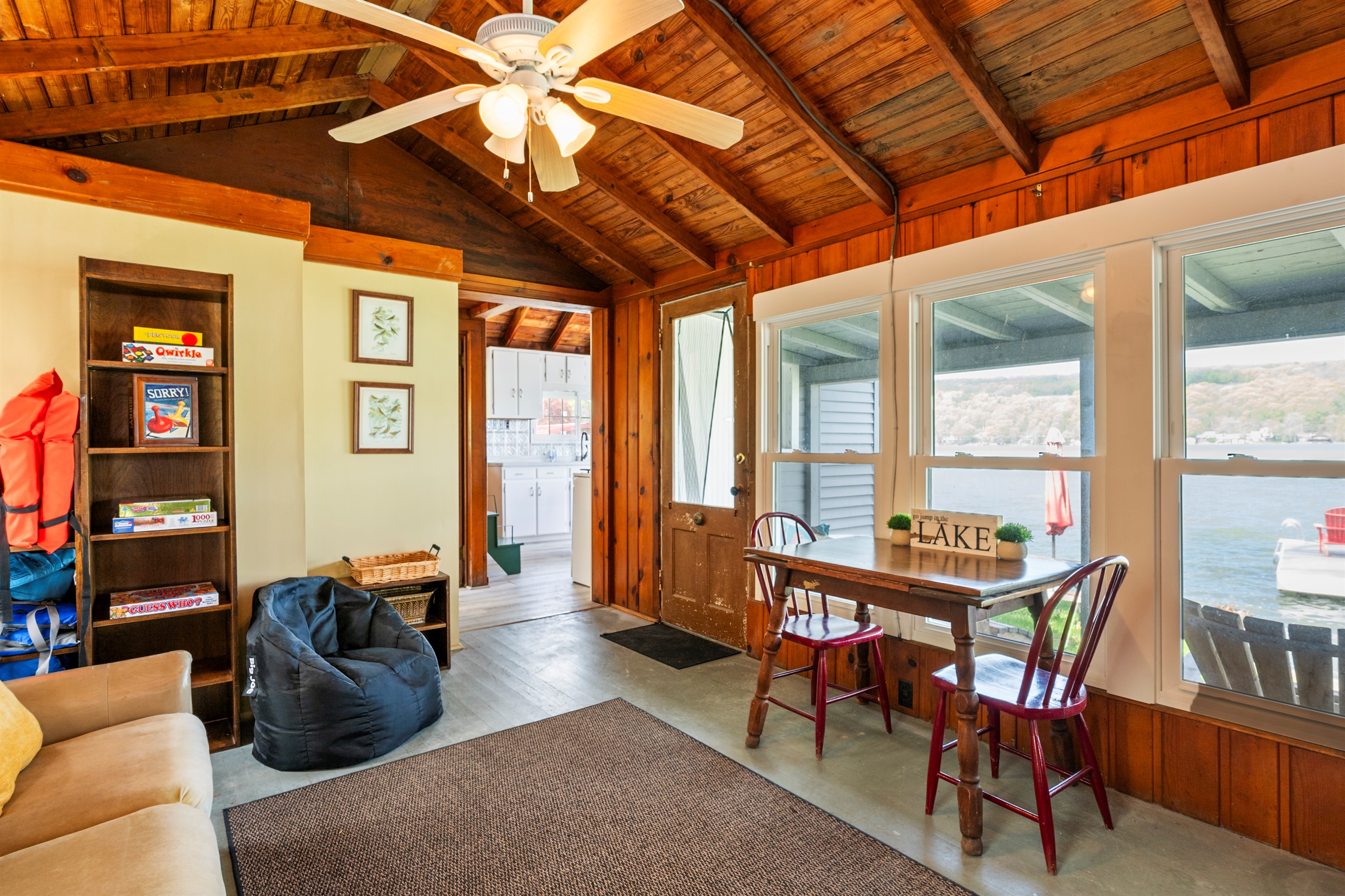 Unwind in this warm and inviting sunroom featuring rich wood paneling, plush seating, and stunning lake views. The perfect spot to sip wine and relax.