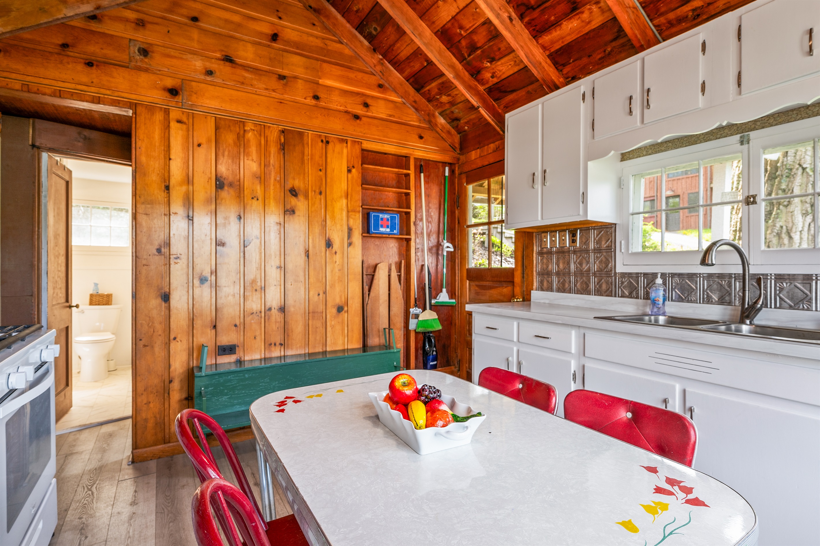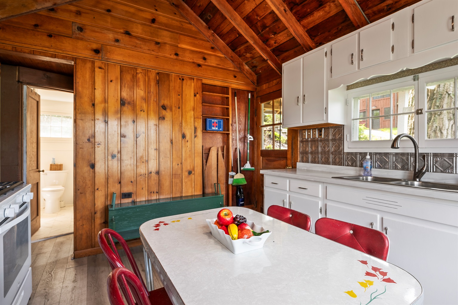 Whip up delicious meals in this bright kitchen with ample counter space, modern appliances, and charming vintage accents.