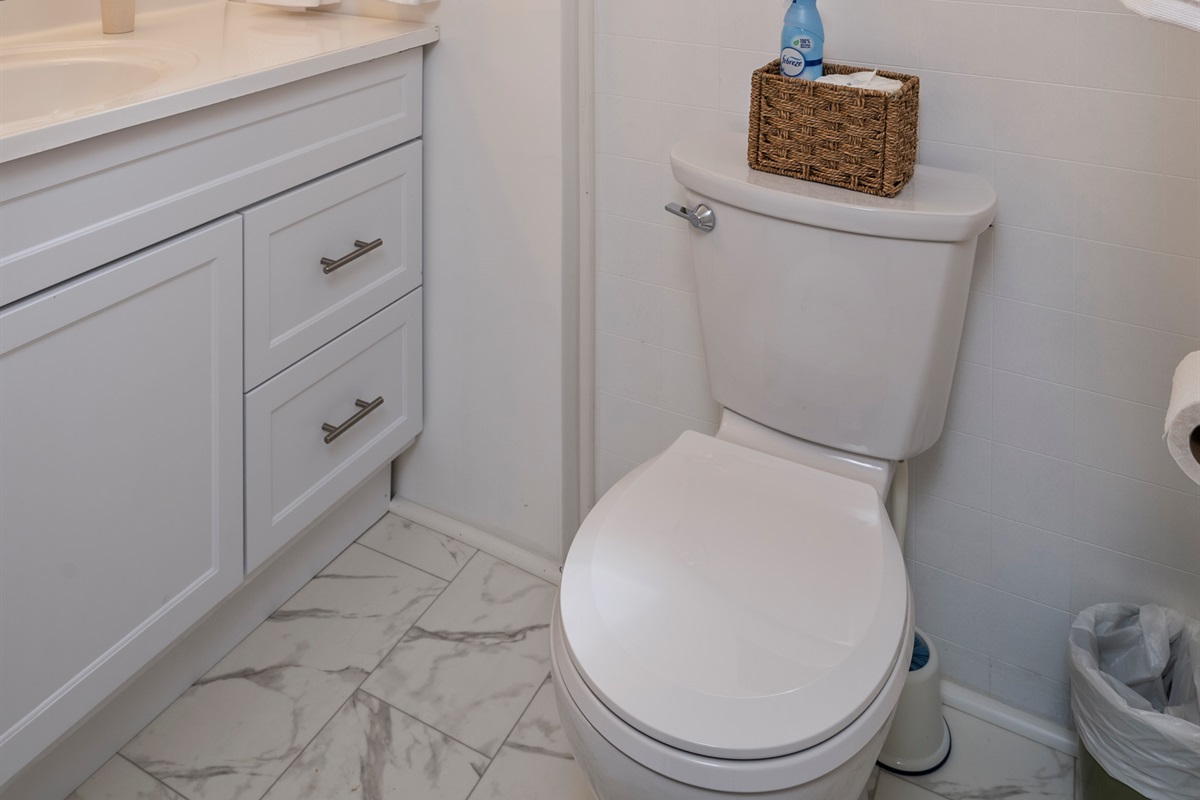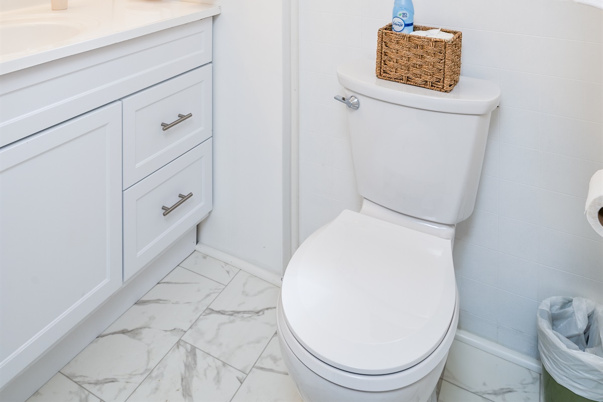 A modern vanity, warm lighting, and classic tile flooring create an inviting space for freshening up.