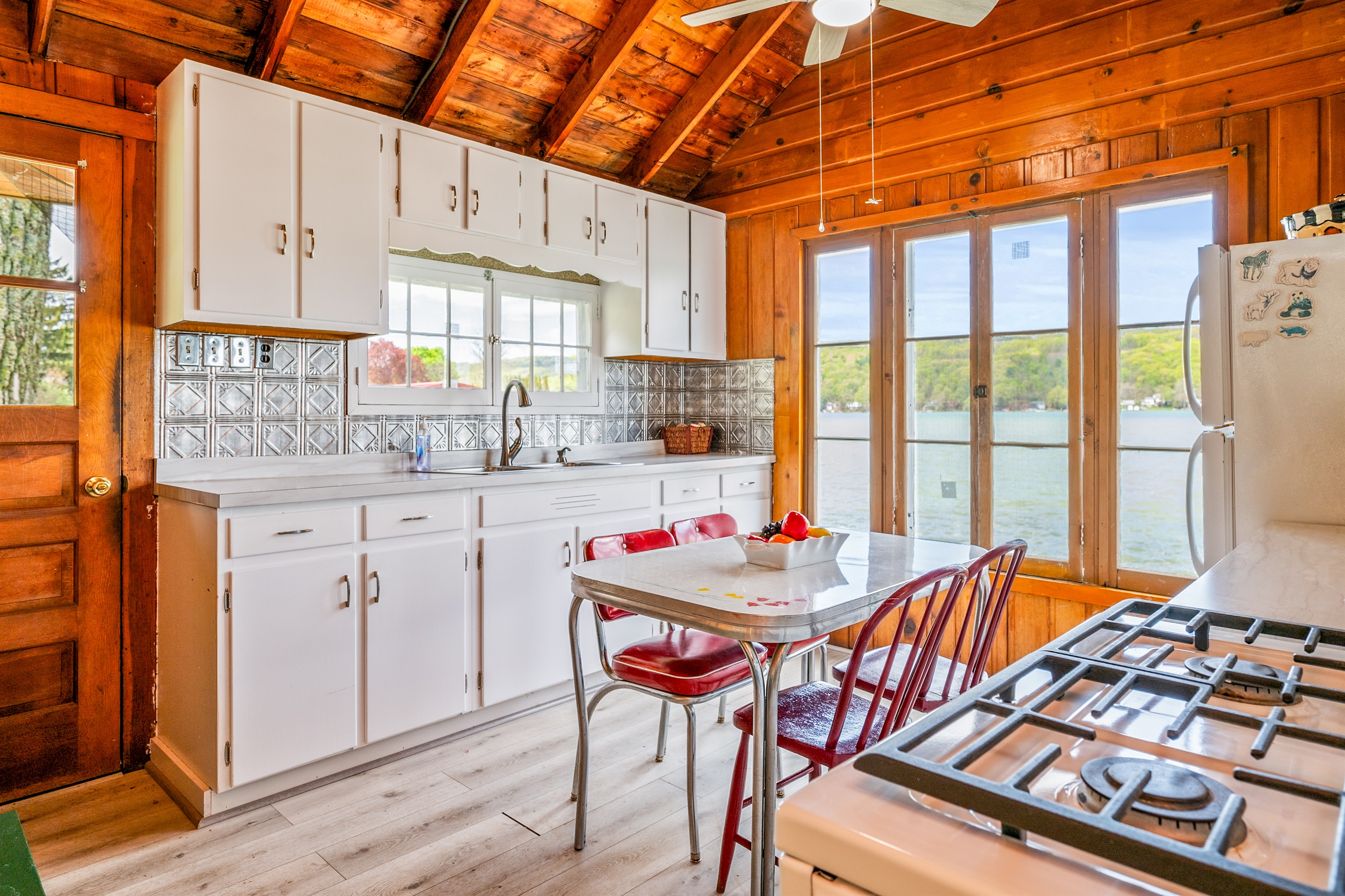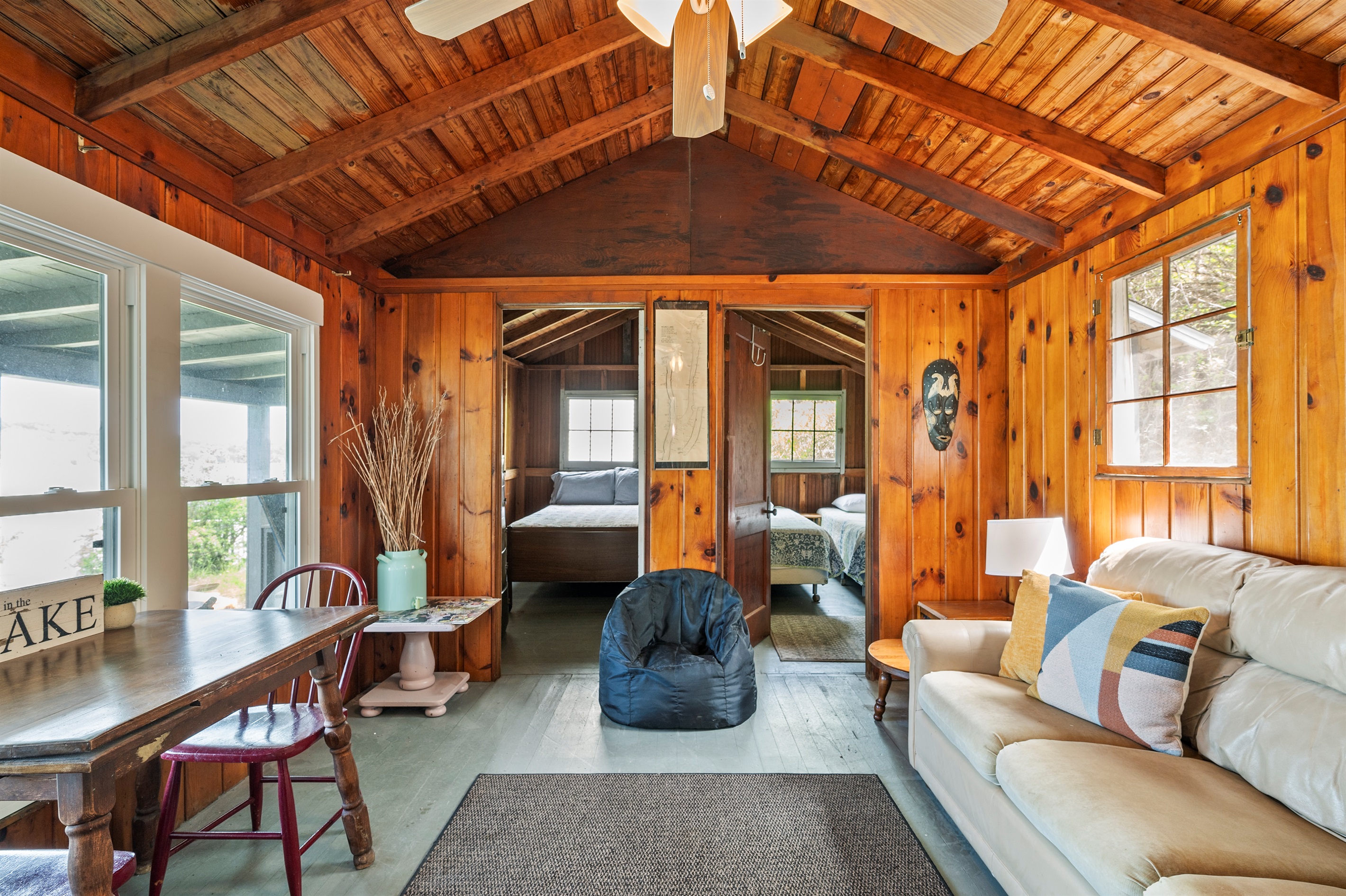Charming lakefront cabin surrounded by trees — rustic comfort meets unbeatable water views.