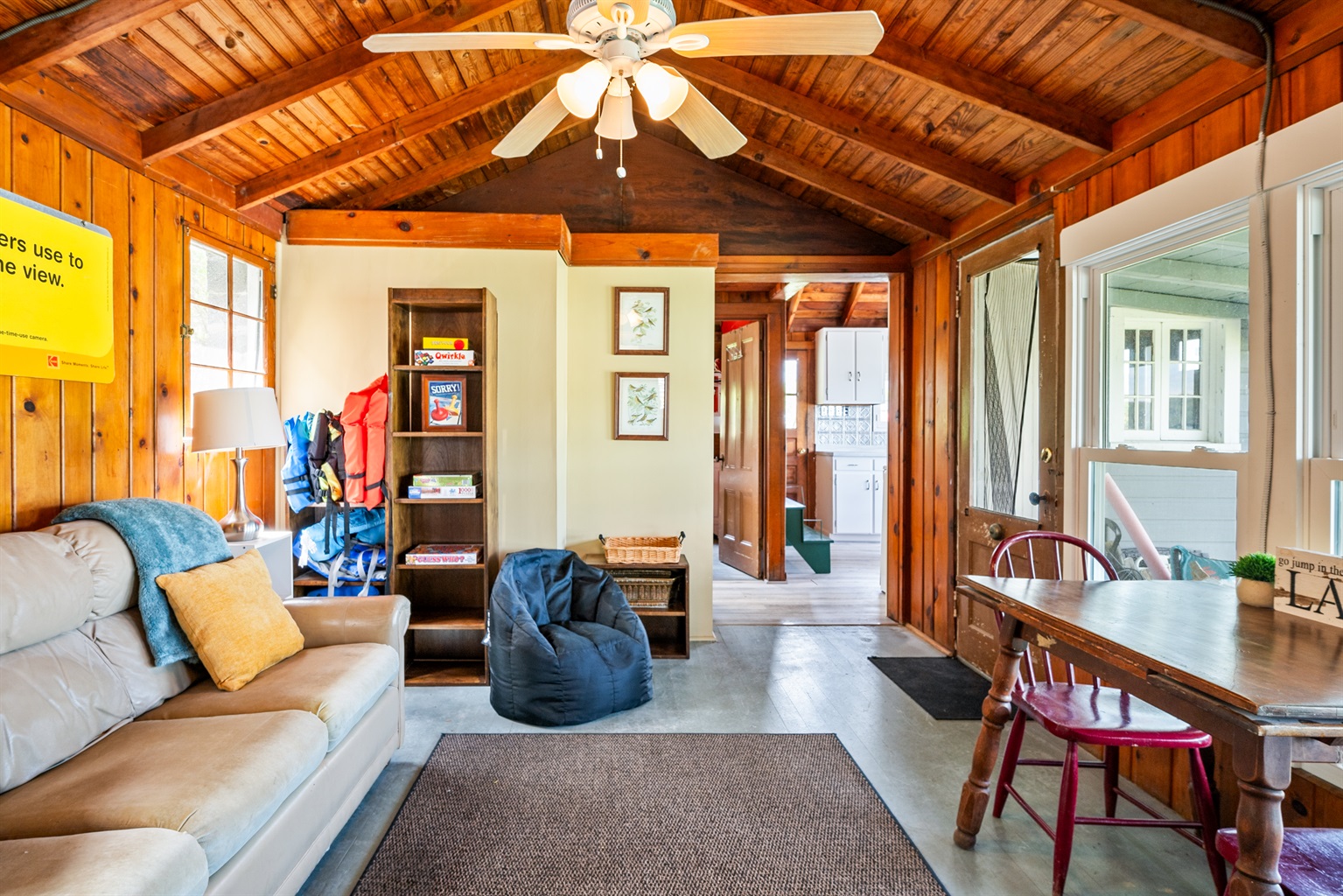 Sunlit and stylish, this cozy living room features vintage charm, a floral sofa, and a chess set ready for a friendly match. Perfect for unwinding after a day by the lake!