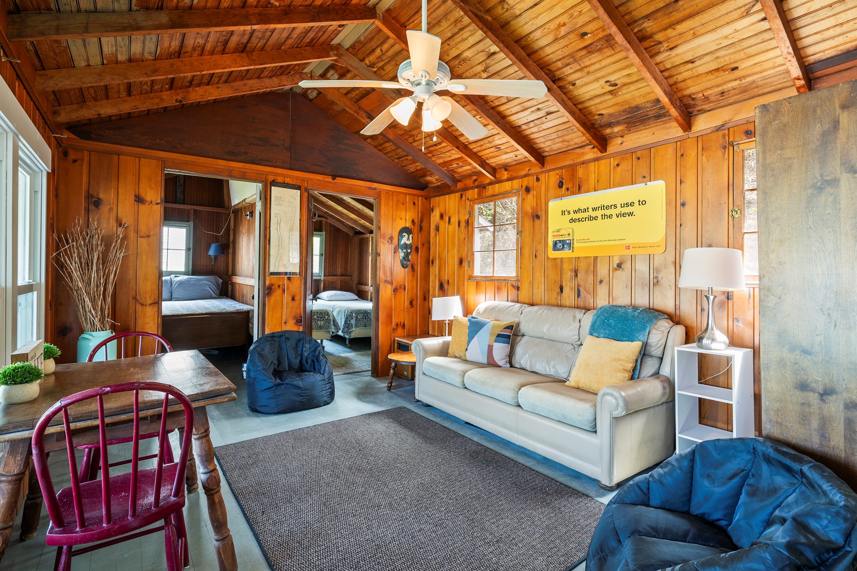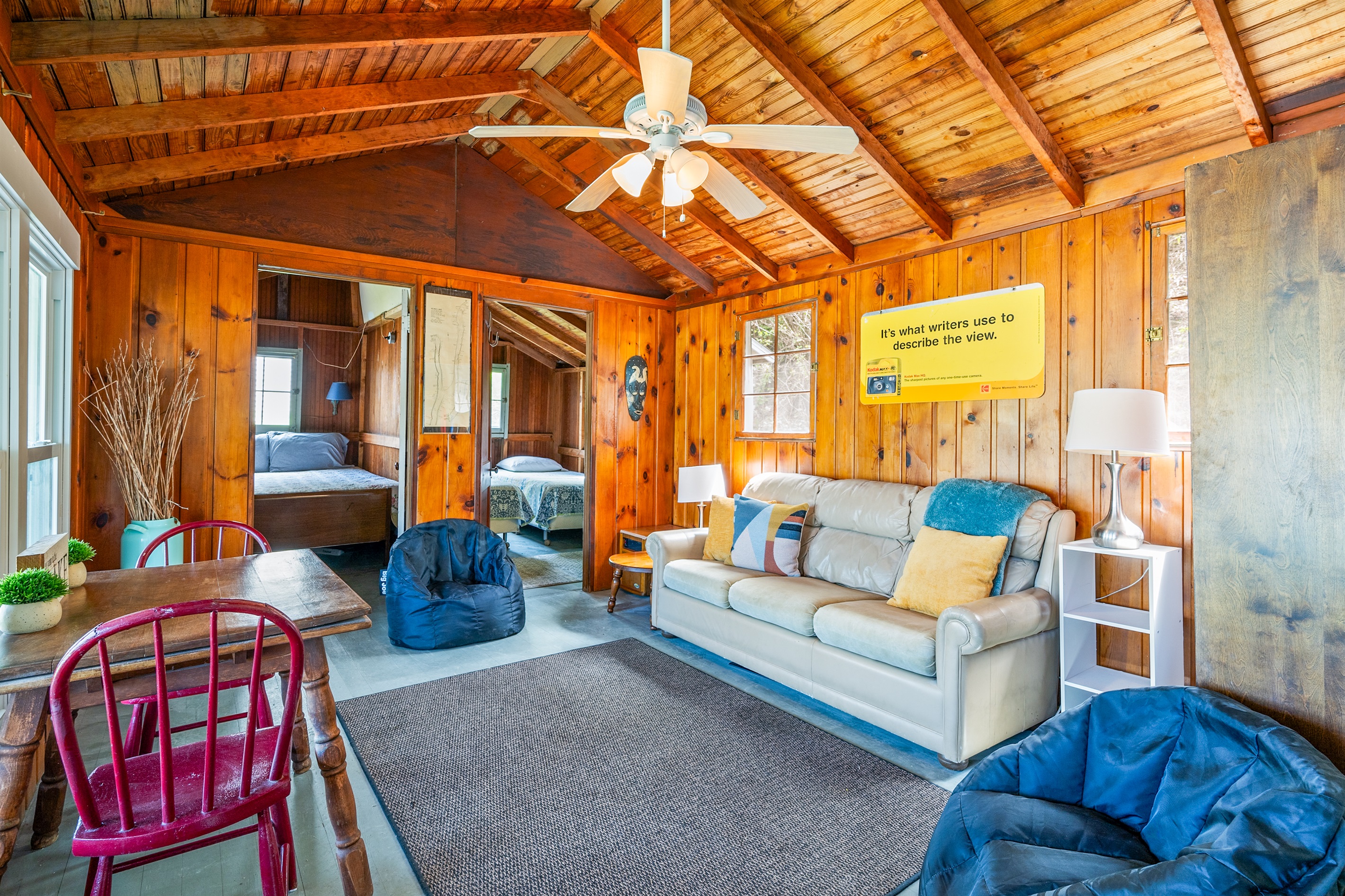 Surrounded by large windows with serene views, this inviting space offers plush sofas, charming decor, and the perfect place to kick back and relax.