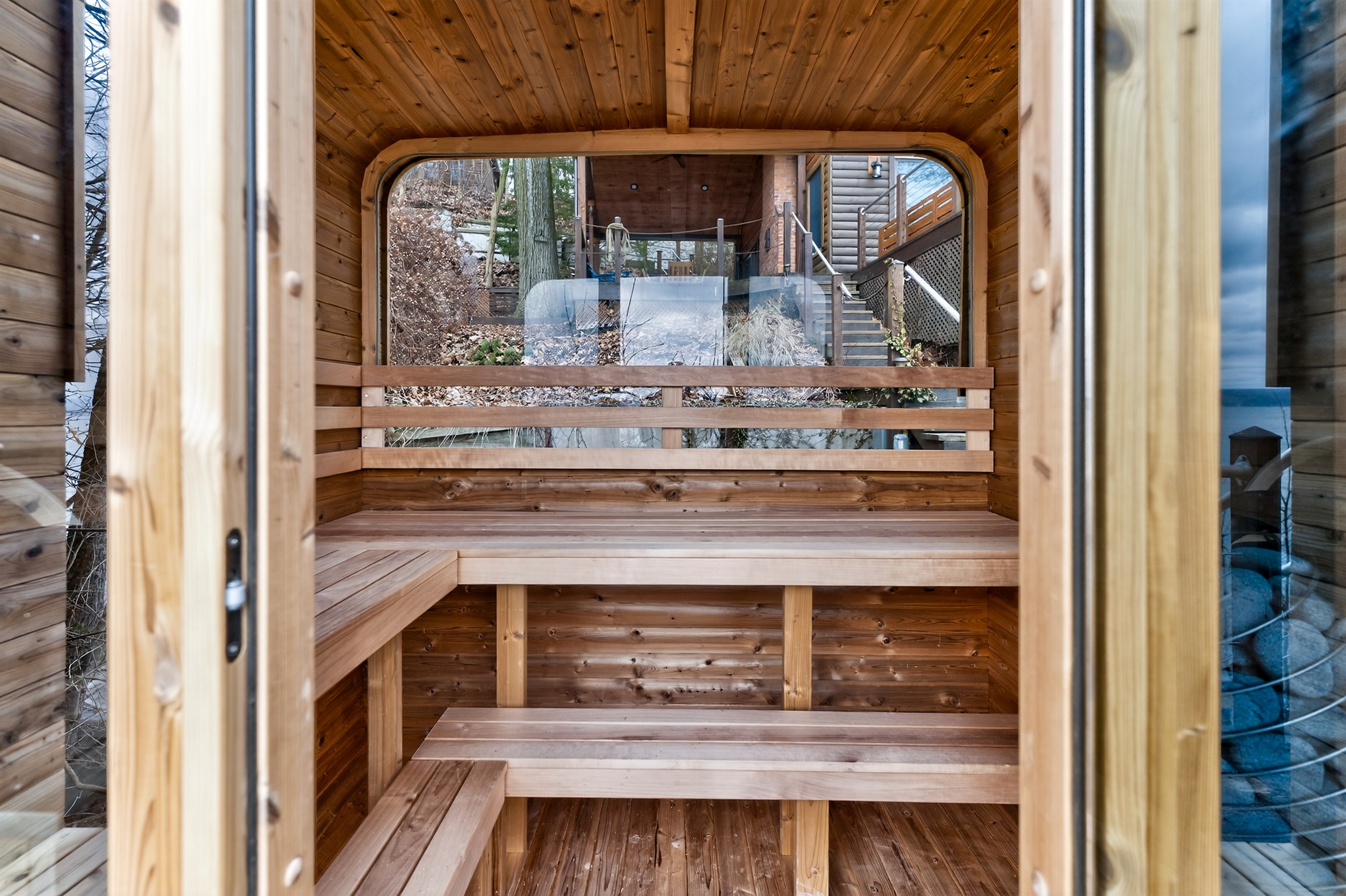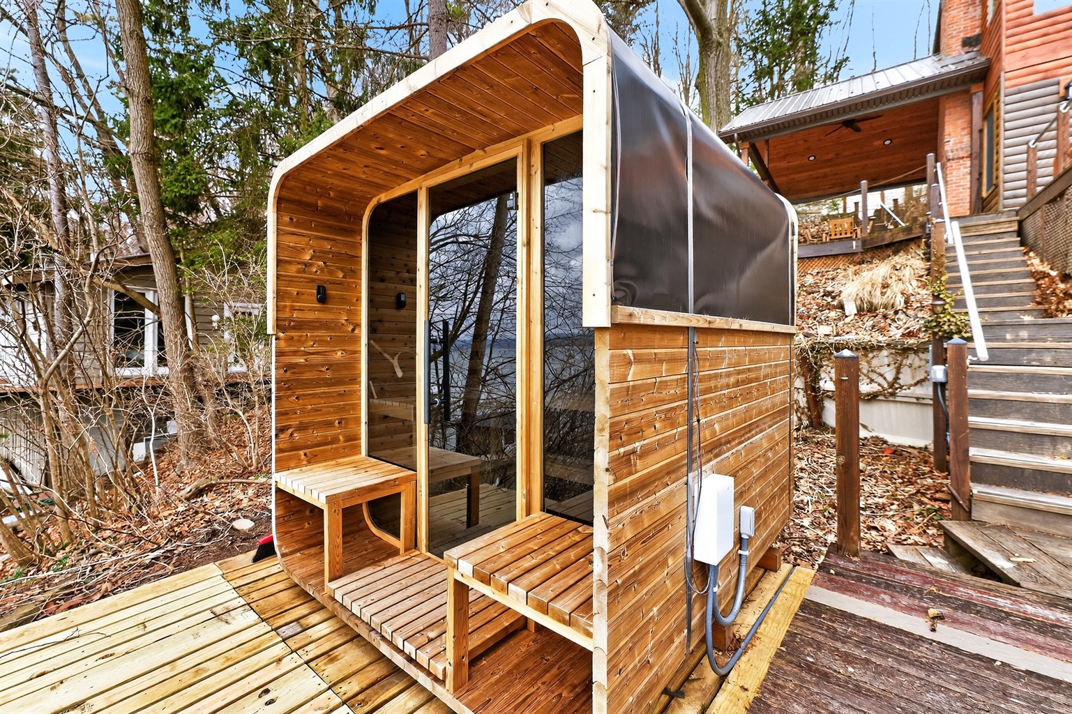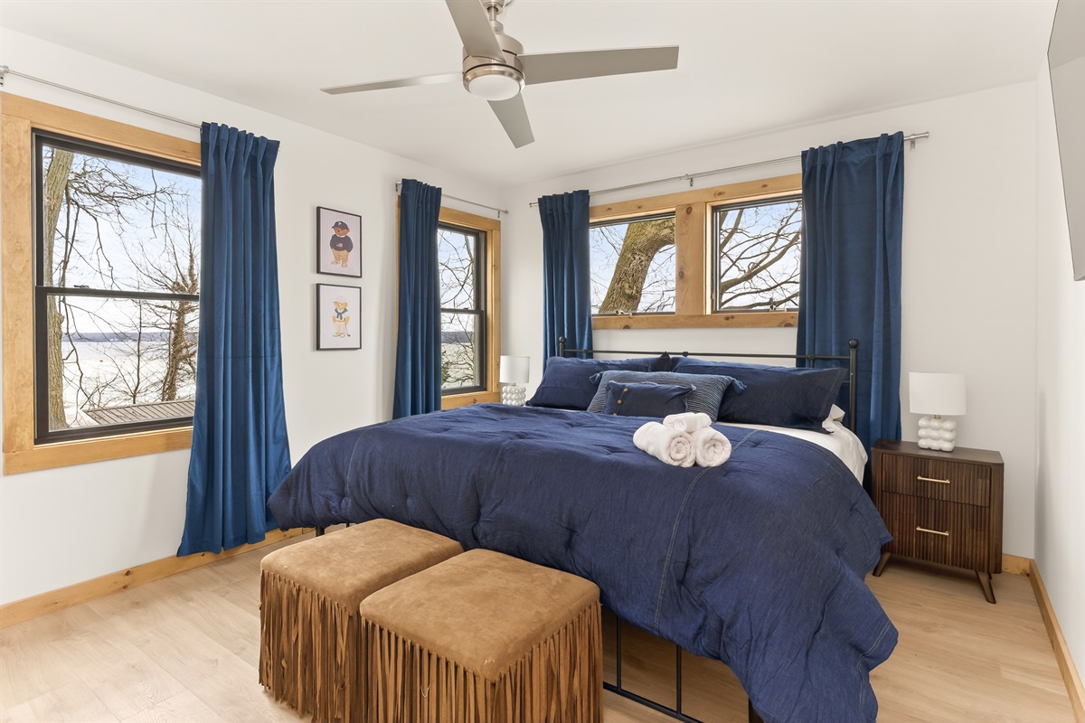 Take in breathtaking lake views from nearly every angle, unwind in the hot tub, or enjoy the sauna while surrounded by serene natural beauty. The main house features a fully stocked kitchen, two queen bedrooms, a king bedroom, a cozy library, two full bathrooms and a large living room with panoramic lake views. Washer and dryer access is conveniently located in the garage suite.