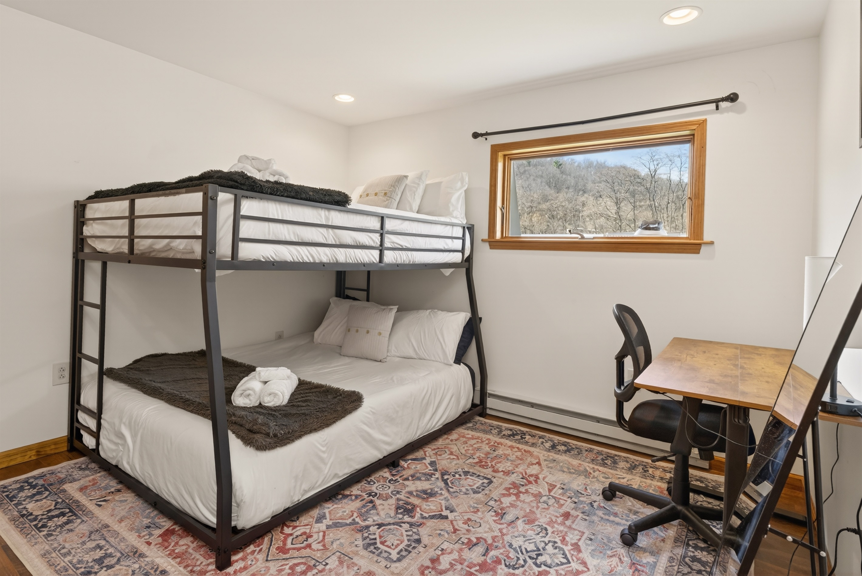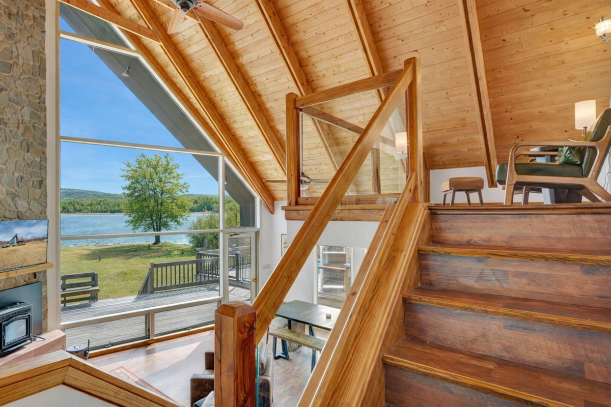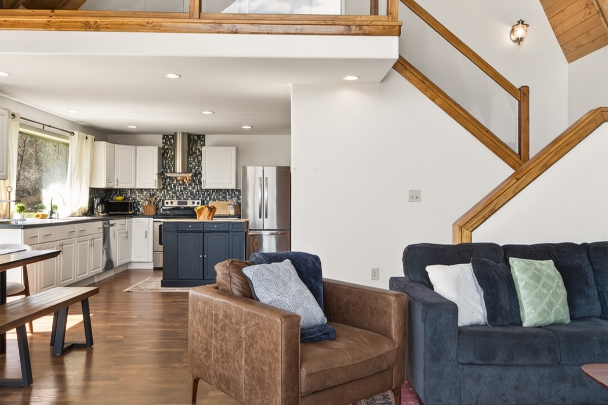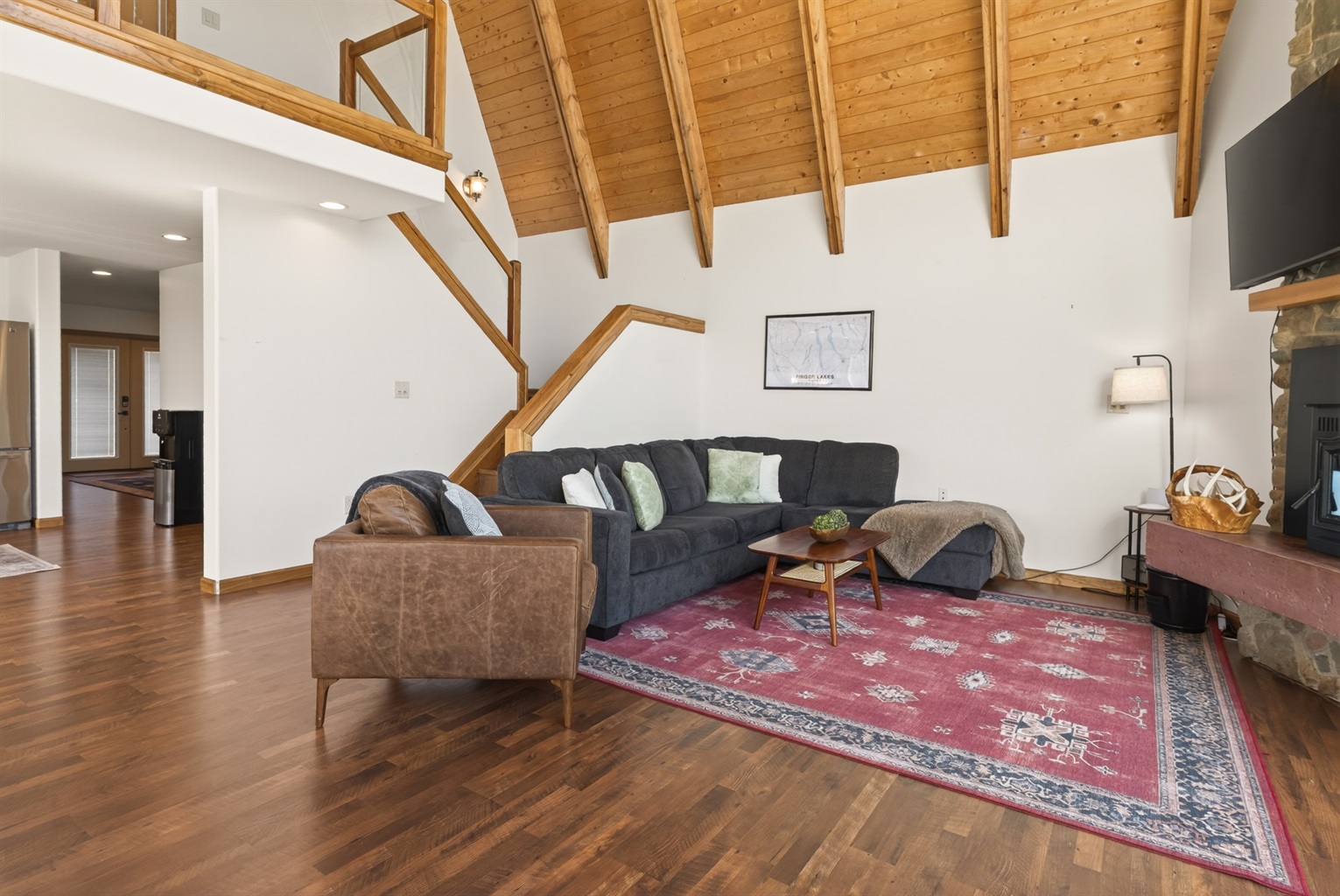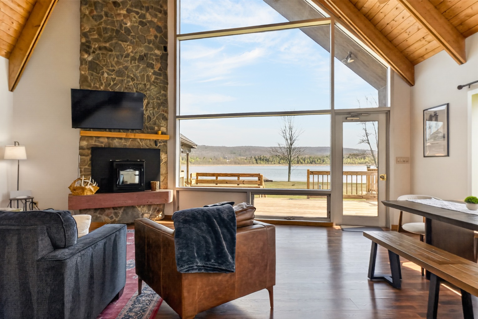 As you enter the home, you are immediately greeted by stunning lake views. The main level features a bunk room with a full-over-queen bed, a full bathroom, and an open-concept kitchen and living area—allowing you to stay connected with your group while preparing meals and enjoying the peaceful water views.
