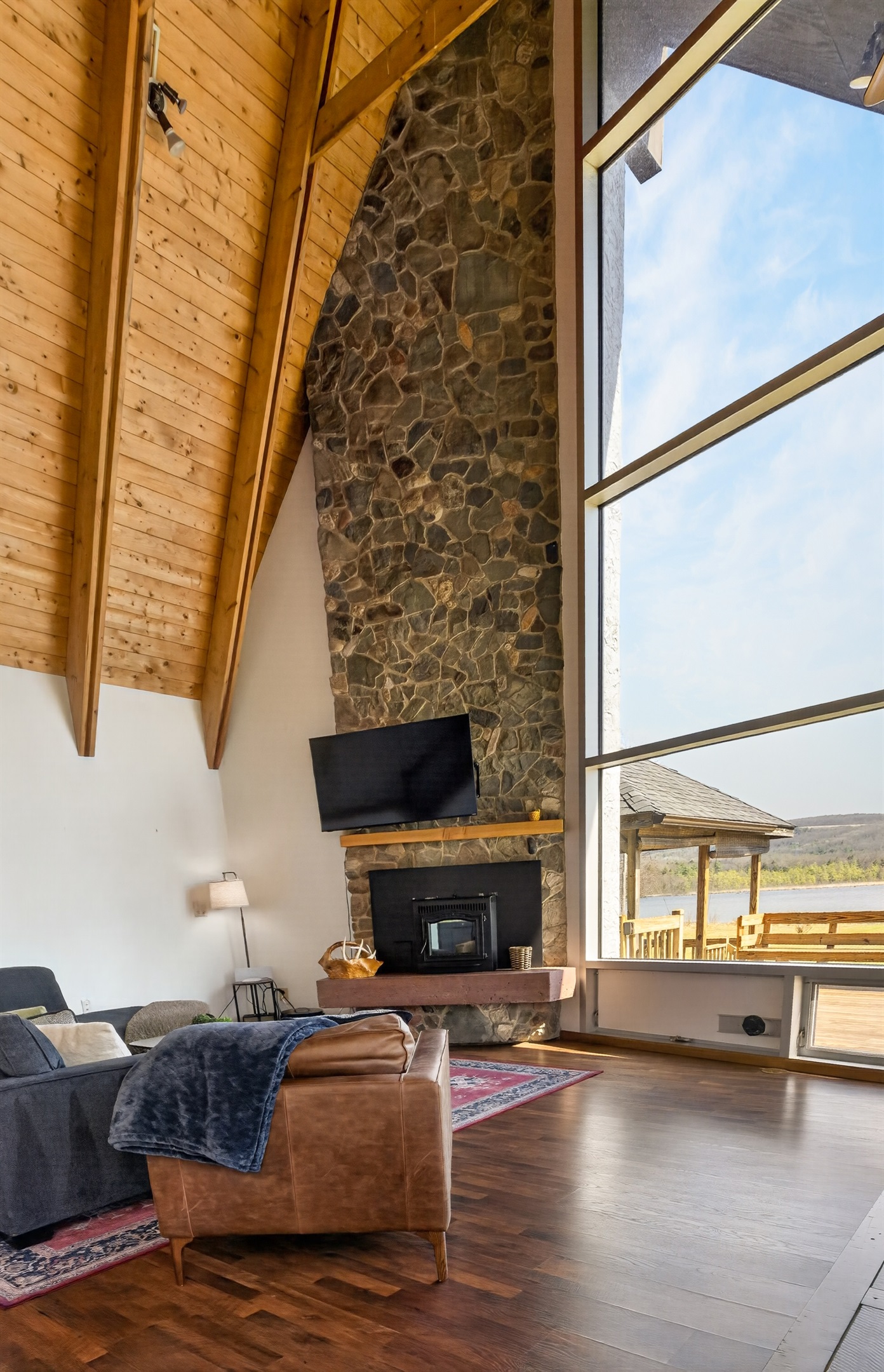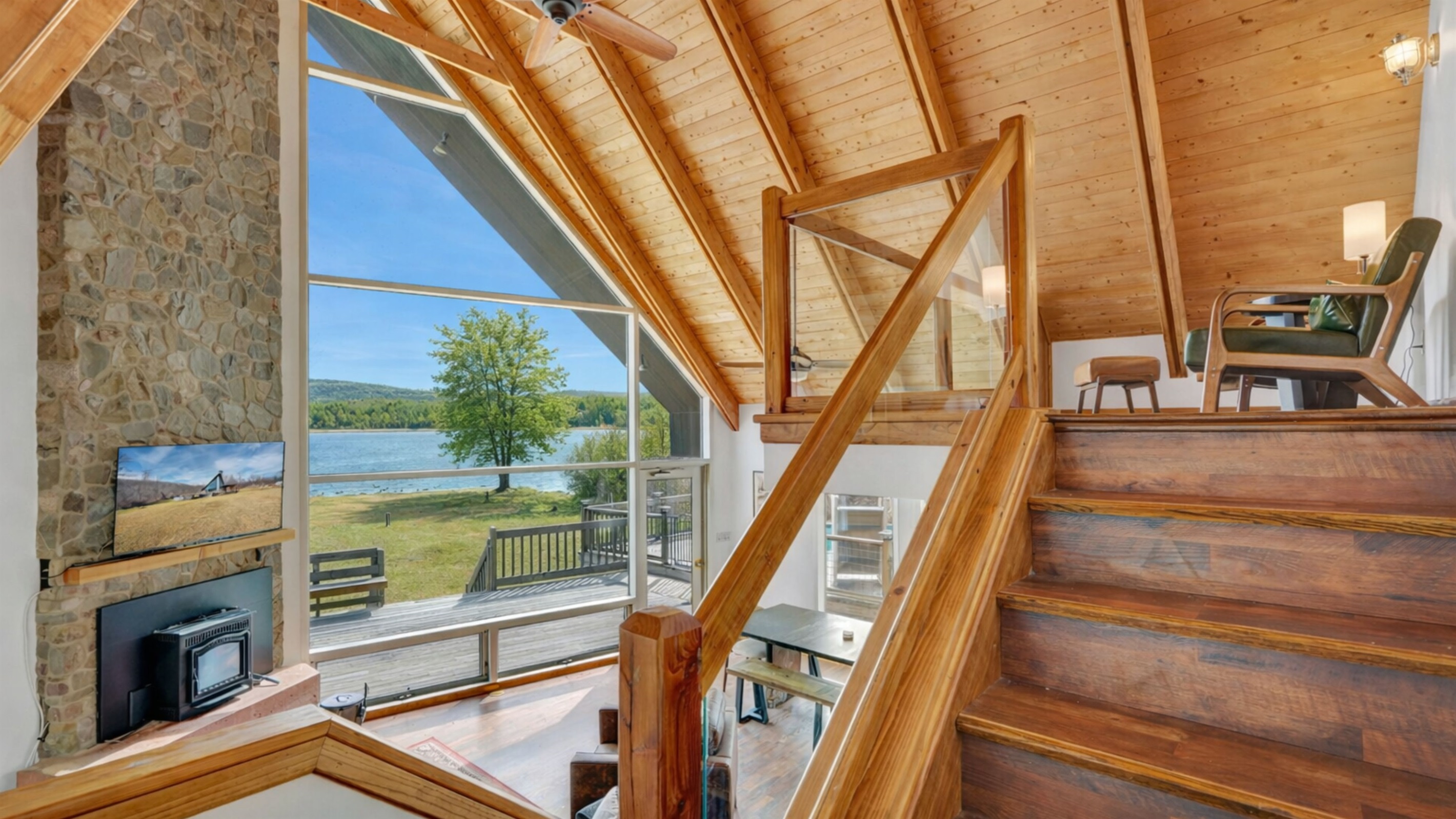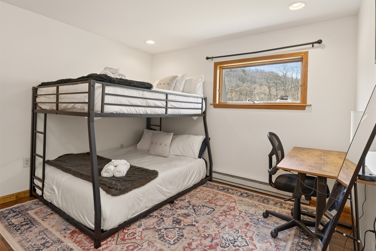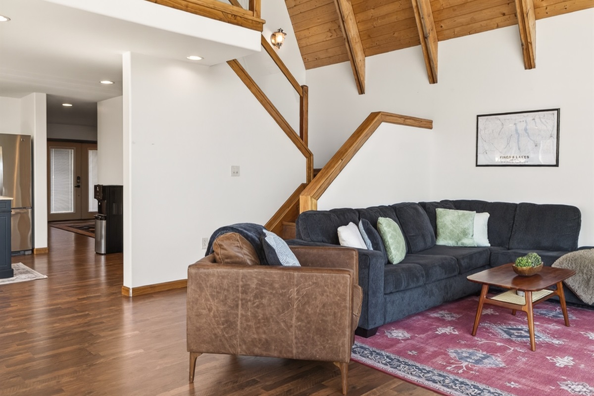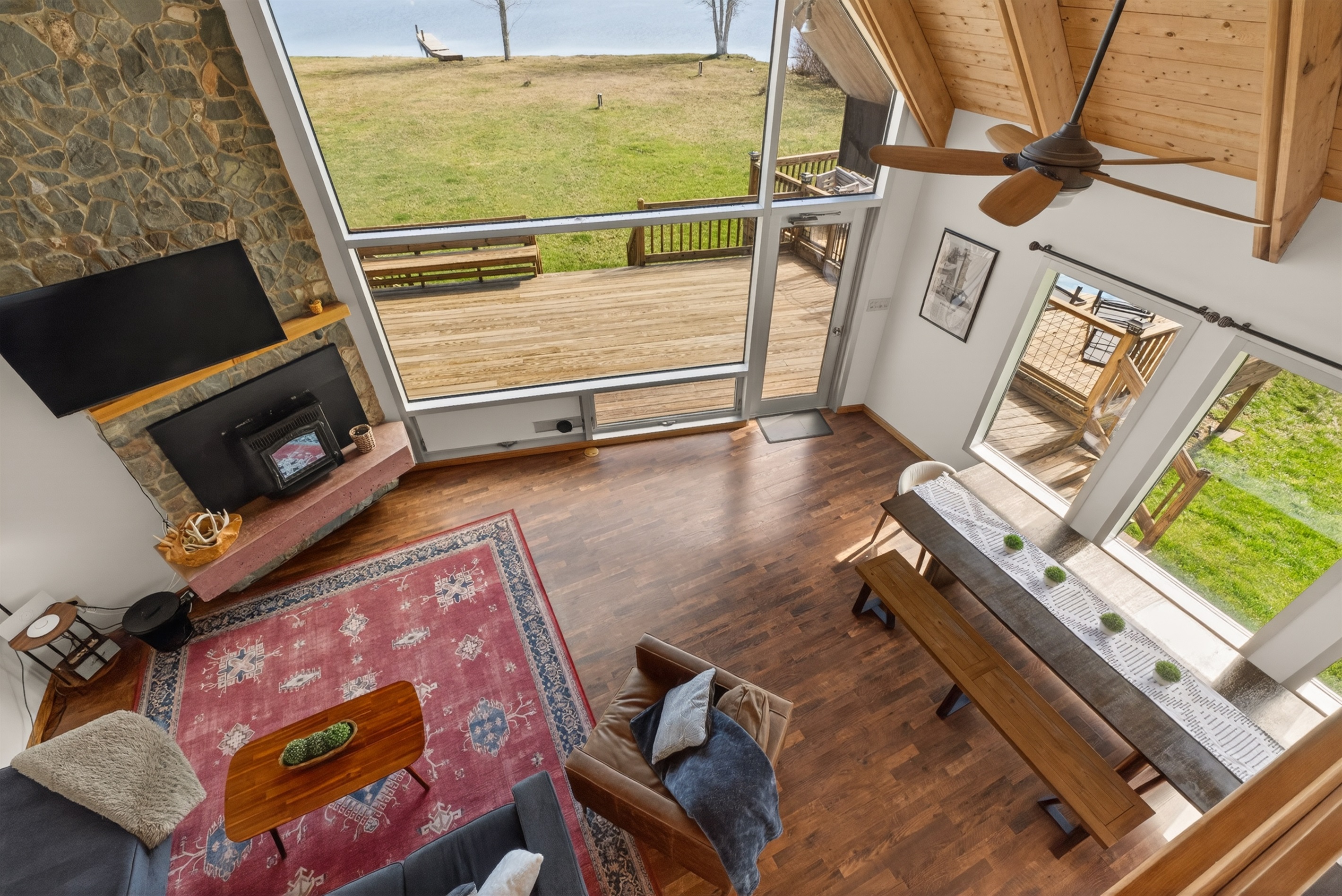 As you enter the home, you are immediately greeted by stunning lake views. The main level features a bunk room with a full-over-queen bed, a full bathroom, and an open-concept kitchen and living area—allowing you to stay connected with your group while preparing meals and enjoying the peaceful water views.
