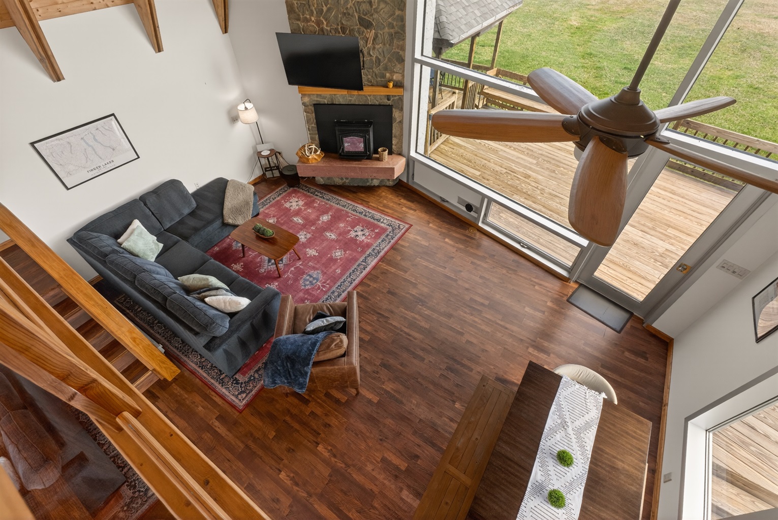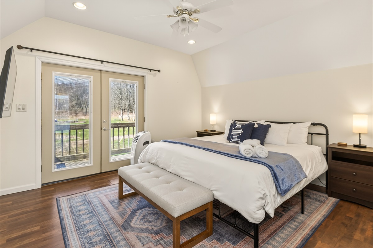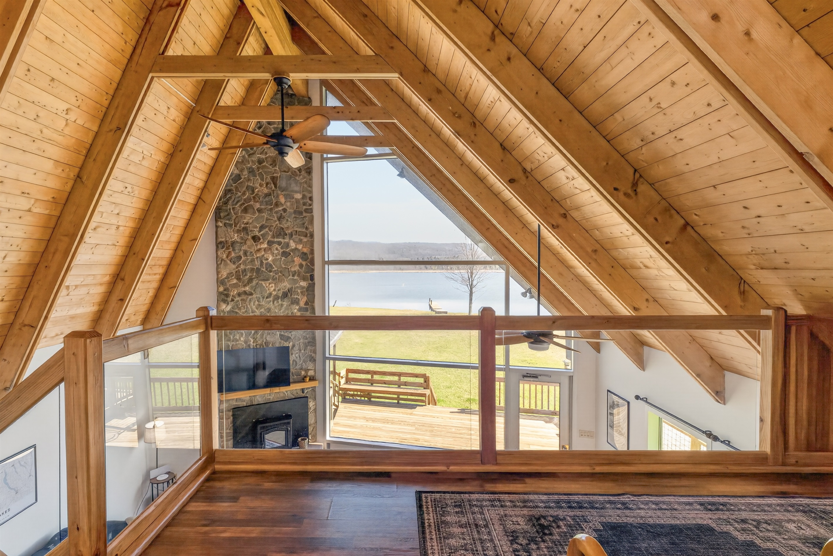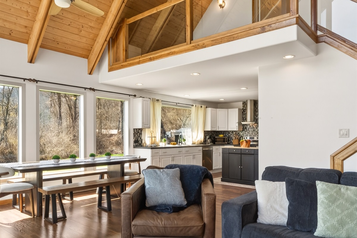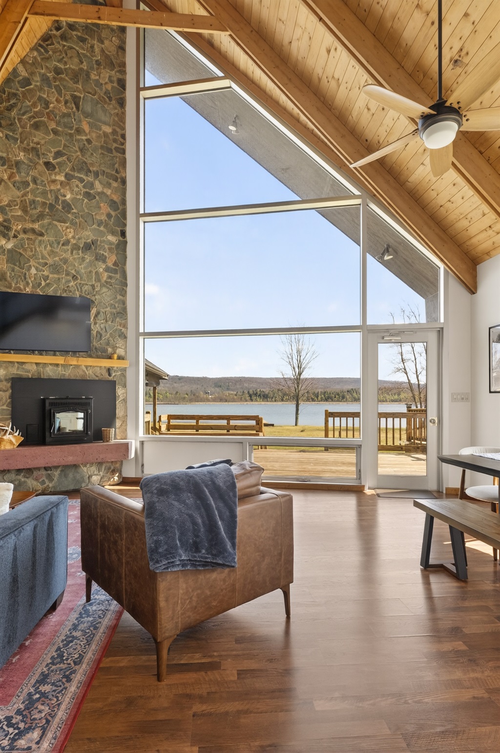 As you enter the home, you are immediately greeted by stunning lake views. The main level features a bunk room with a full-over-queen bed, a full bathroom, and an open-concept kitchen and living area—allowing you to stay connected with your group while preparing meals and enjoying the peaceful water views.