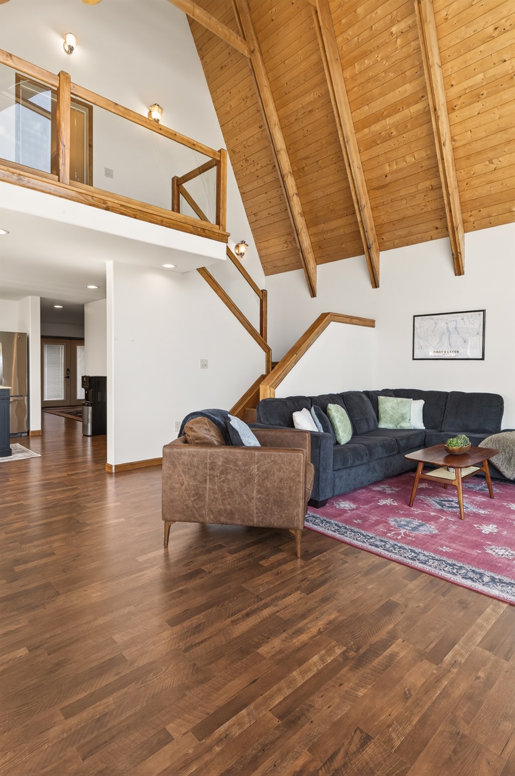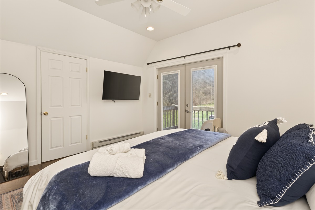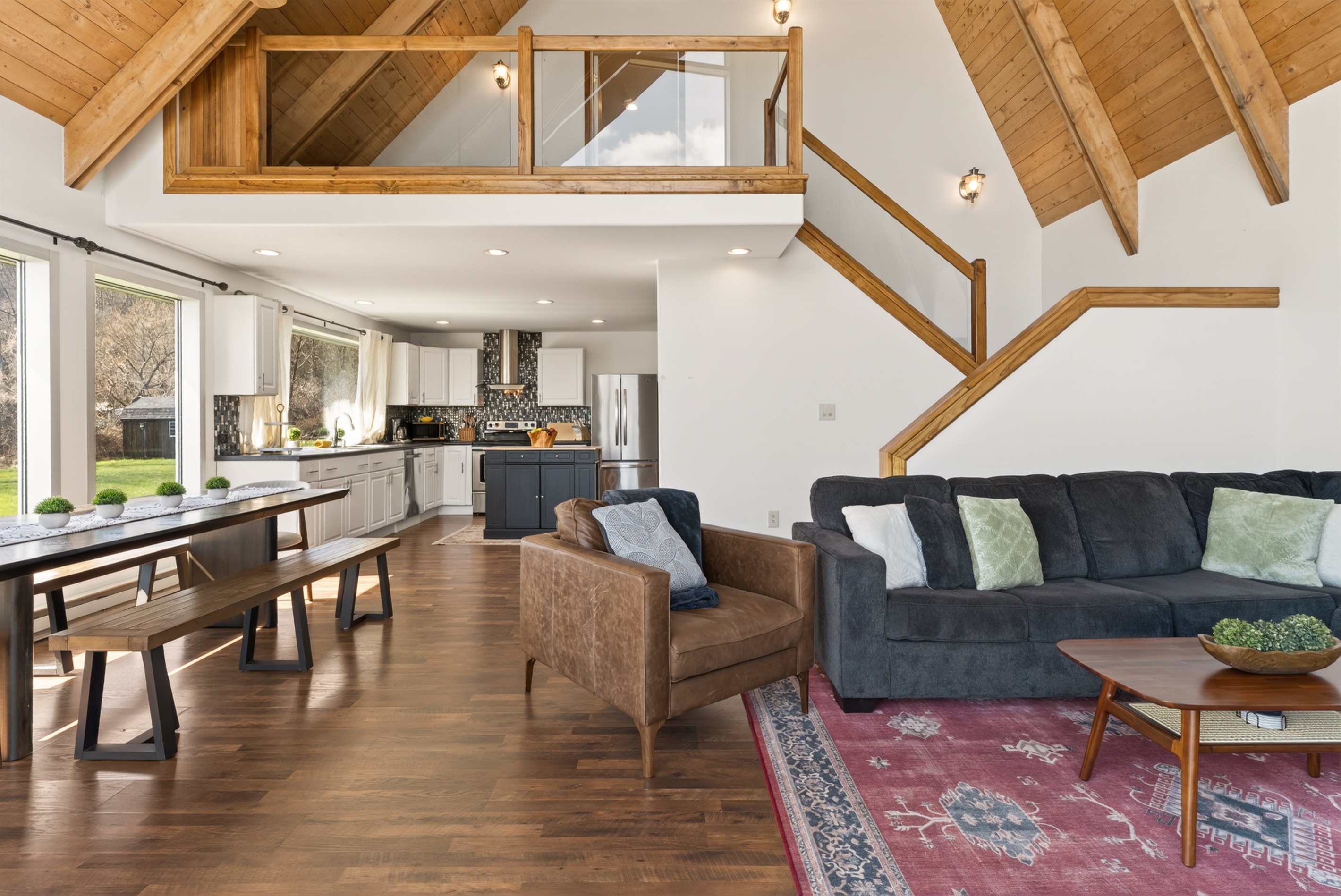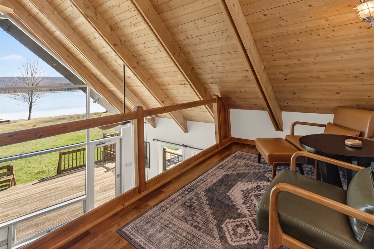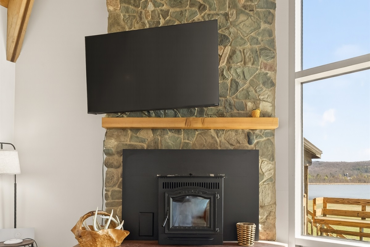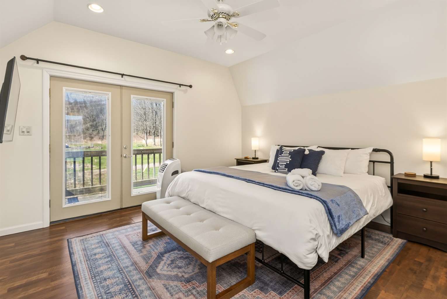 As you enter the home, you are immediately greeted by stunning lake views. The main level features a bunk room with a full-over-queen bed, a full bathroom, and an open-concept kitchen and living area—allowing you to stay connected with your group while preparing meals and enjoying the peaceful water views.