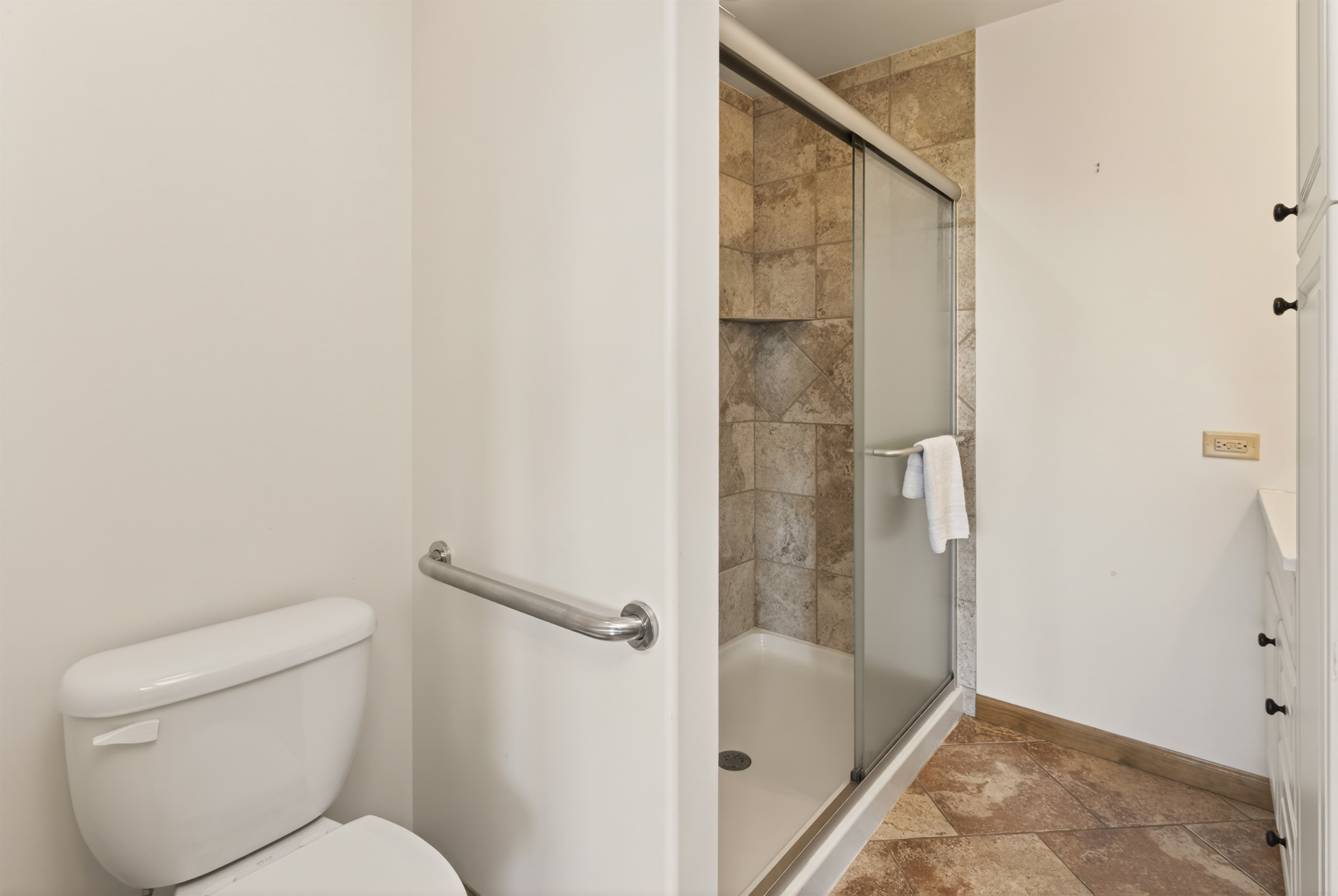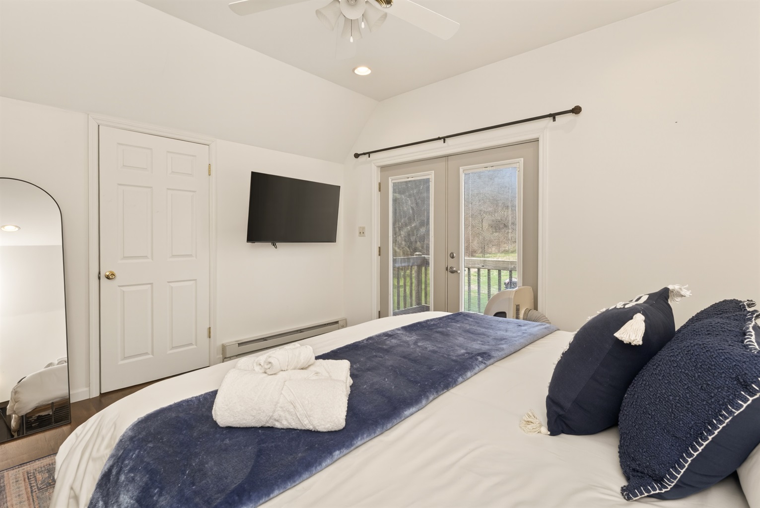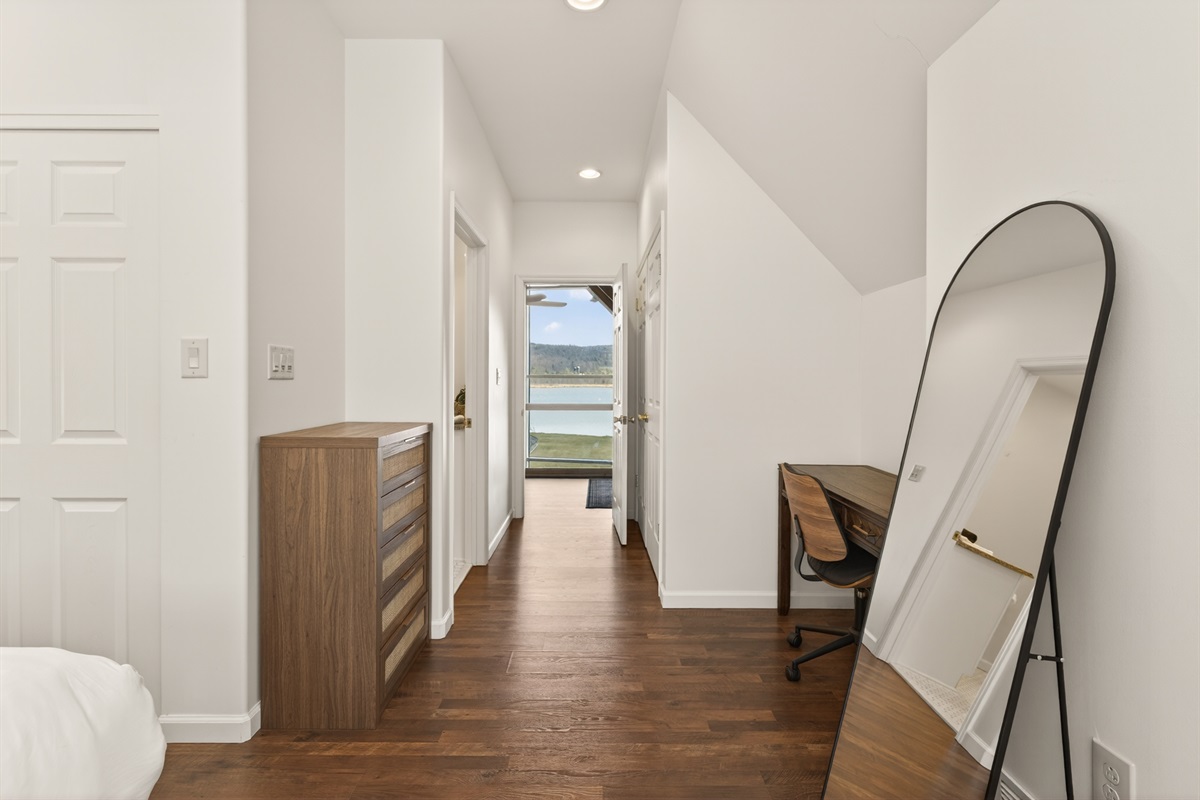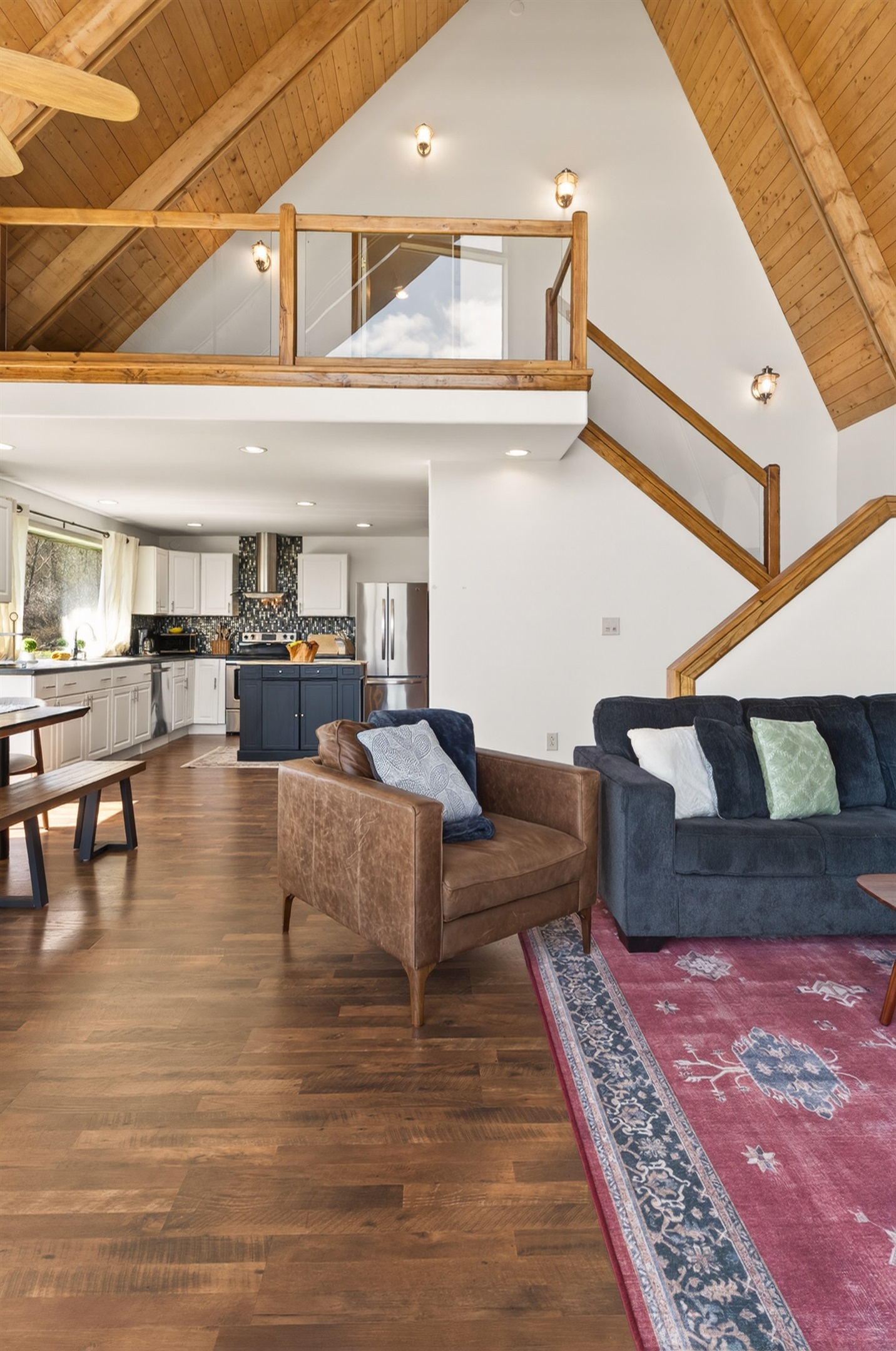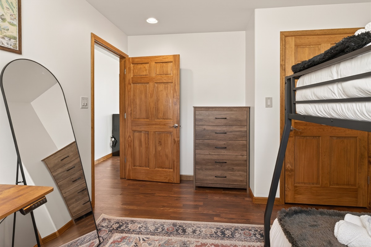 As you enter the home, you are immediately greeted by stunning lake views. The main level features a bunk room with a full-over-queen bed, a full bathroom, and an open-concept kitchen and living area—allowing you to stay connected with your group while preparing meals and enjoying the peaceful water views.