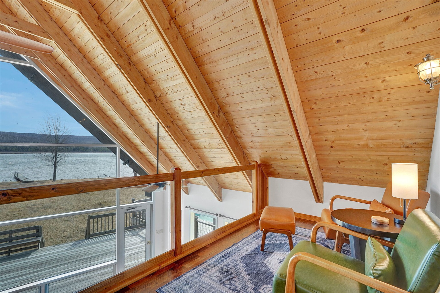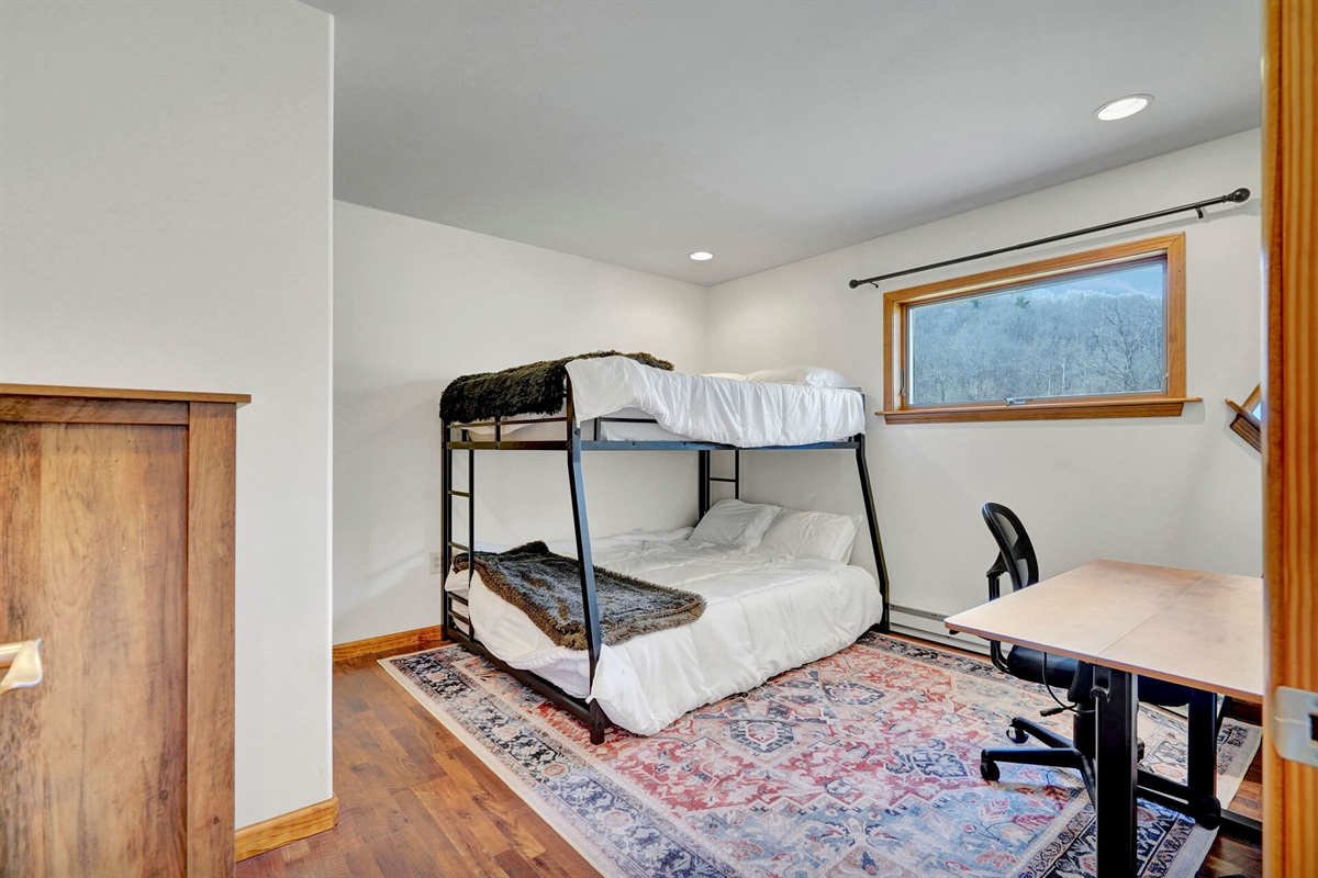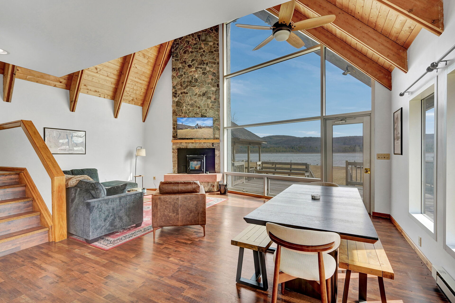 As you enter the home, you are immediately greeted by stunning lake views. The main level features a bunk room with a full-over-queen bed, a full bathroom, and an open-concept kitchen and living area—allowing you to stay connected with your group while preparing meals and enjoying the peaceful water views.