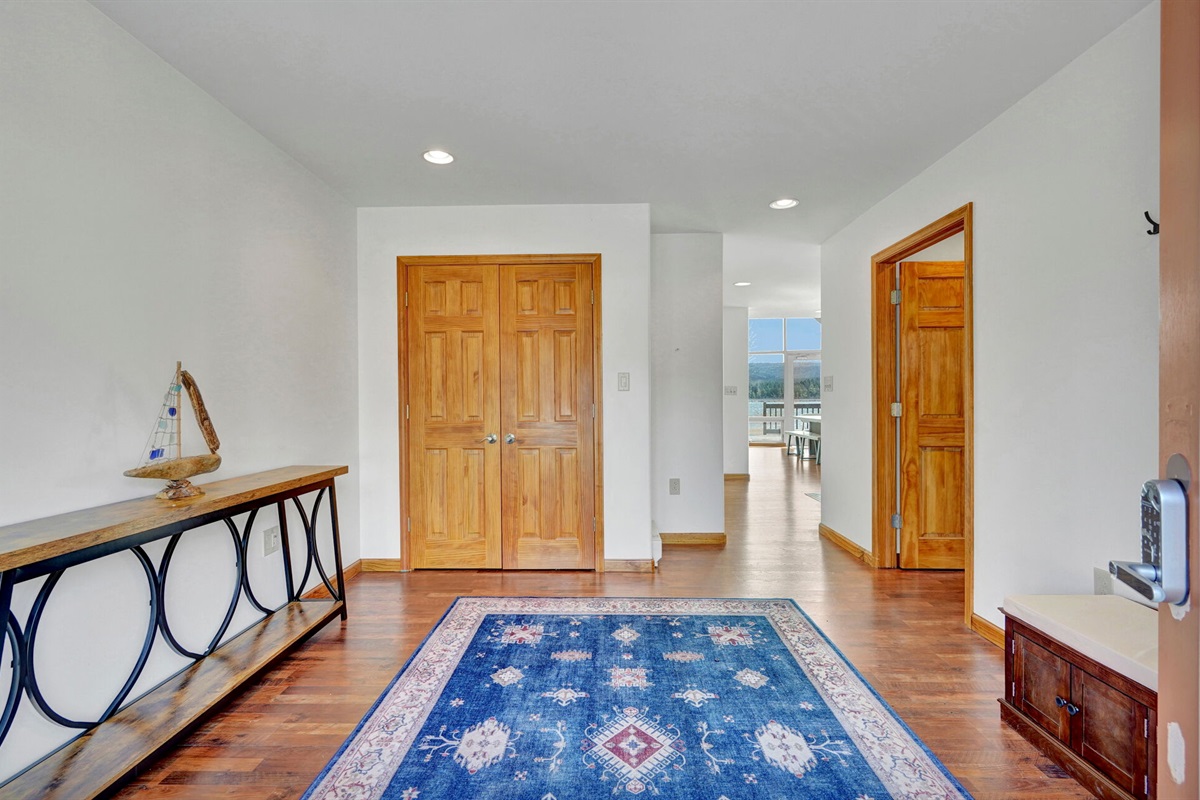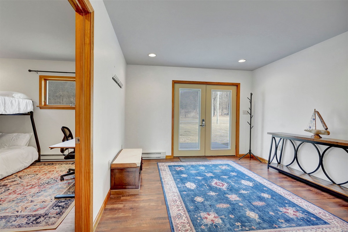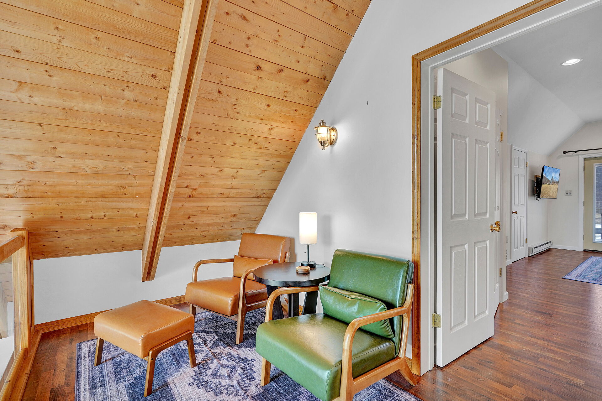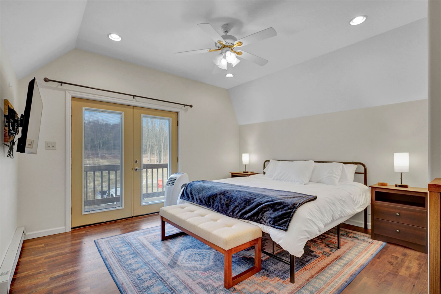 As you enter the home, you are immediately greeted by stunning lake views. The main level features a bunk room with a full-over-queen bed, a full bathroom, and an open-concept kitchen and living area—allowing you to stay connected with your group while preparing meals and enjoying the peaceful water views.