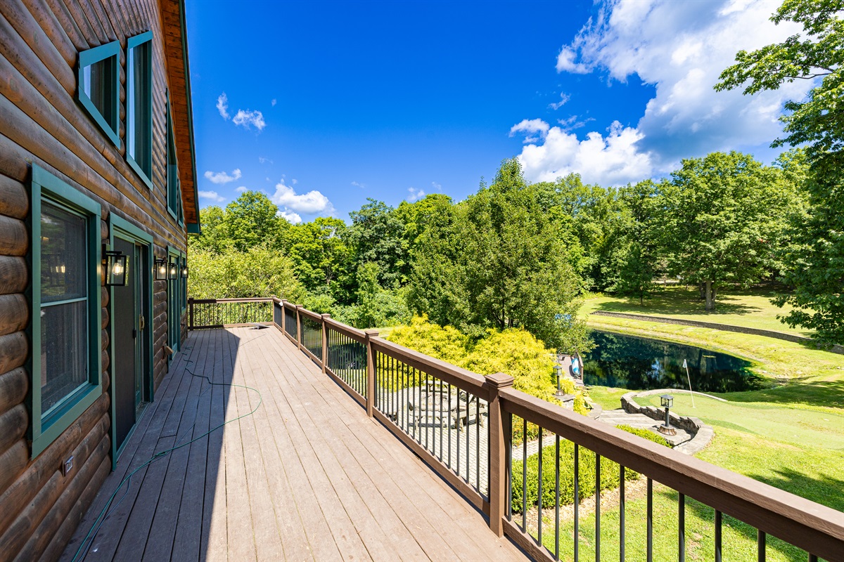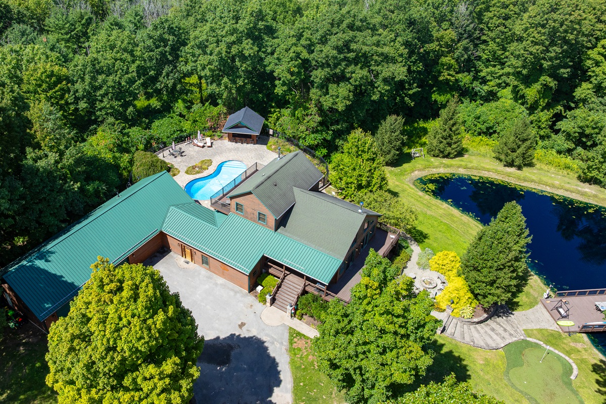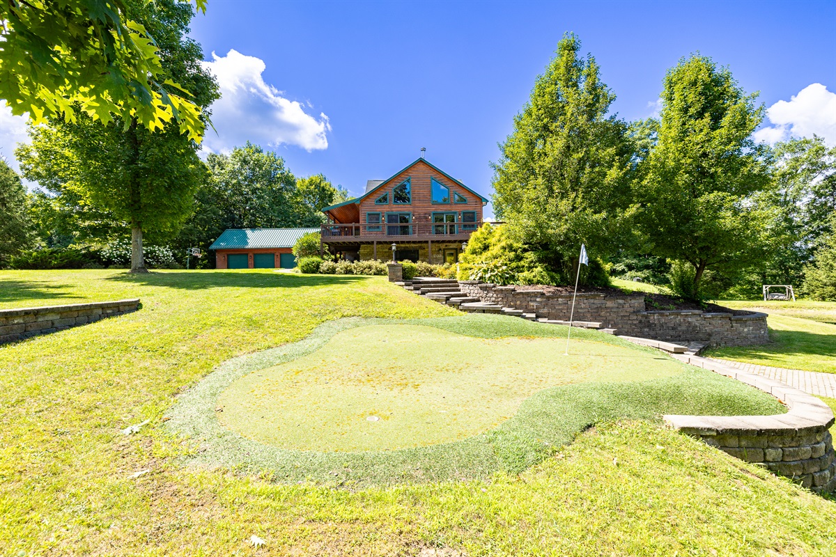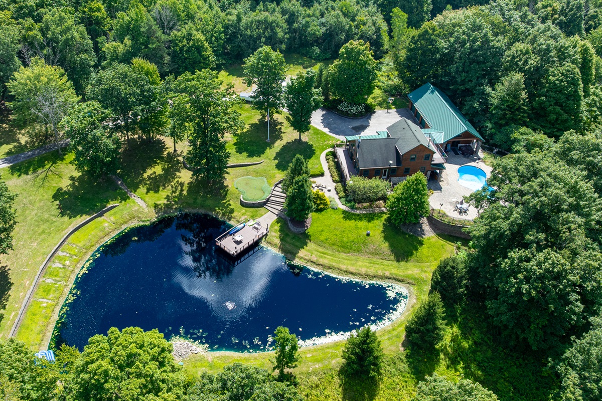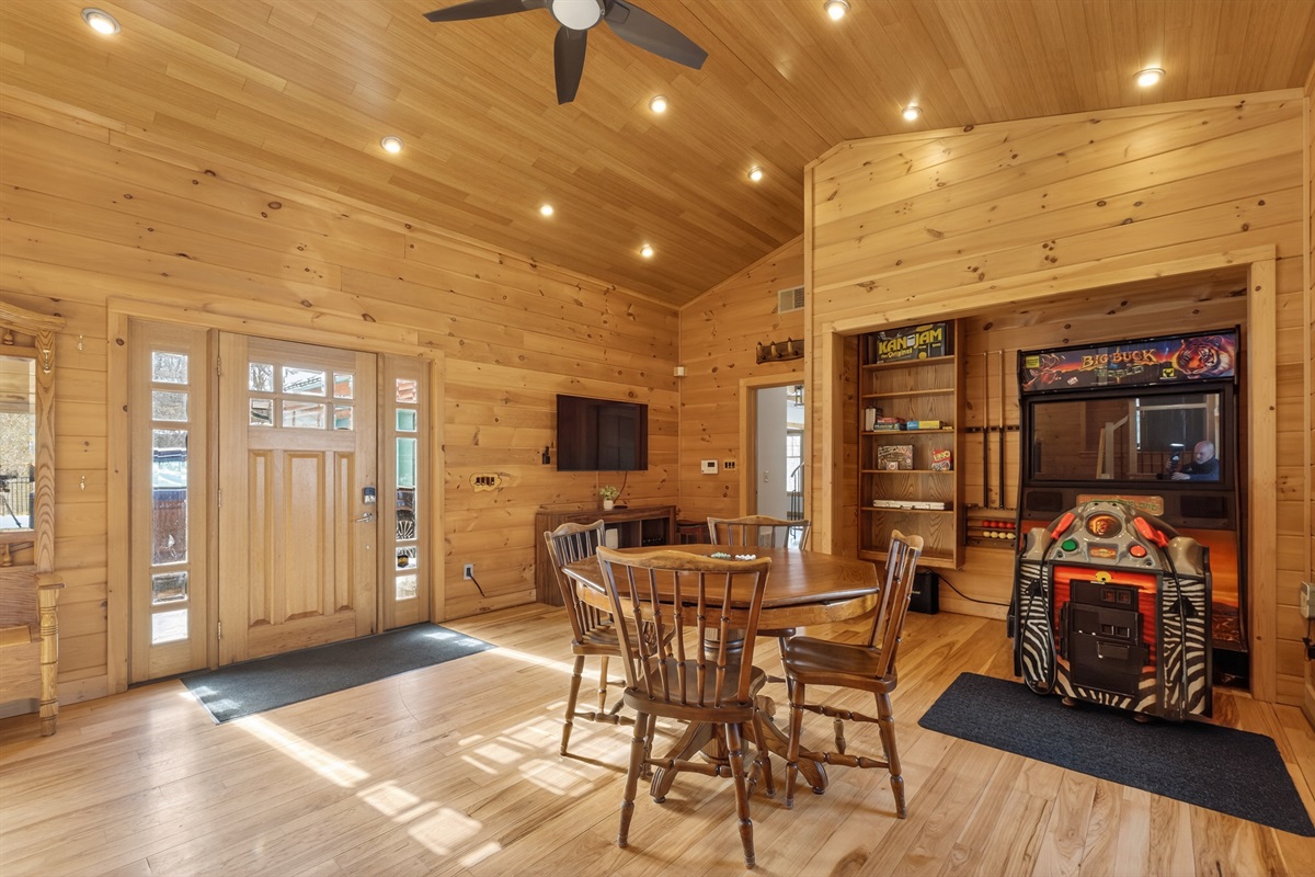 Enjoy a seasonal heated in-ground pool, hot tub, tiki bar, putting green, fire pit, and pond for catch-and-release fishing. Inside, the game room offers Buck Hunter, classic arcade games, a 3-in-1 game table, and a 65-inch TV for fun in any weather.