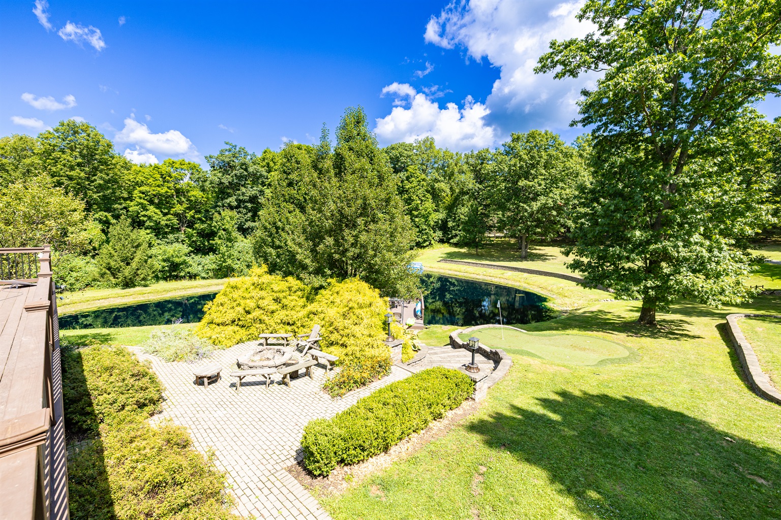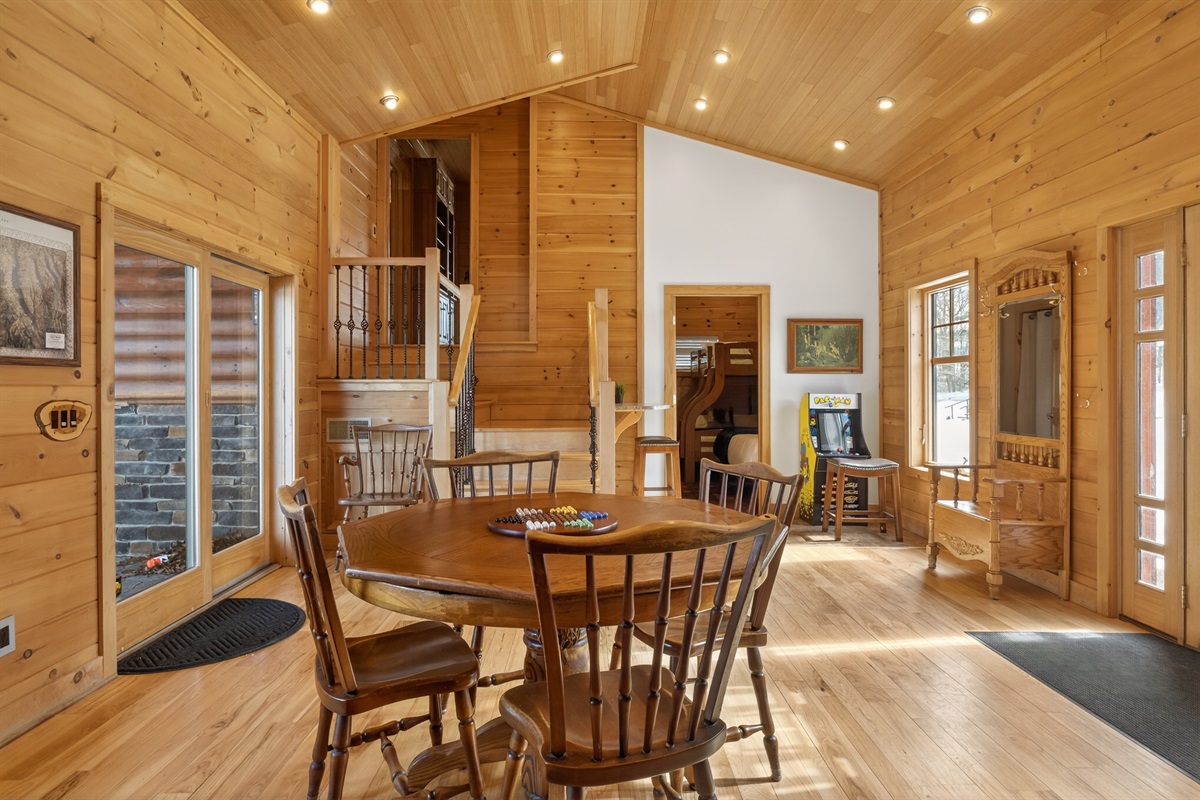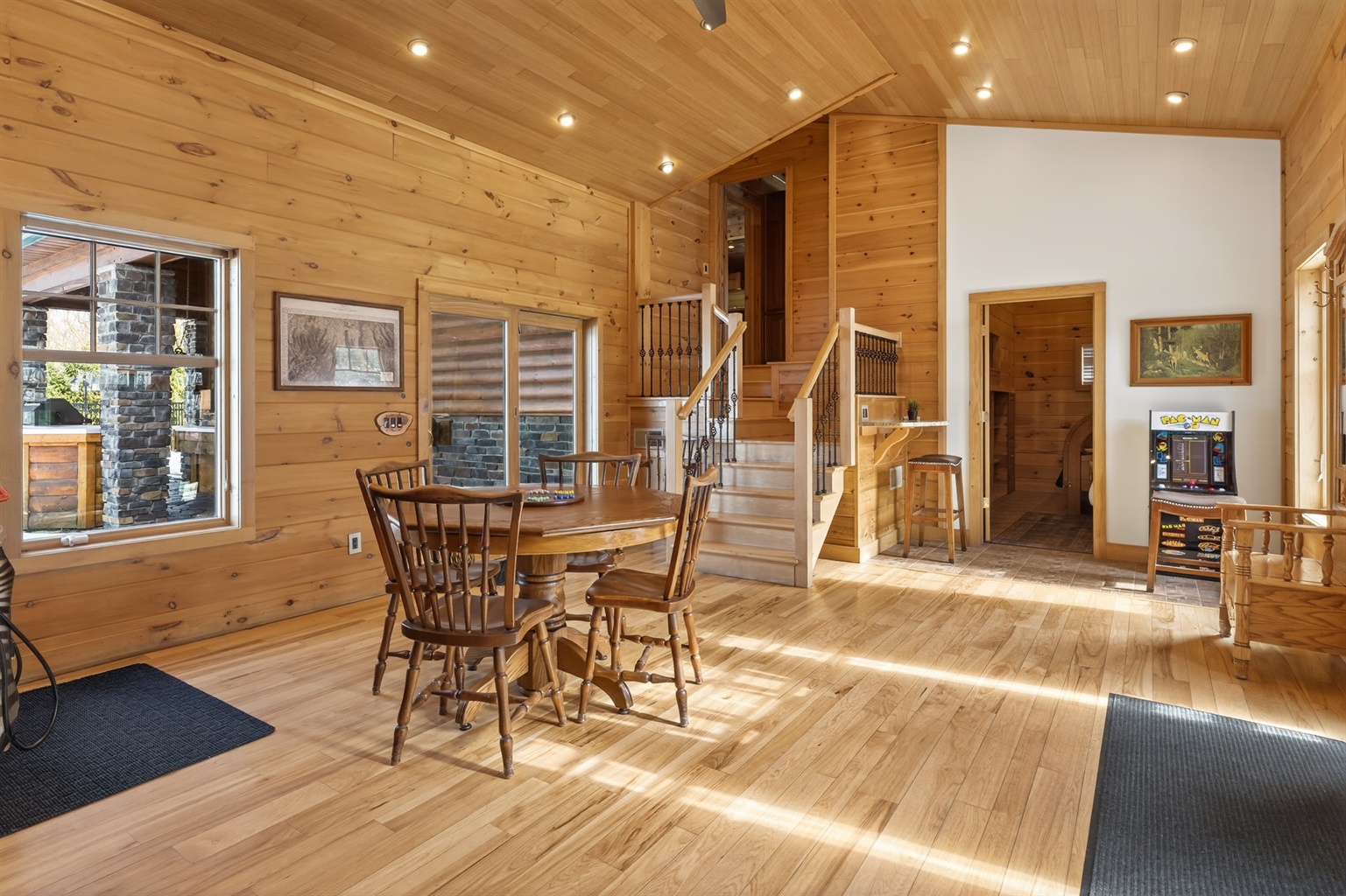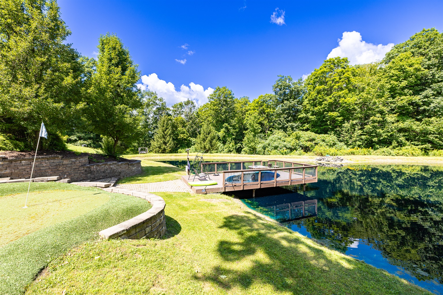 Enjoy a seasonal heated in-ground pool, hot tub, tiki bar, putting green, fire pit, and pond for catch-and-release fishing. Inside, the game room offers Buck Hunter, classic arcade games, a 3-in-1 game table, and a 65-inch TV for fun in any weather.