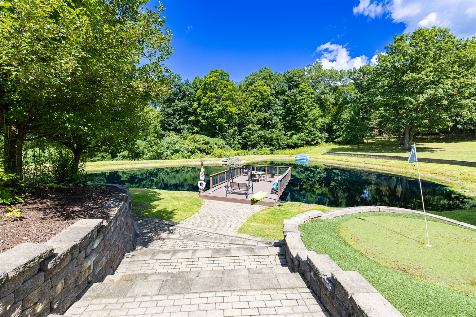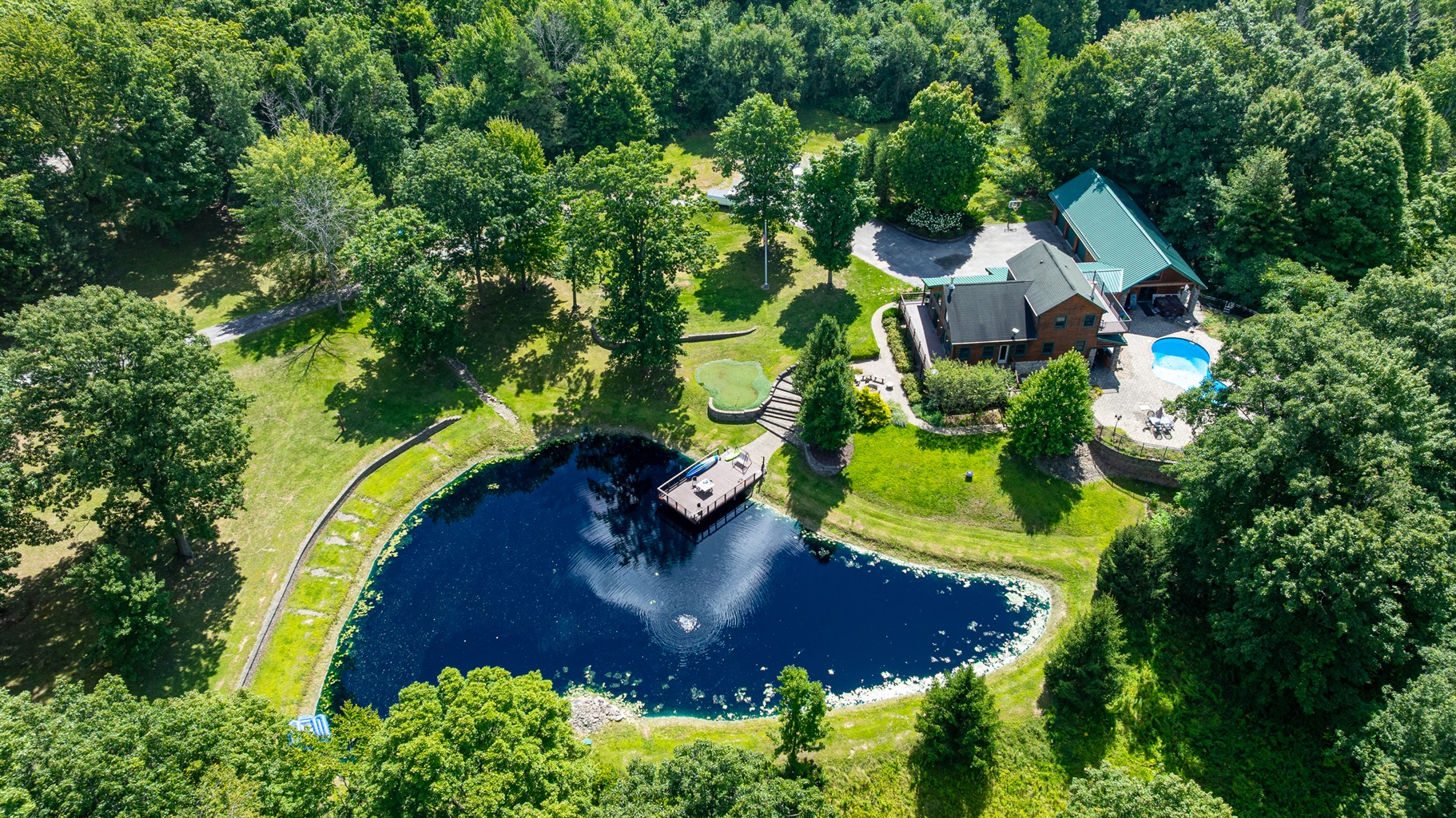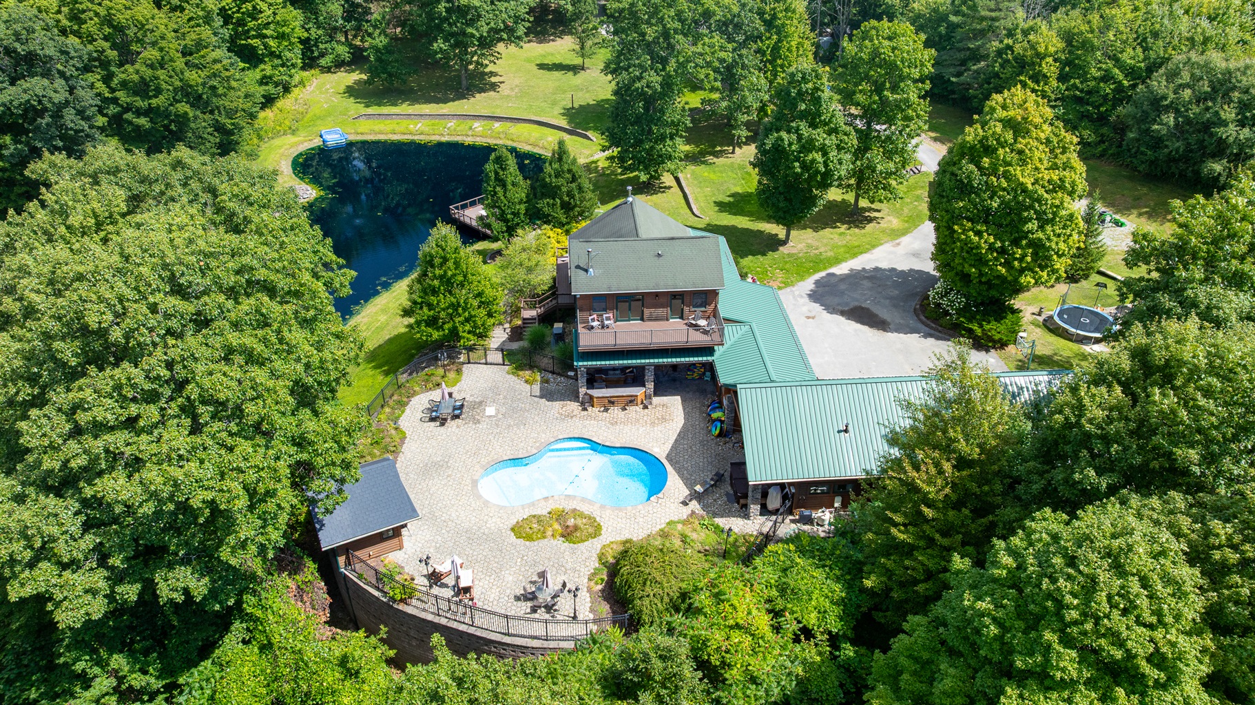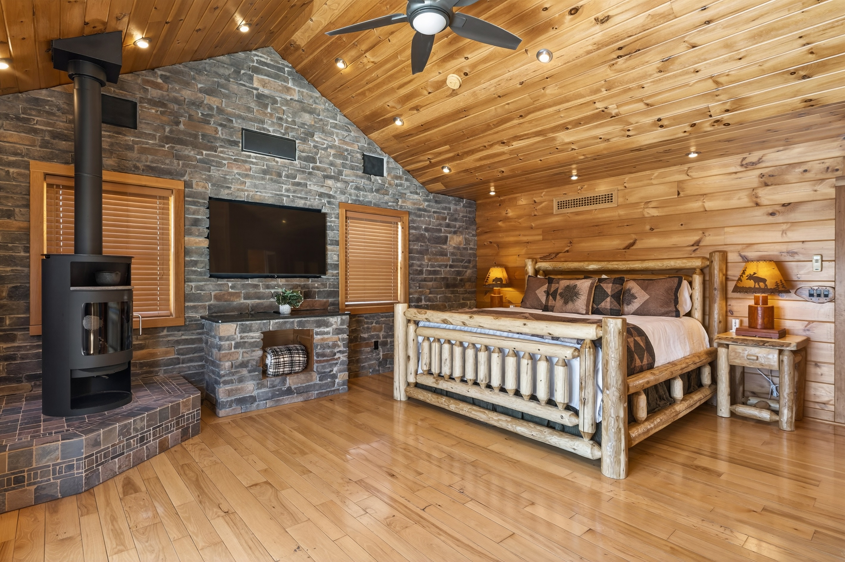Enjoy a seasonal heated in-ground pool, hot tub, tiki bar, putting green, fire pit, and pond for catch-and-release fishing. Inside, the game room offers Buck Hunter, classic arcade games, a 3-in-1 game table, and a 65-inch TV for fun in any weather.