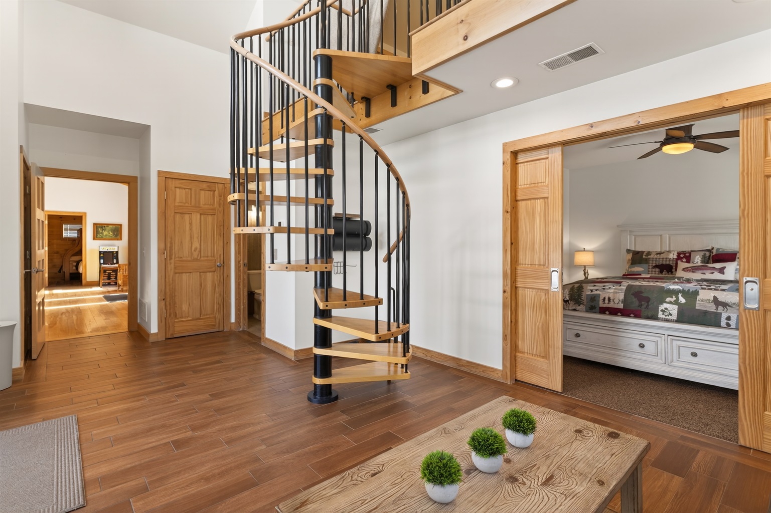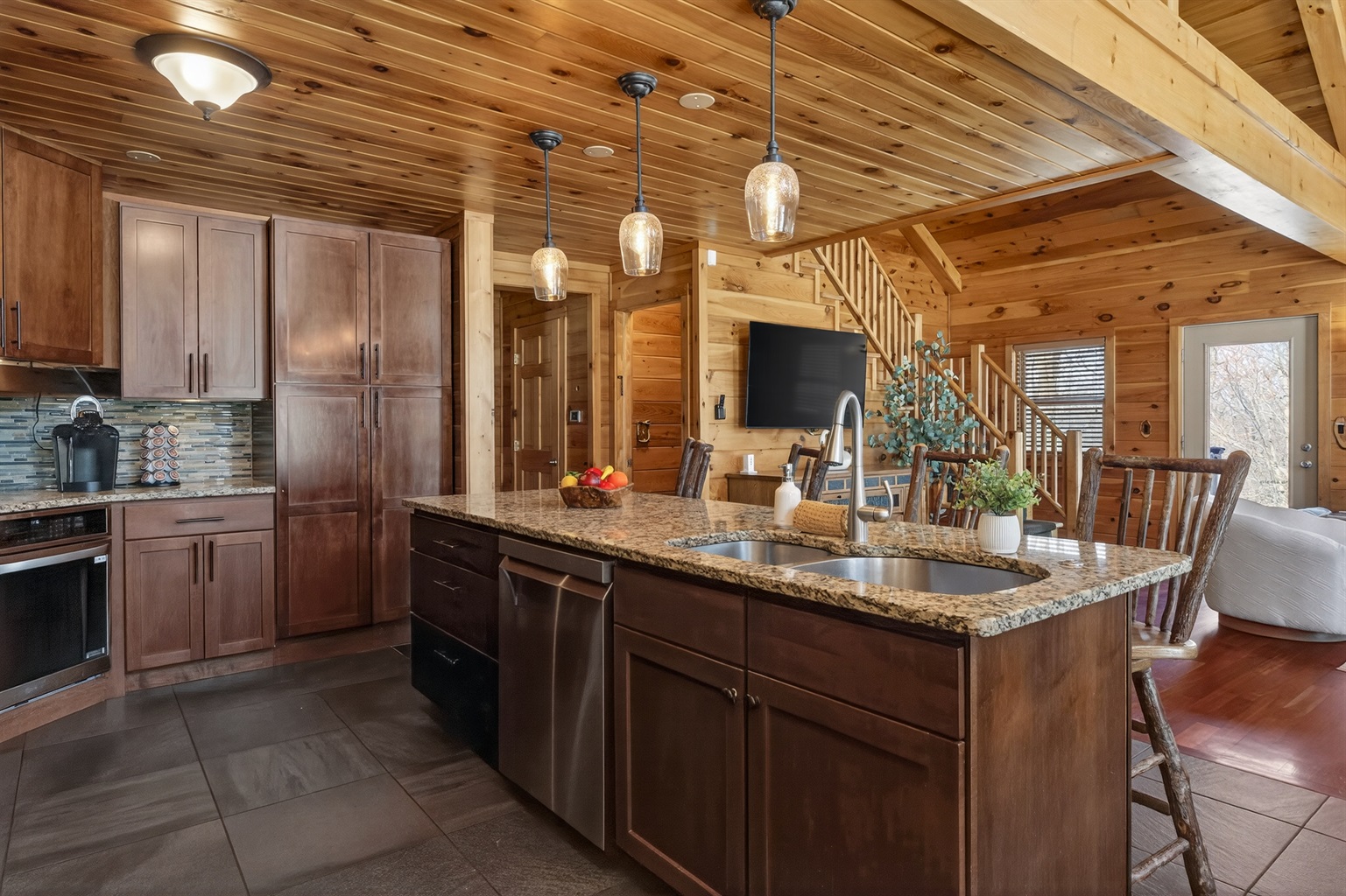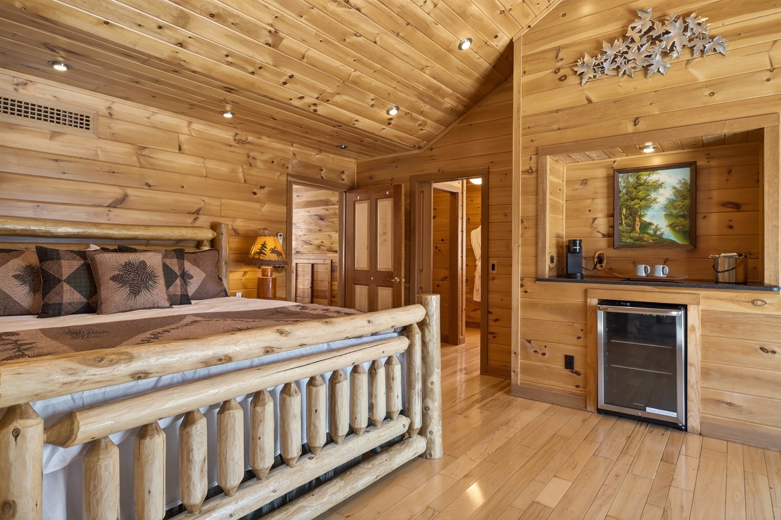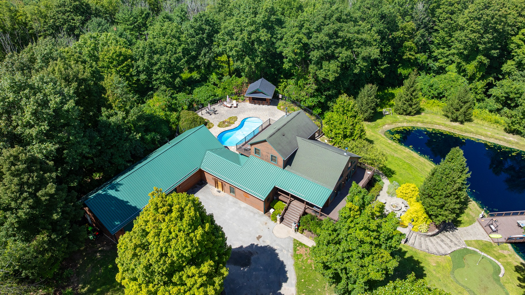 Enjoy a seasonal heated in-ground pool, hot tub, tiki bar, putting green, fire pit, and pond for catch-and-release fishing. Inside, the game room offers Buck Hunter, classic arcade games, a 3-in-1 game table, and a 65-inch TV for fun in any weather.