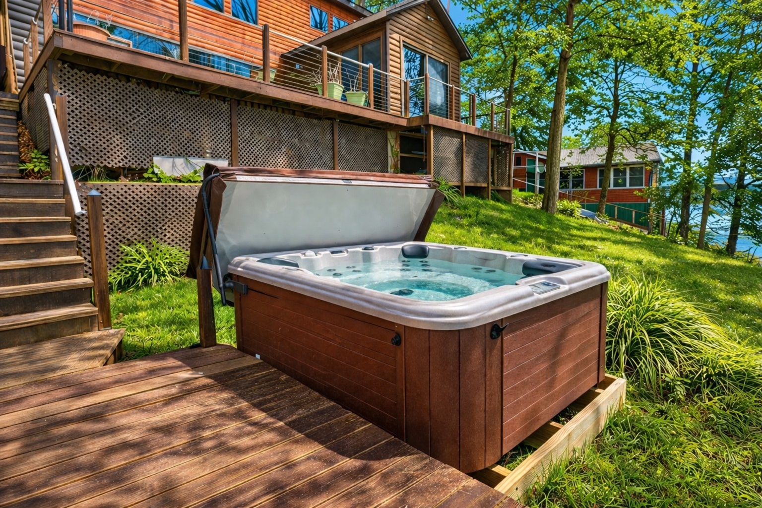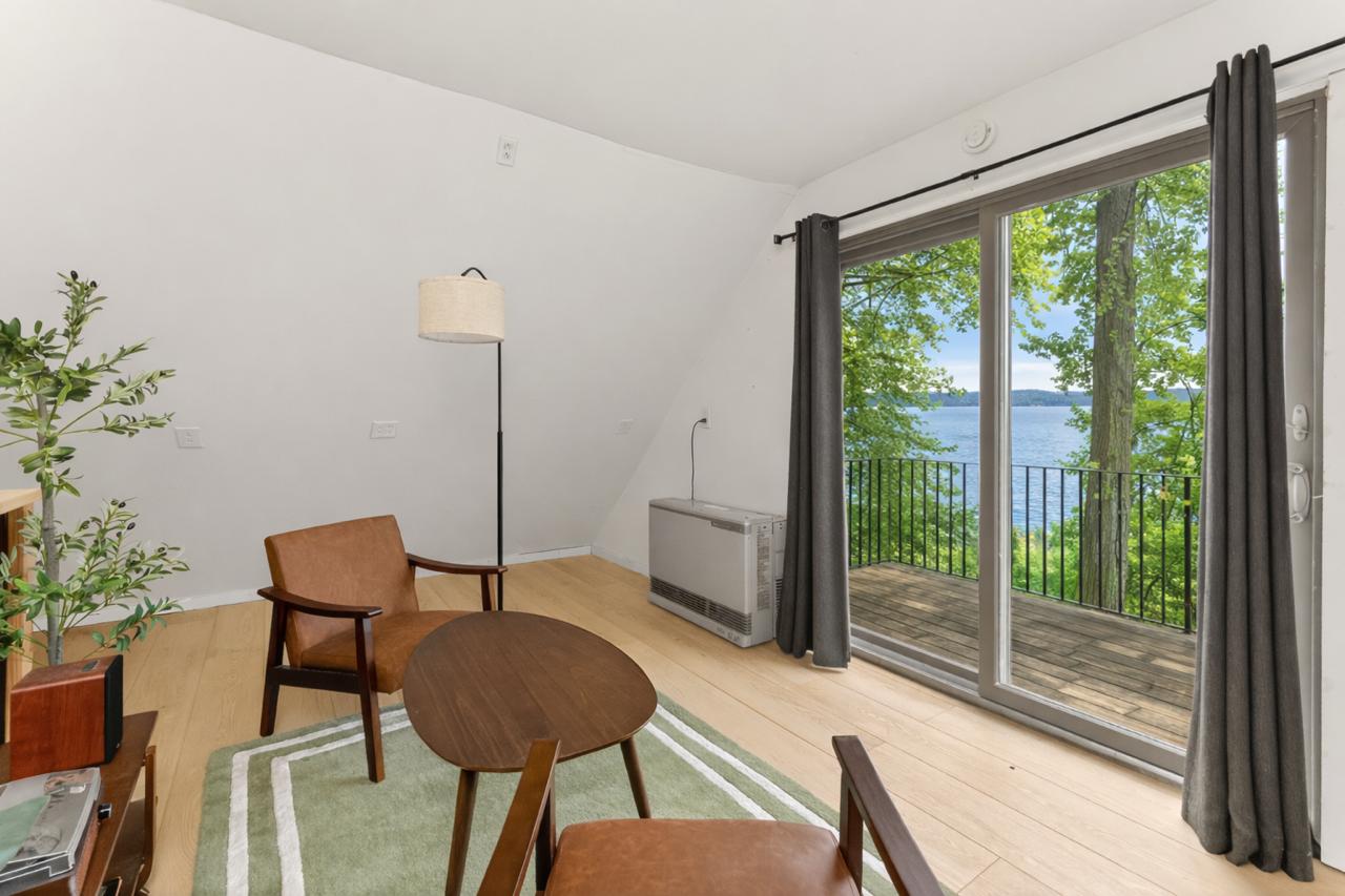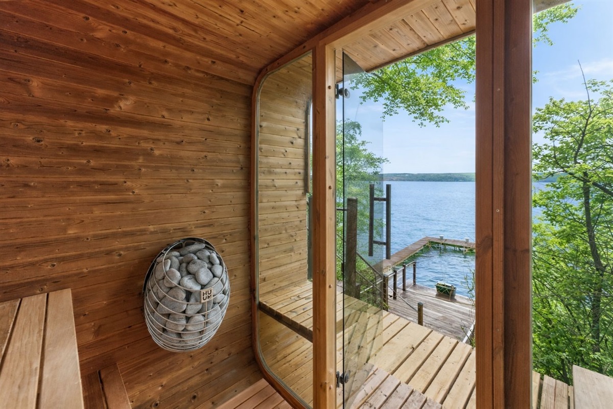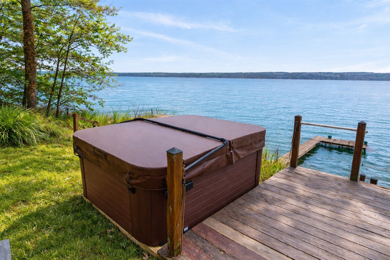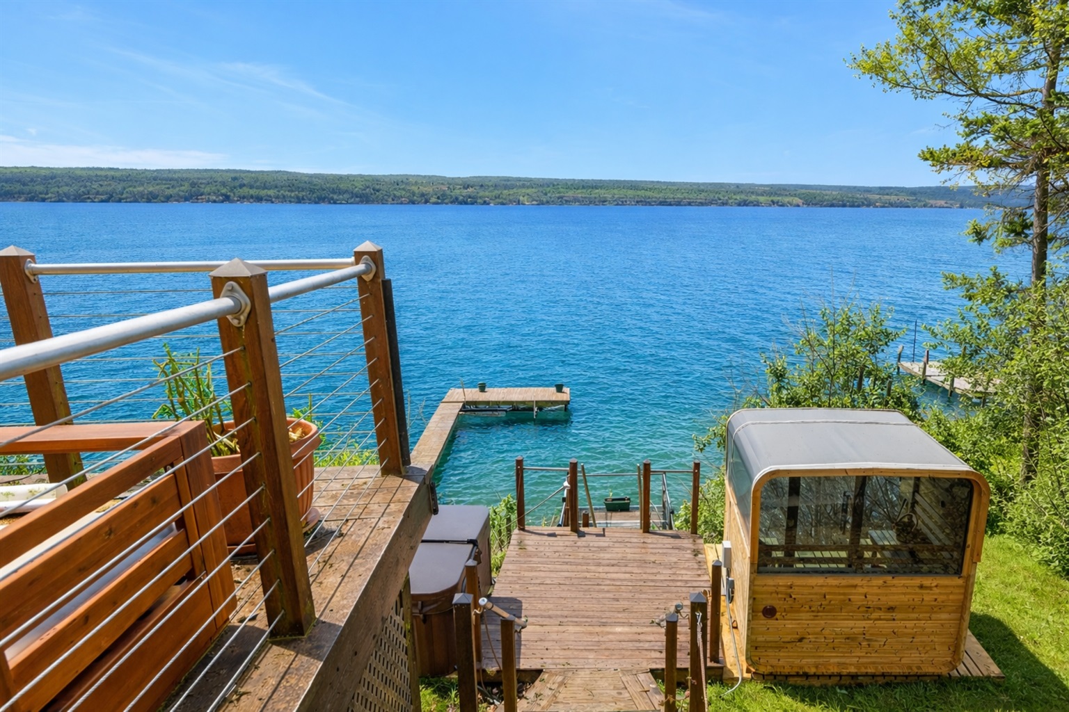 Outside, the property offers direct lakefront access along with multiple spaces to unwind. Guests can enjoy the hot tub overlooking the water, relax in the barrel sauna, or take in the views from the deck. The setting is quiet and scenic, making it easy to spend most of your time right on the property.