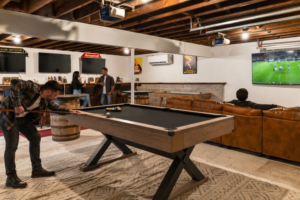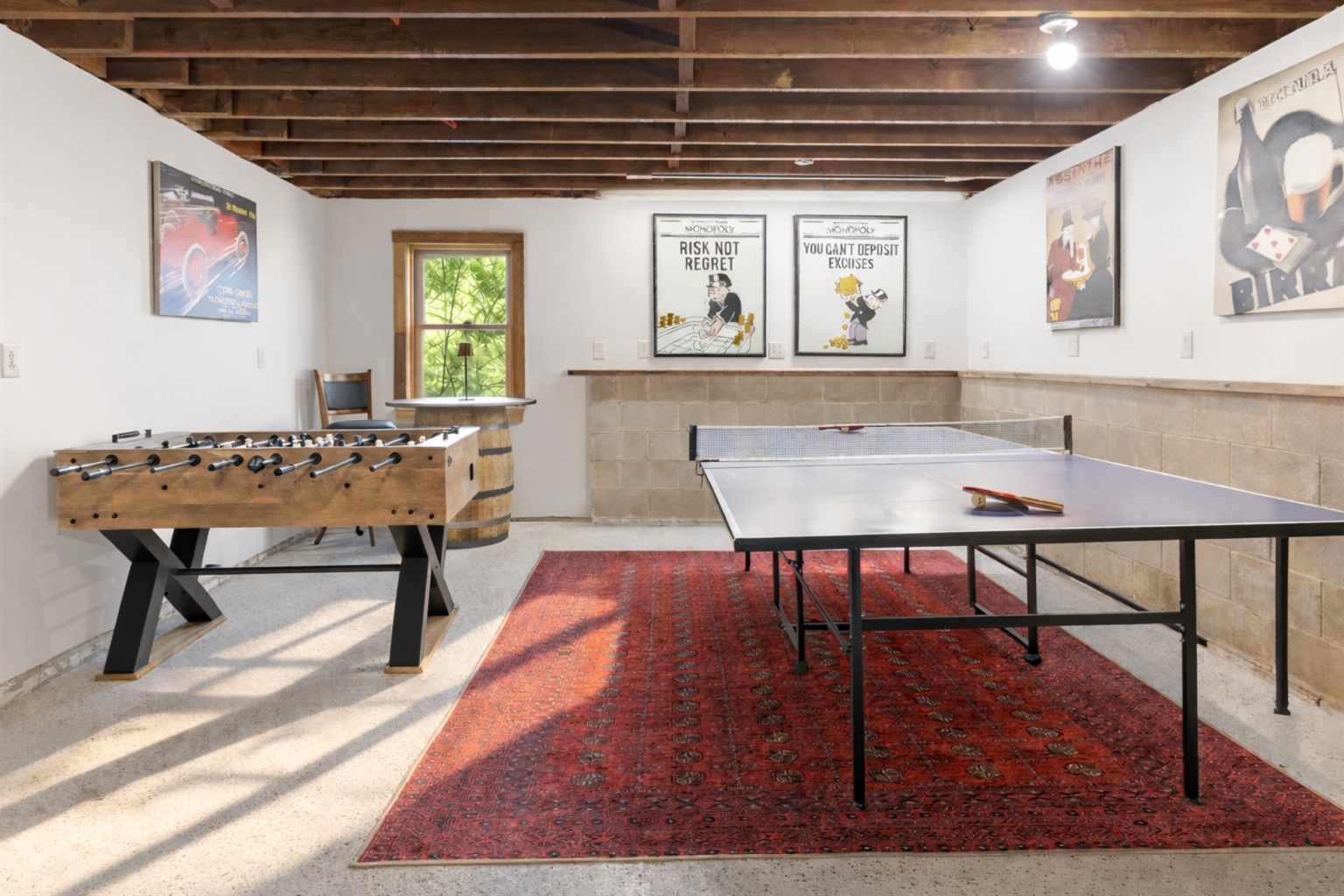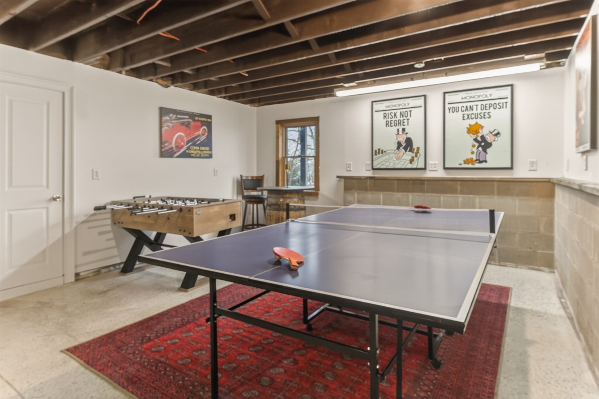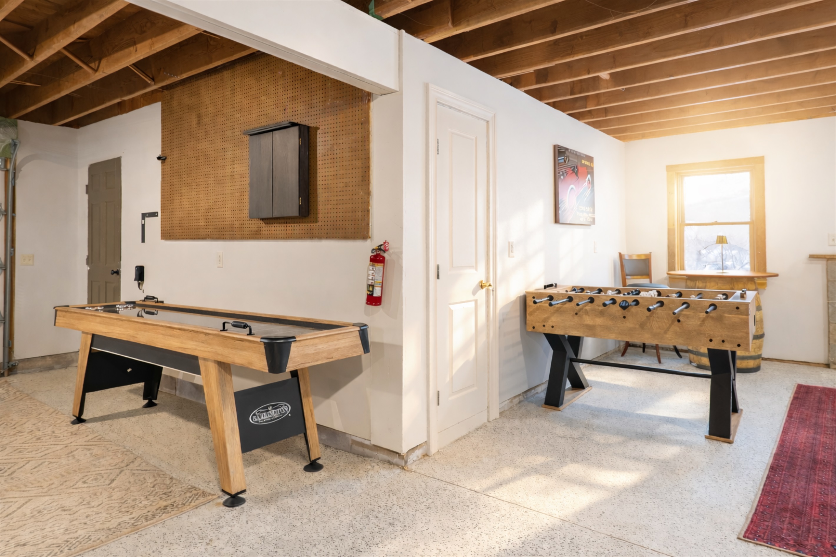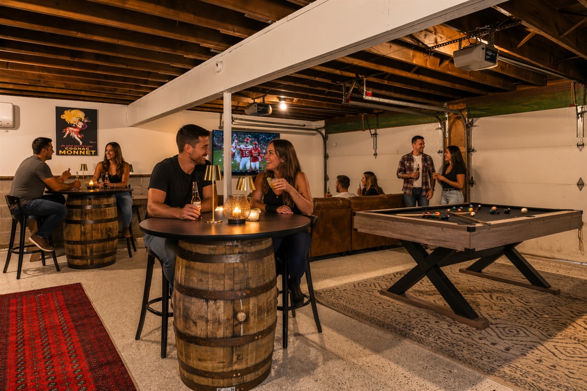 The detached garage adds flexible sleeping and a large entertainment area. Upstairs, there is a king bed in an open layout without a door, along with a twin bed in a shared common space. There is also a full bathroom and an expansive game room with a pool table, ping pong, shuffleboard, foosball, air hockey, a poker table, and a bar. Washer and dryer access is located in the garage.