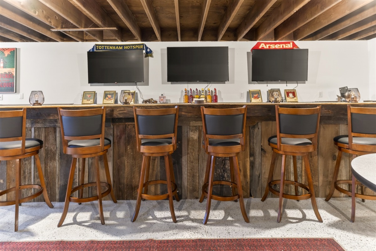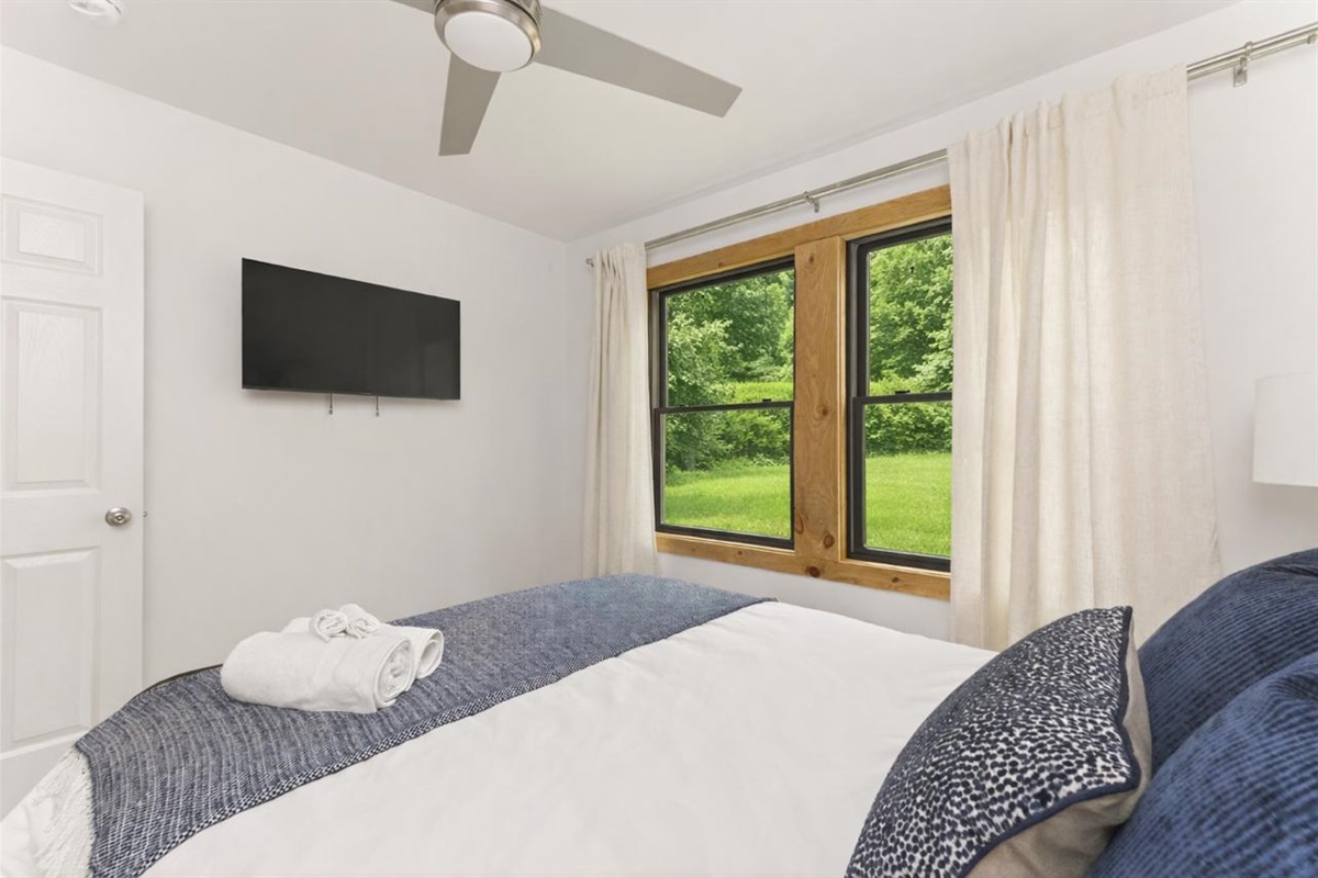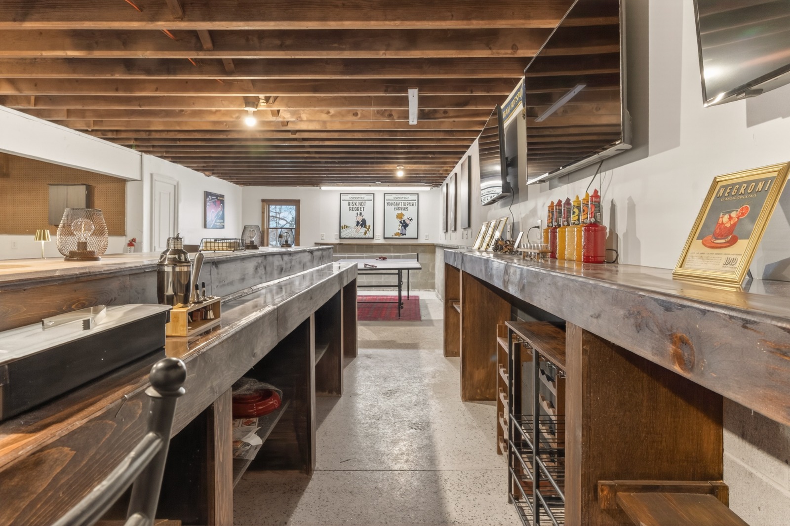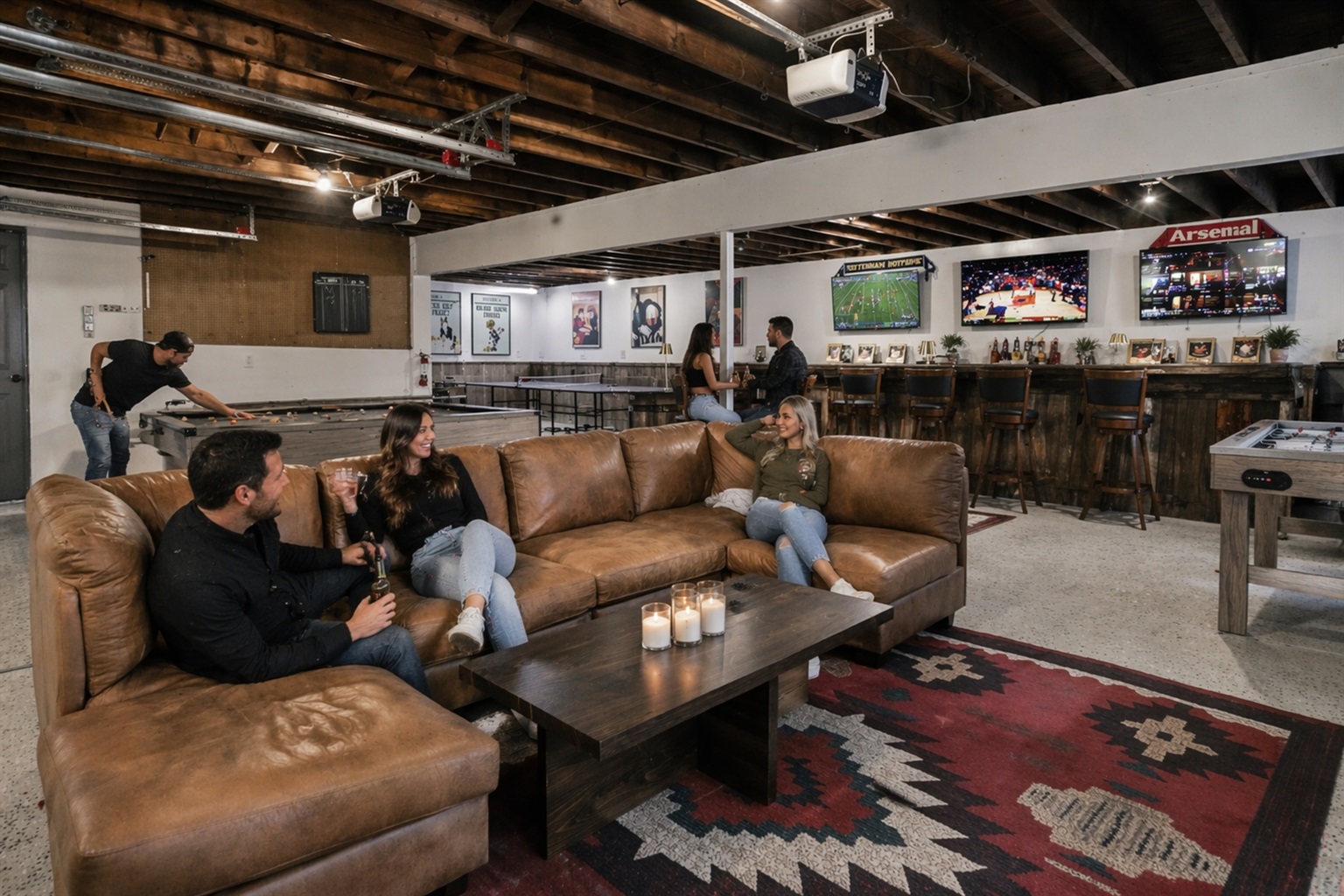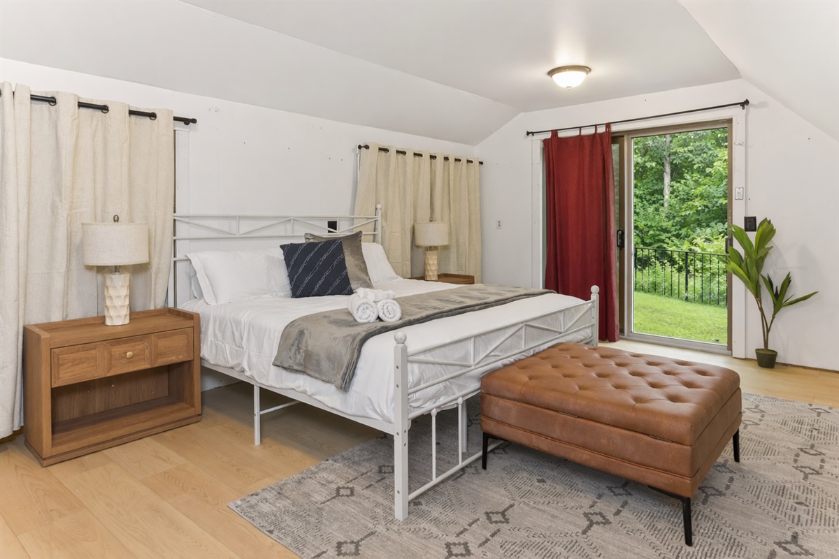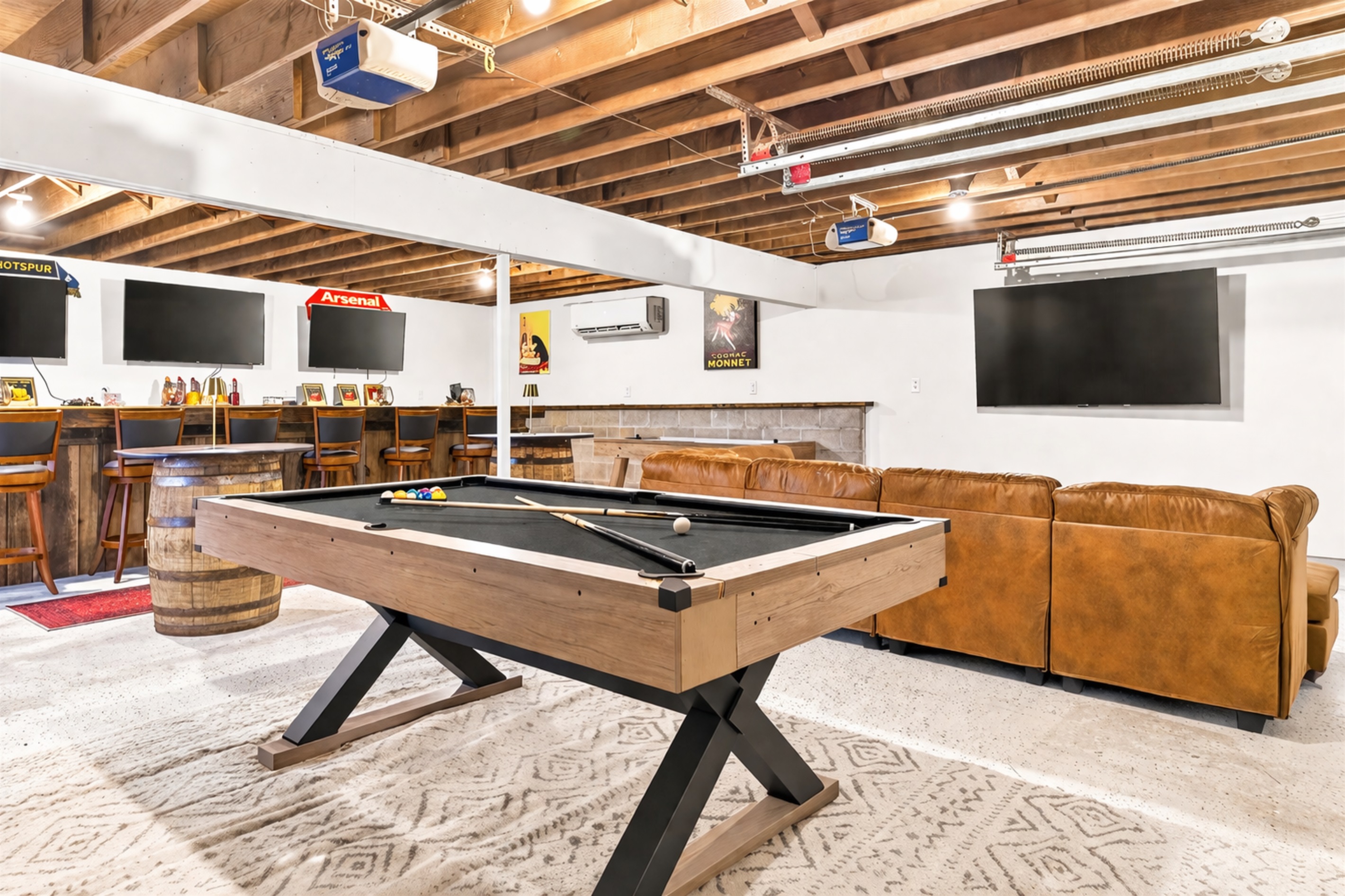 The detached garage adds flexible sleeping and a large entertainment area. Upstairs, there is a king bed in an open layout without a door, along with a twin bed in a shared common space. There is also a full bathroom and an expansive game room with a pool table, ping pong, shuffleboard, foosball, air hockey, a poker table, and a bar. Washer and dryer access is located in the garage.