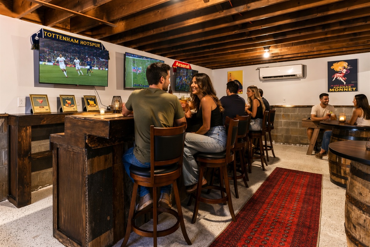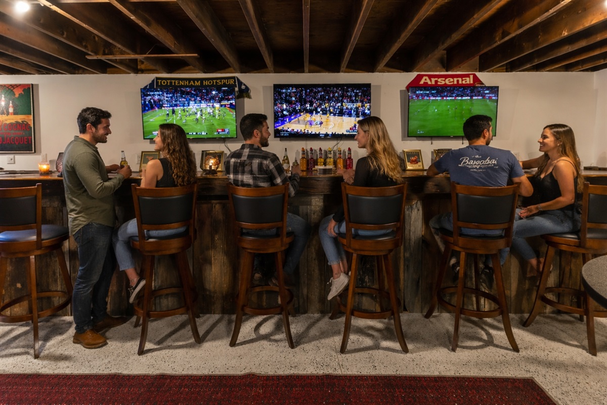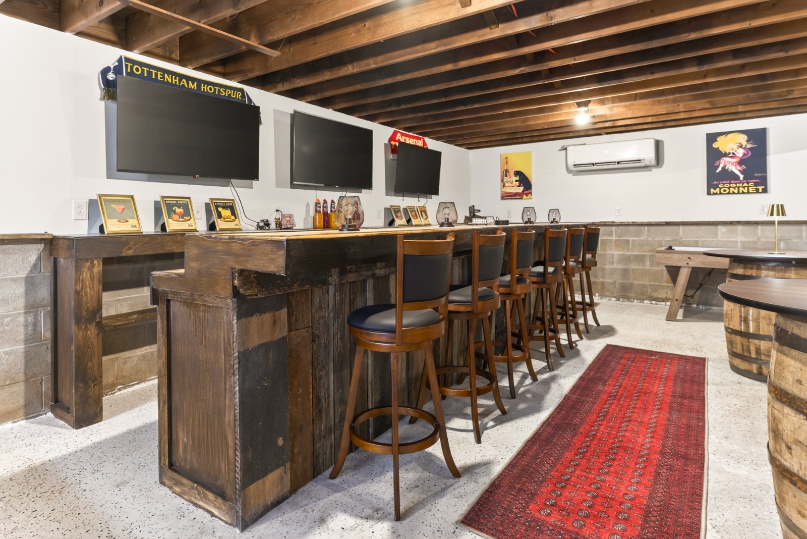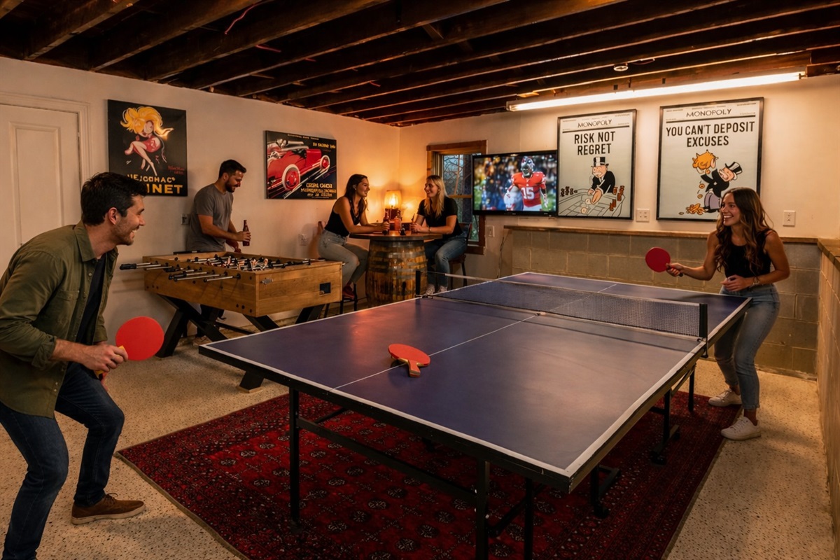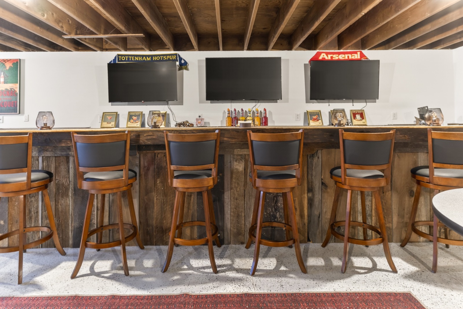 The detached garage adds flexible sleeping and a large entertainment area. Upstairs, there is a king bed in an open layout without a door, along with a twin bed in a shared common space. There is also a full bathroom and an expansive game room with a pool table, ping pong, shuffleboard, foosball, air hockey, a poker table, and a bar. Washer and dryer access is located in the garage.