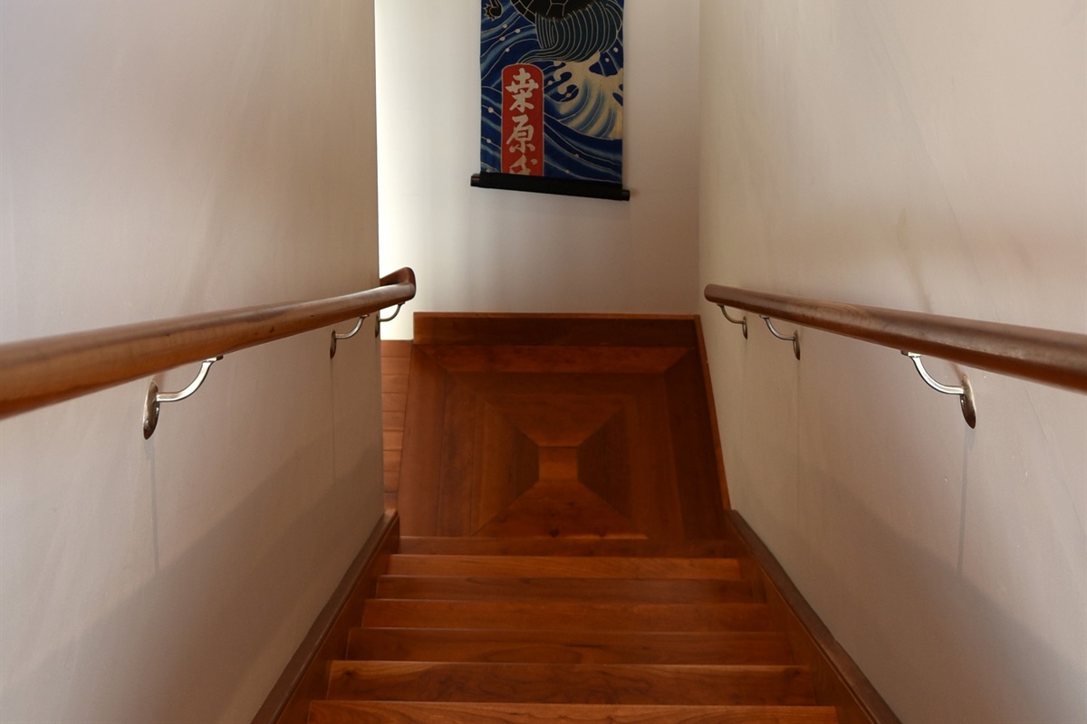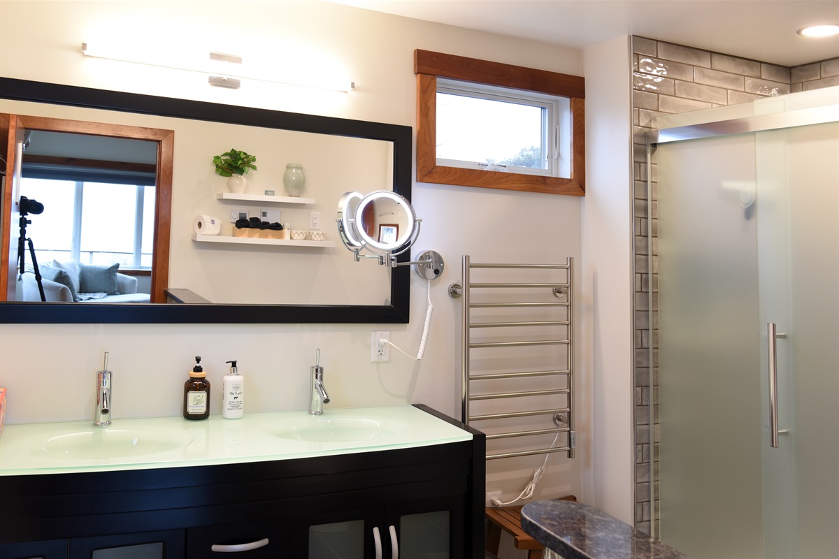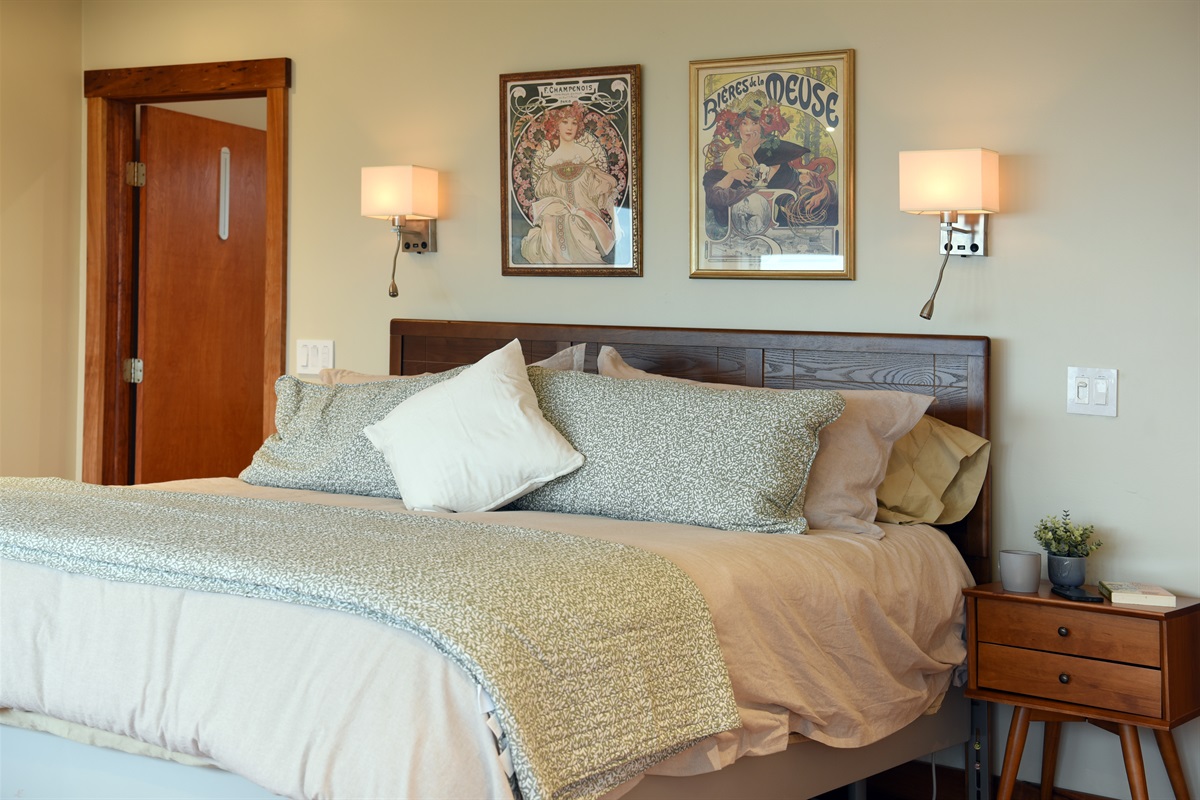 From the living room, stairs lead to the upstairs King master suite, a spacious retreat with breathtaking views, a gas fireplace, a private balcony, and a luxurious ensuite bathroom with a walk-in shower, heated floors, heated towel rack, and bidet. This suite also includes a laundry area and a mini fridge for added convenience.