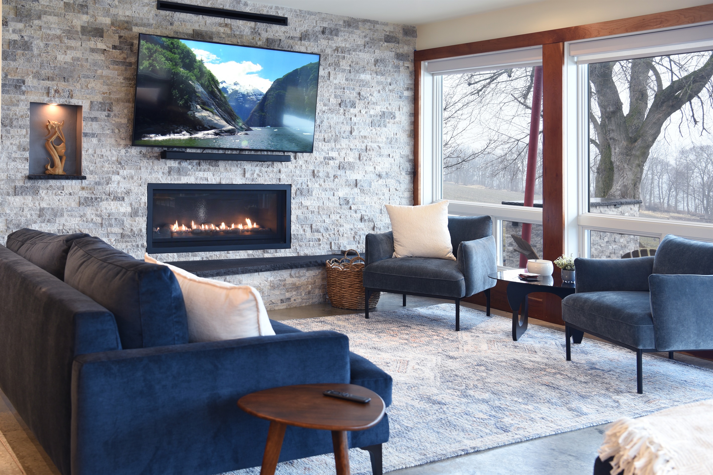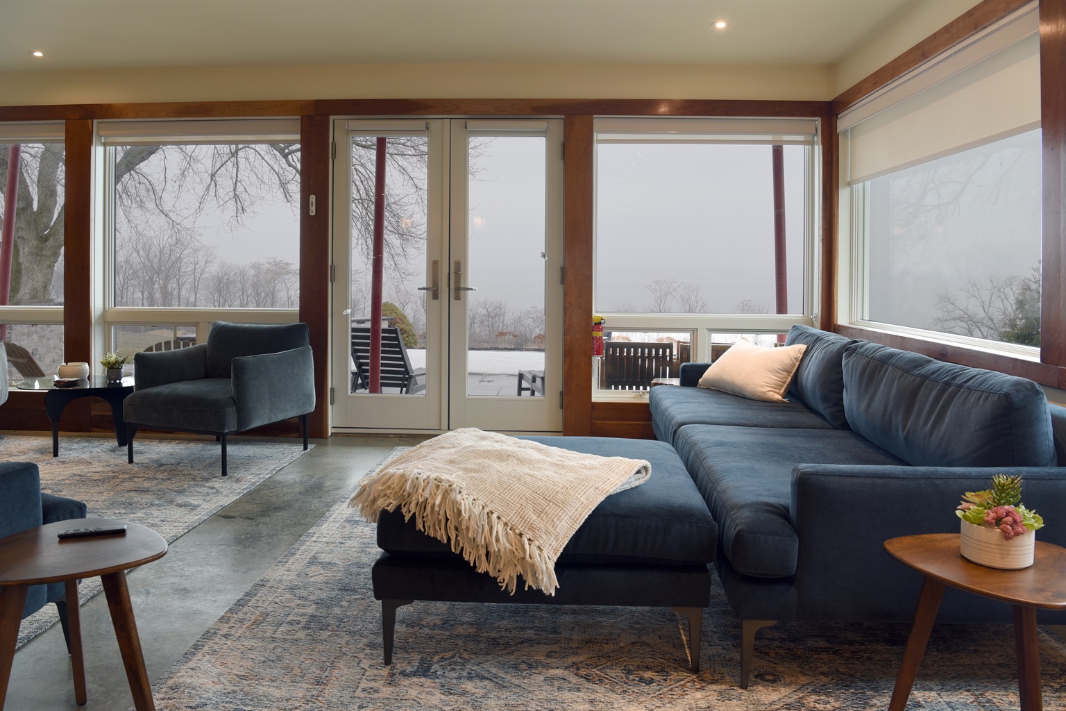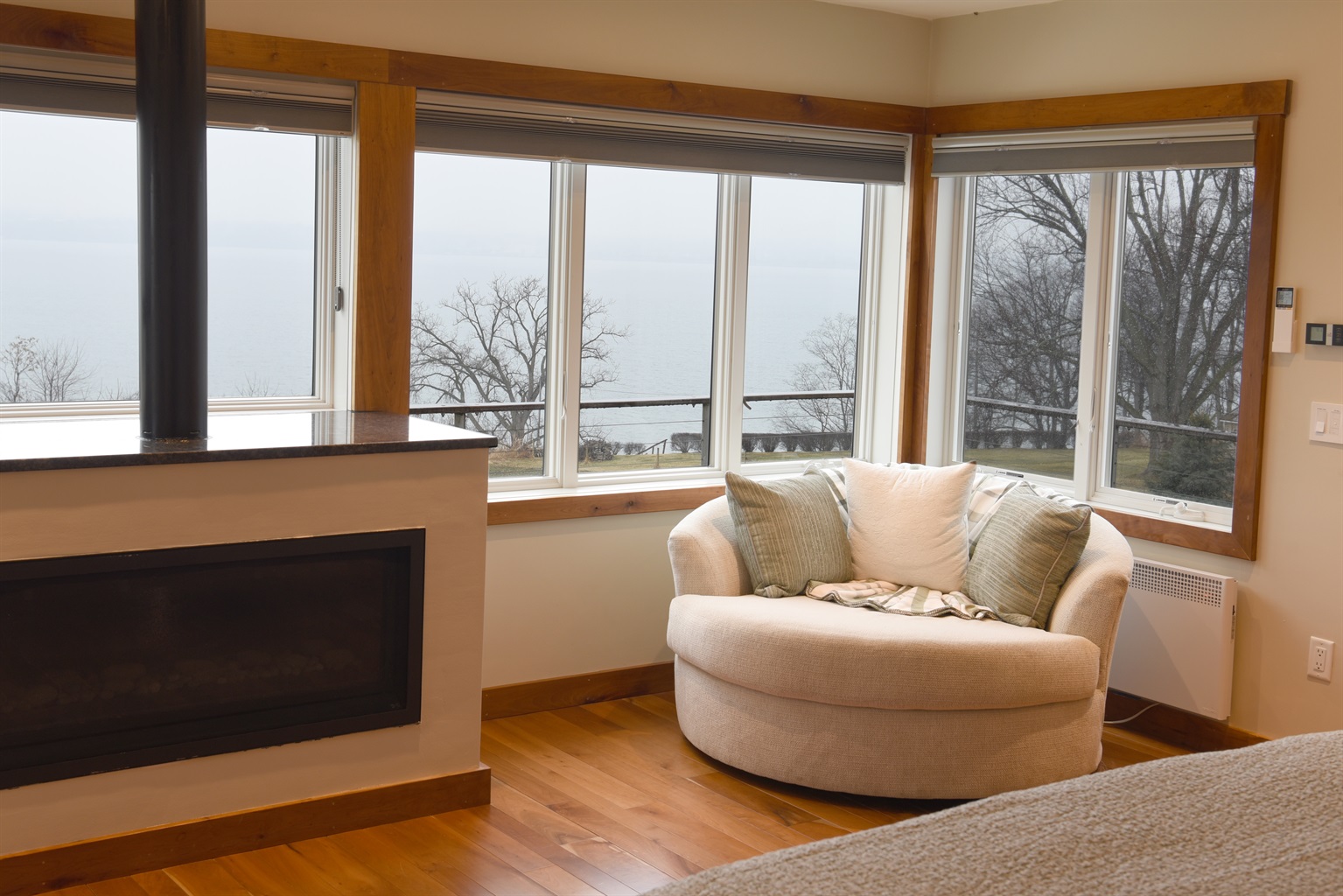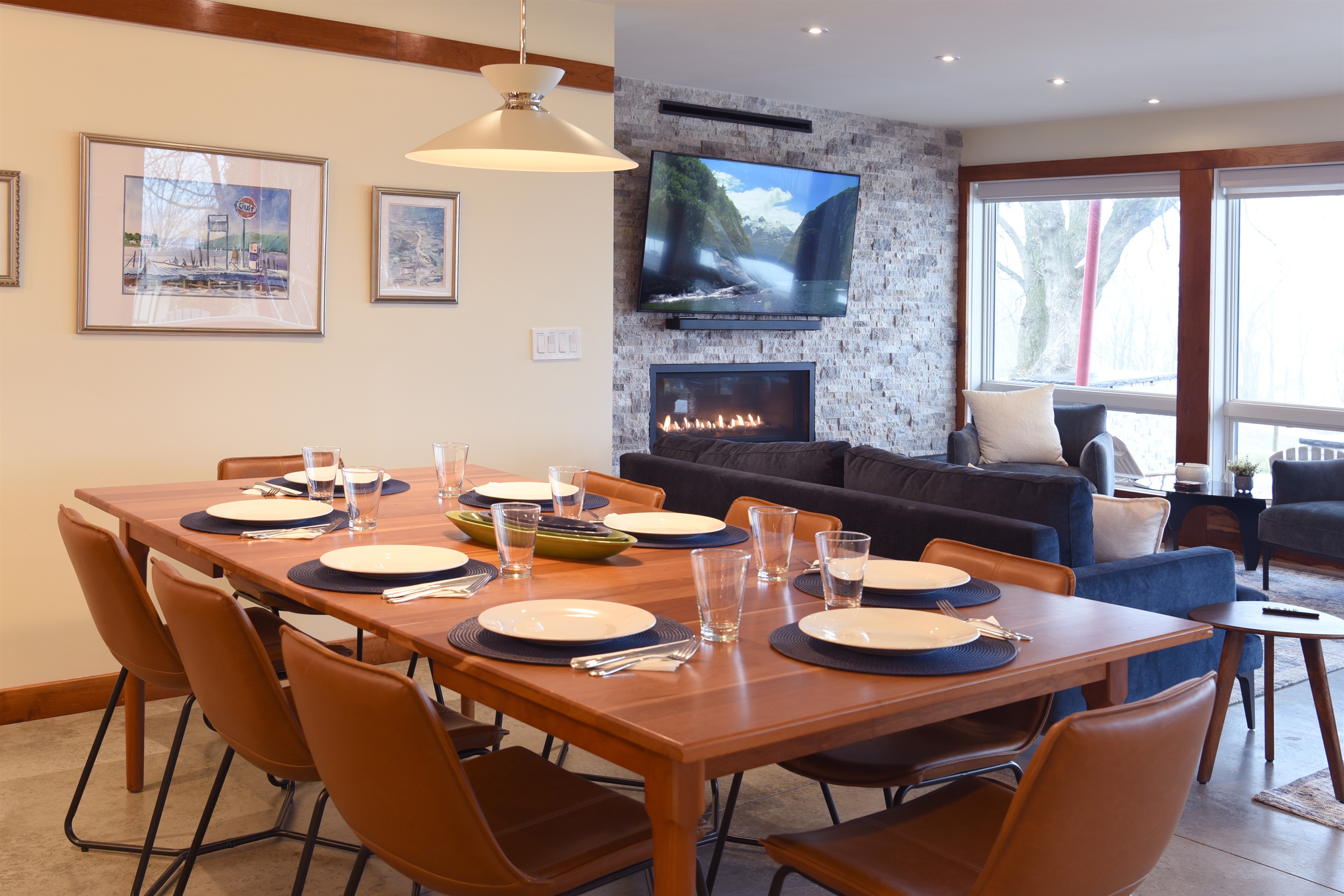 The kitchen flows seamlessly into the open-concept living room, where massive windows frame stunning views of Seneca Lake. Whether you’re cooking a meal, relaxing with a book, or gathering for game night, the space offers comfort, natural light, and a perfect vantage point for the scenery outside.