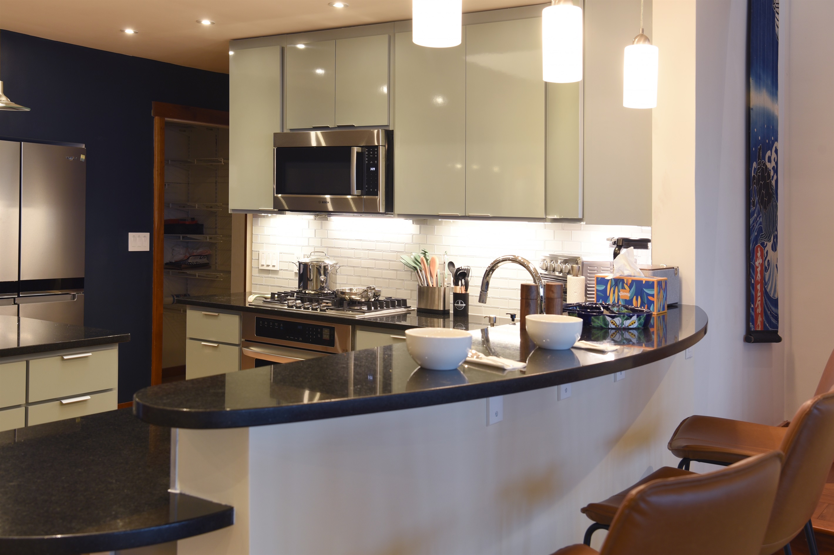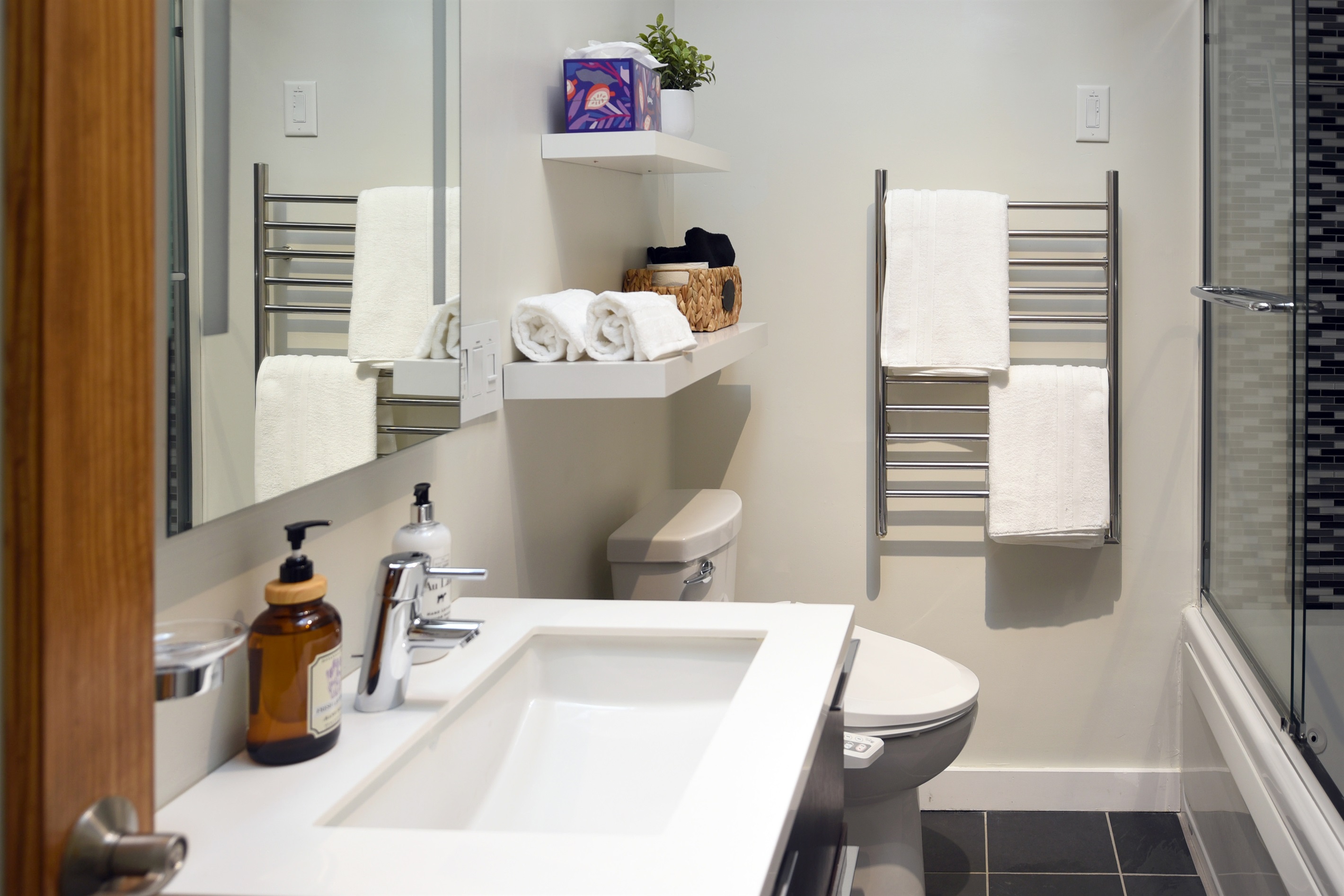 Off the kitchen, a hallway leads to a full bathroom featuring a jetted tub, heated floors, heated towel rack, and bidet. Continuing down the hall are three spacious bedrooms: a bunk room with a Queen bed on the bottom and a Twin on top, a Queen bedroom, and another Queen bedroom with a full ensuite complete with a jetted tub, heated floors, and heated towel rack.