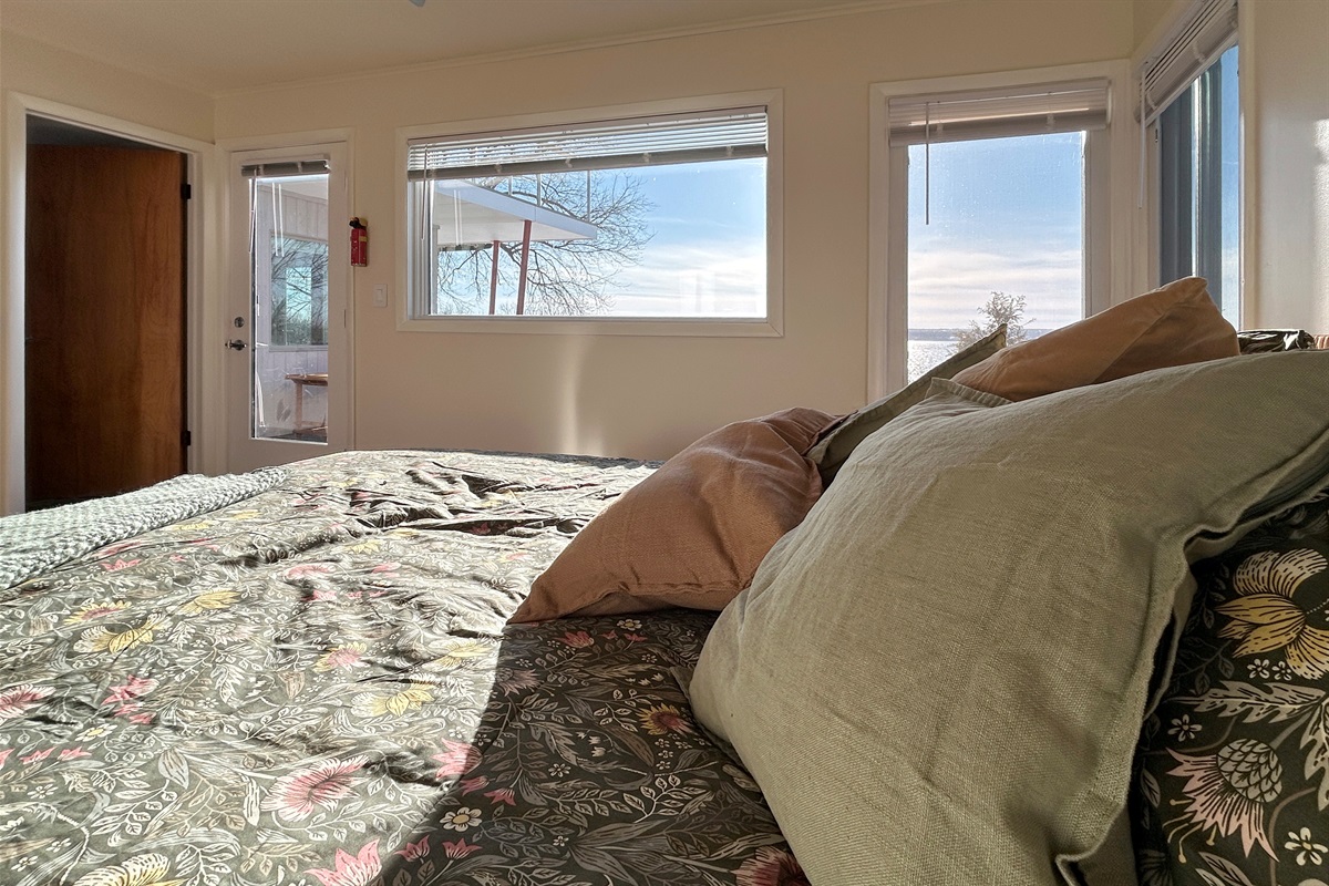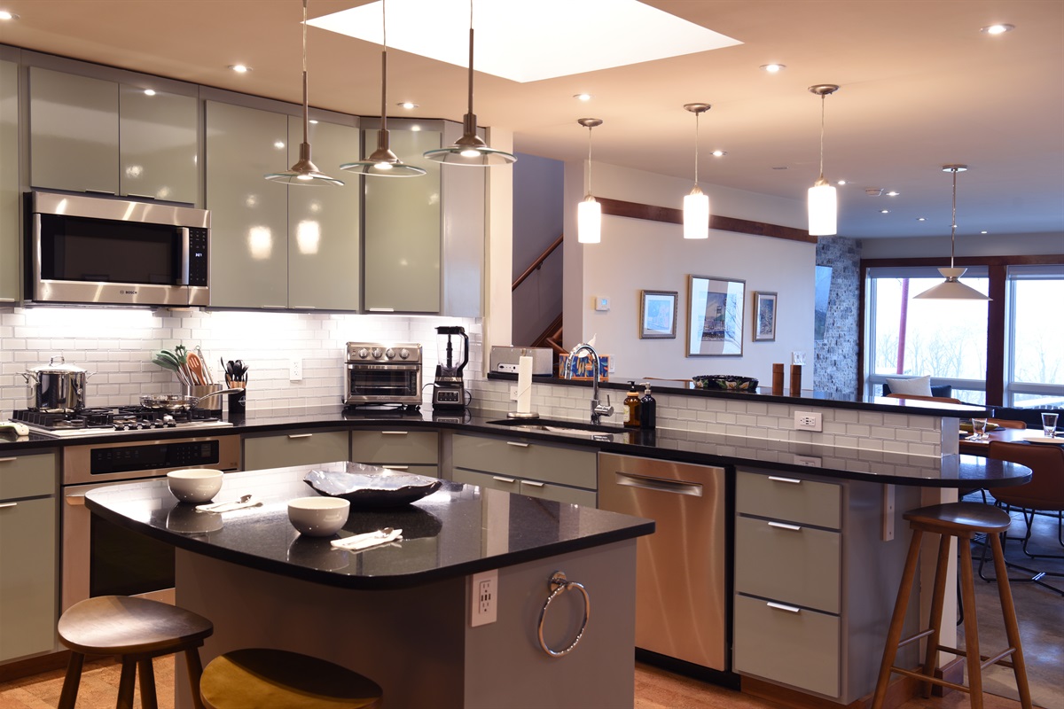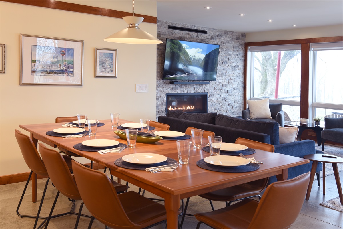 Beyond the foyer, you’ll find a spacious, open-concept living area that seamlessly combines the fully equipped kitchen, dining area, and living room, all with spectacular lake views. Prepare meals while staying connected with your group and enjoy the airy, bright space.